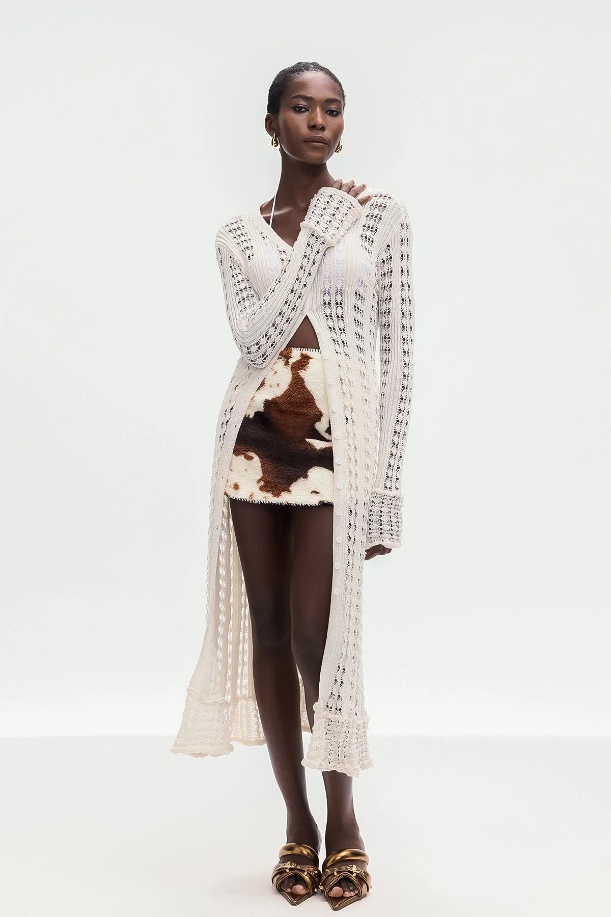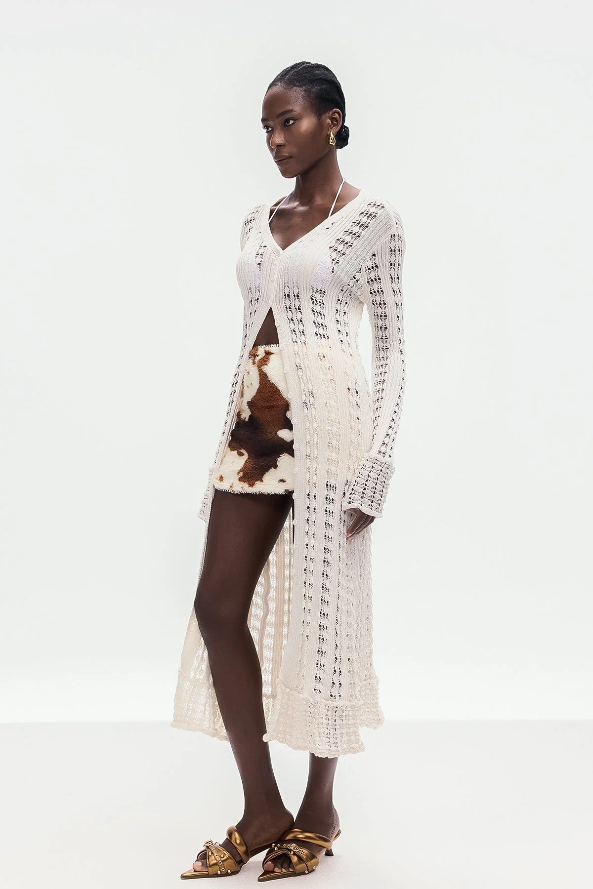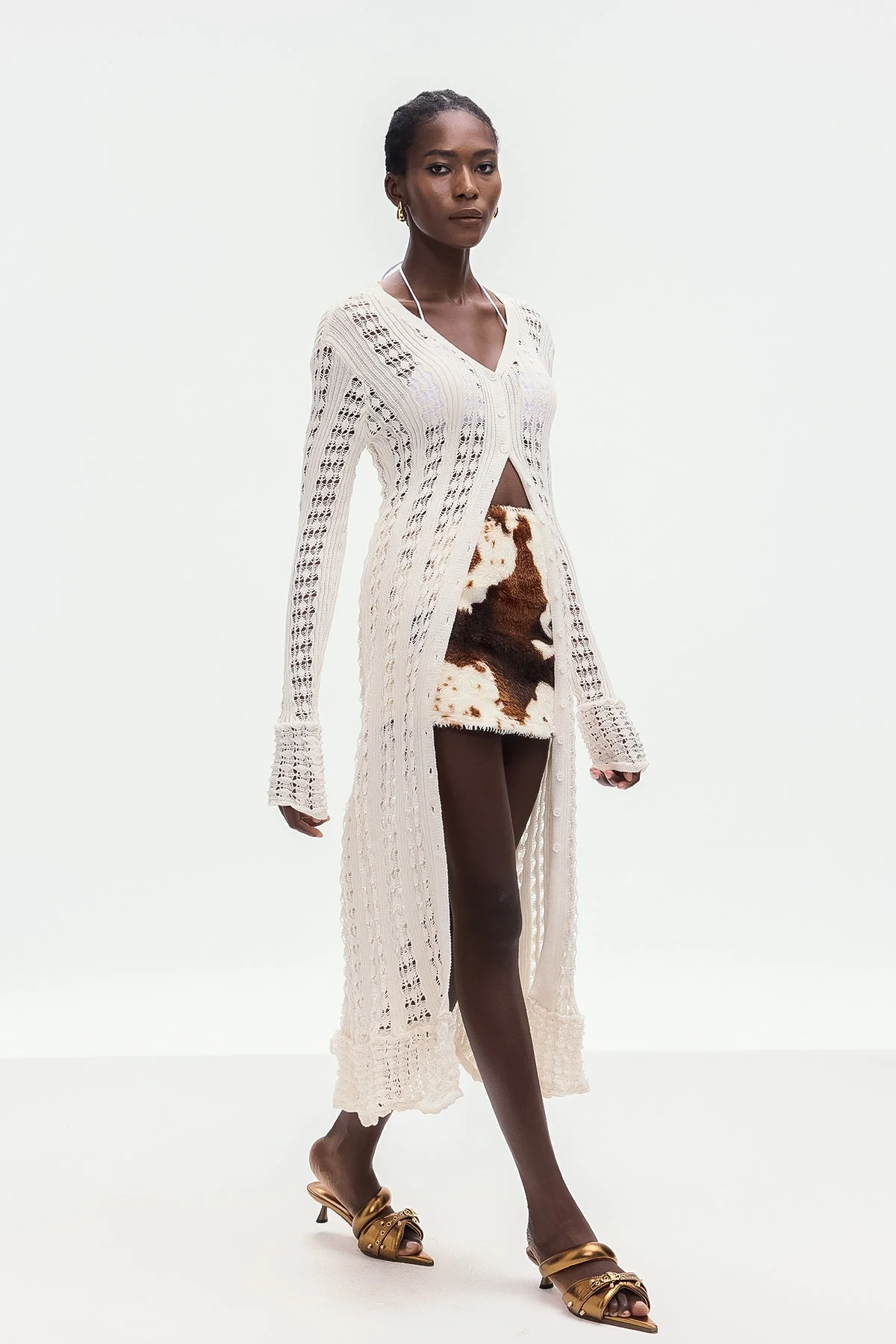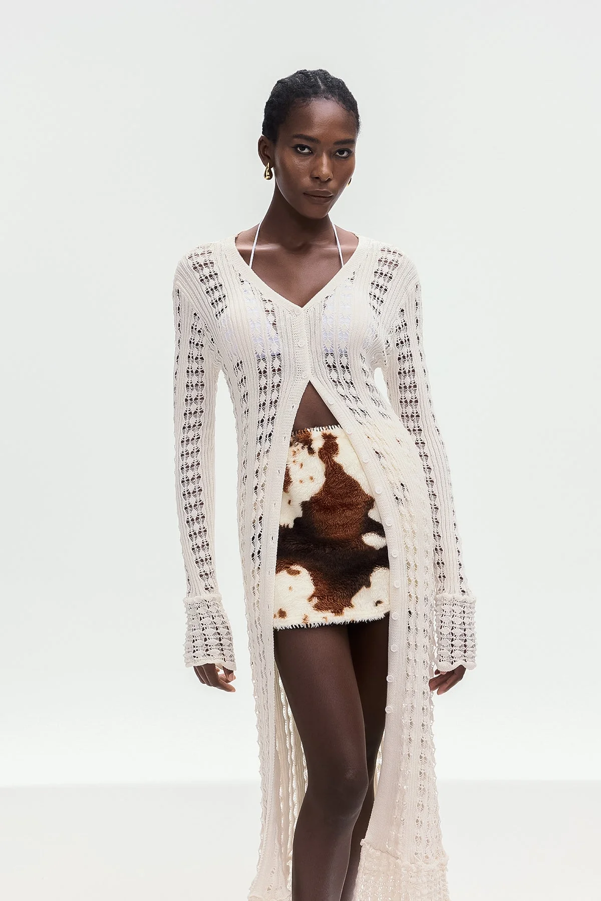 The White Cutout Knit Jacket combines expert craftsmanship with sophisticated design for a modern silhouette. Strategically placed cutouts provide breathability and comfort made from high-quality knit fabric, ensuring flexibility and durability. This jacket is perfect for layering in transitional weather, offering a refined yet edgy wardrobe addition. Experience slight stretch and easy care with a gentle machine wash. Note: Color may vary due to lighting on images.