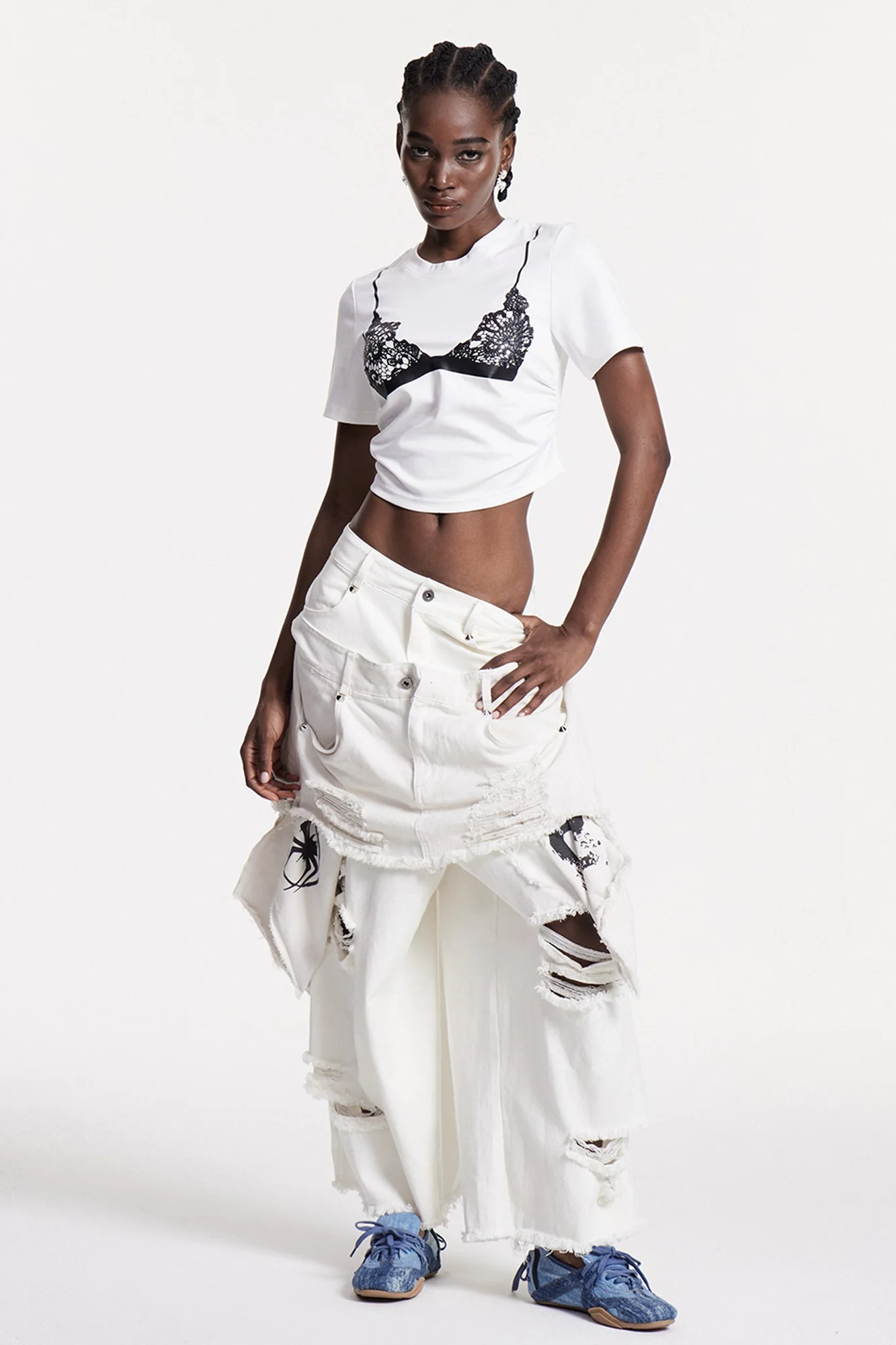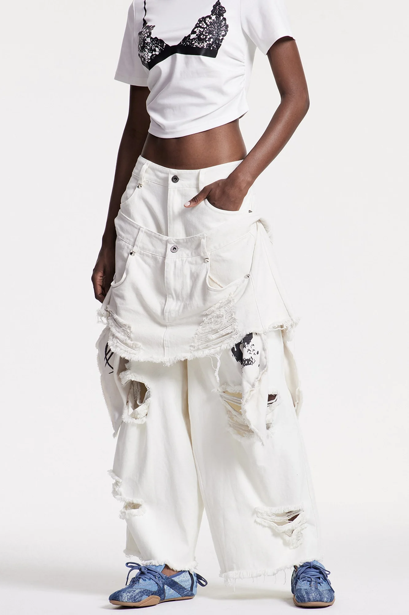 Upgrade your wardrobe with the trendsetting White Deconstruct Ripped Jeans for men . Crafted with high-quality, durable fabric and a tailored fit, these jeans combine classic denim with a modern edge. The deconstructed rips offer a bold, contemporary look ideal for elevating casual outfits. Dont miss out on this stylish and comfortable piece that will set you apart from the crowd. Color variation may occur due to lighting. Machine washable with non-stretch material for easy care and maintenance.