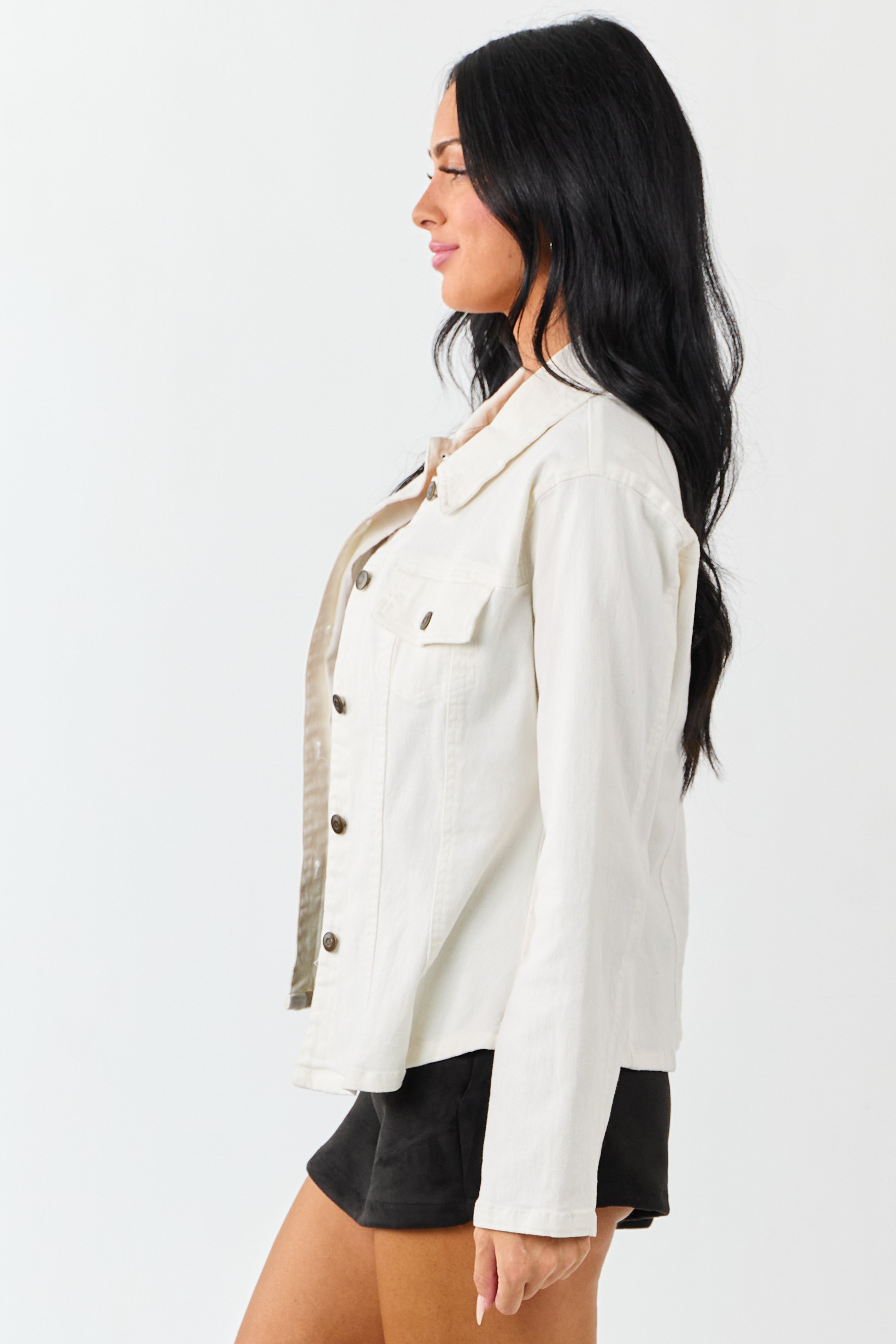 Stay stylish and structured with this versatile White Denim Button Up Jacket. Crafted from a blend of 80.8% Cotton, 12.2% Polyester, and 3% Spandex, this jacket features buttoned chest flap pockets and a collar for a trendy look. Perfect for transitioning between seasons, this jacket is a must-have layering piece that provides both comfort and style. Available in sizes S, M, or L. Model is wearing a size Small.
