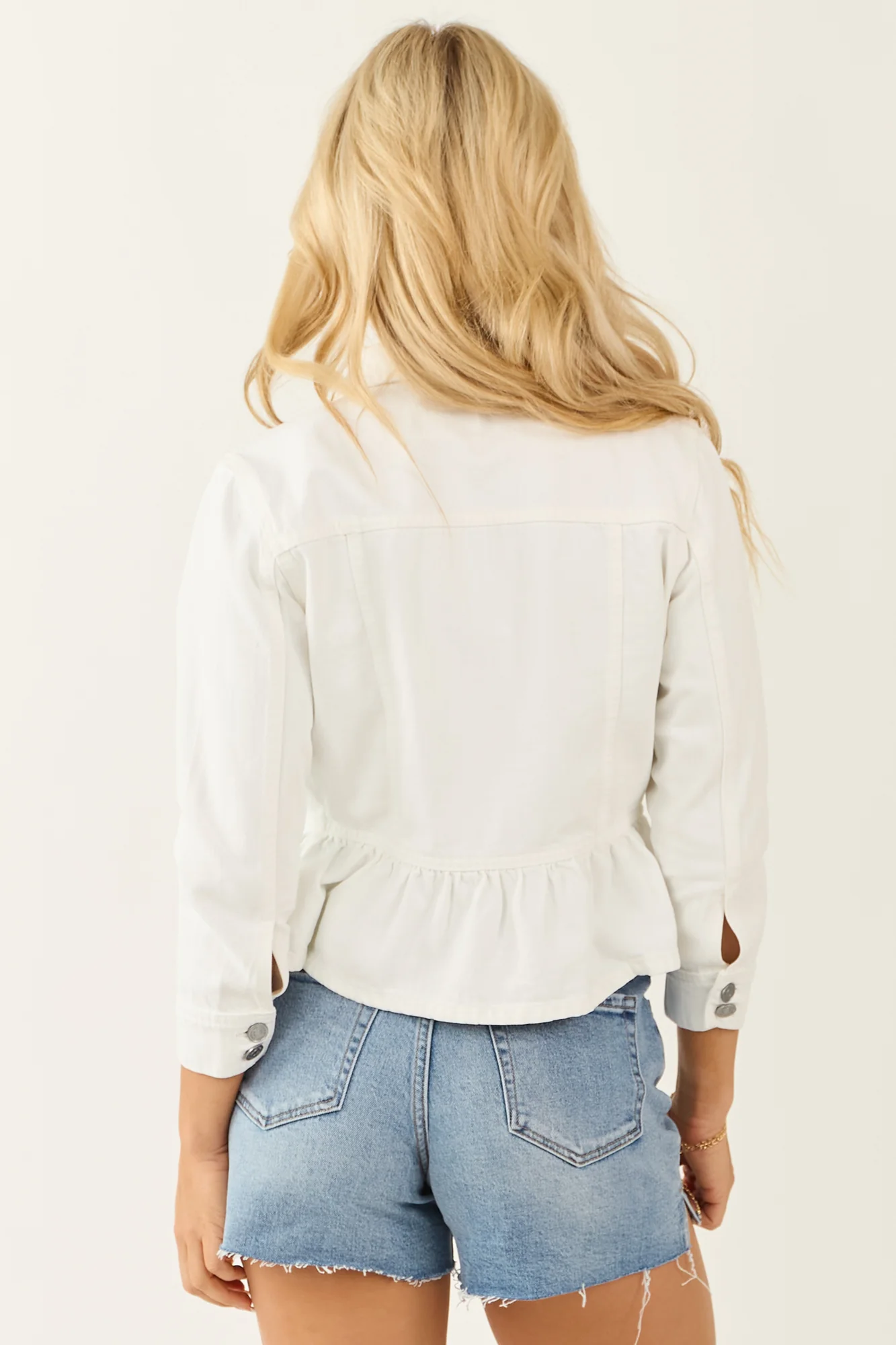 Elevate your denim collection with this stylish White Denim Peplum Jacket made from 100% cotton. Featuring two chest pockets, button-up front, collared neckline, and banded button cuffs. This flattering jacket with long sleeves is perfect for any occasion. Machine wash cold with like colors, tumble dry low. Model is wearing a size Small.