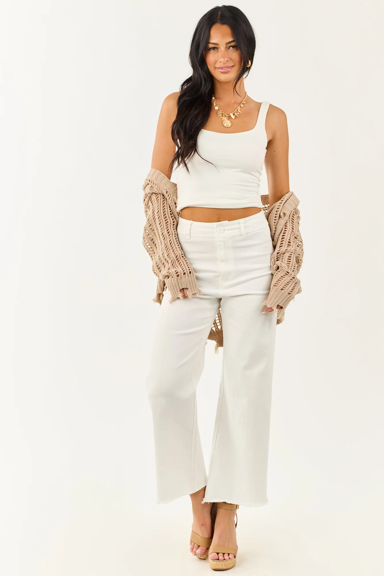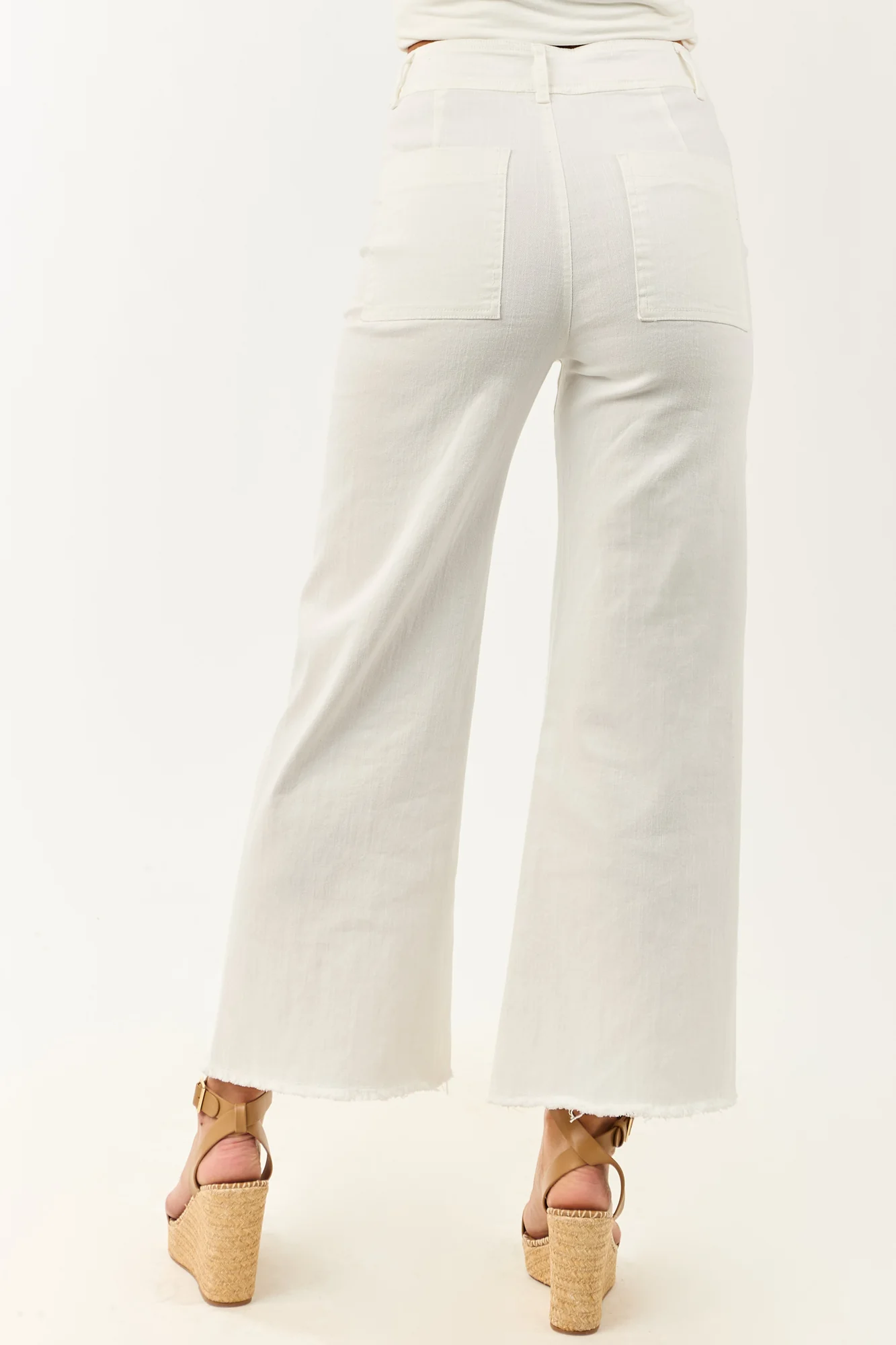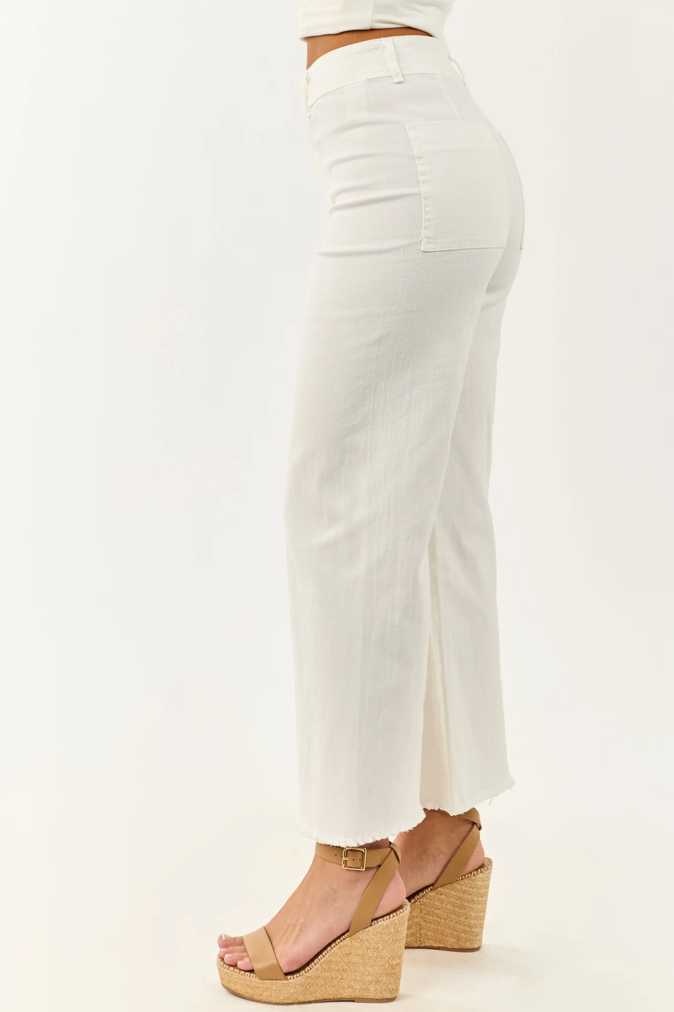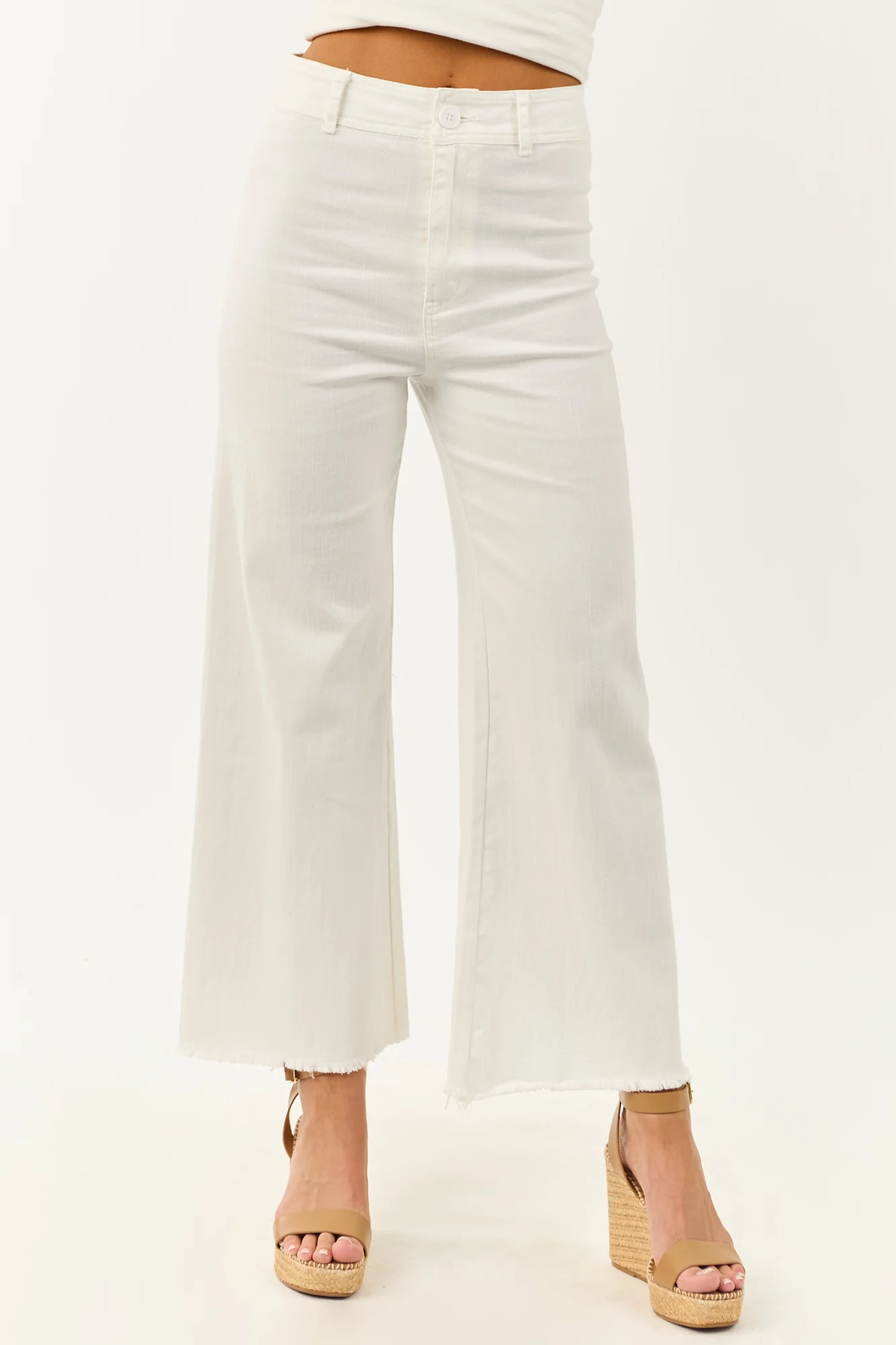 These white denim wide leg pants are perfect for dressing up or down, whether for a coastal getaway or city stroll. Featuring a high-rise design, zipper fly with button closure, belt loops, and frayed hem, these pants offer both style and comfort. Made of 98% cotton and 2% spandex, they provide a stretchy fit. The ankle length inseam of 27″ makes them versatile for various occasions. Available in sizes XS to XL. Models measurements: Size 1, Height 59″, Bust 34″, Waist 26″.