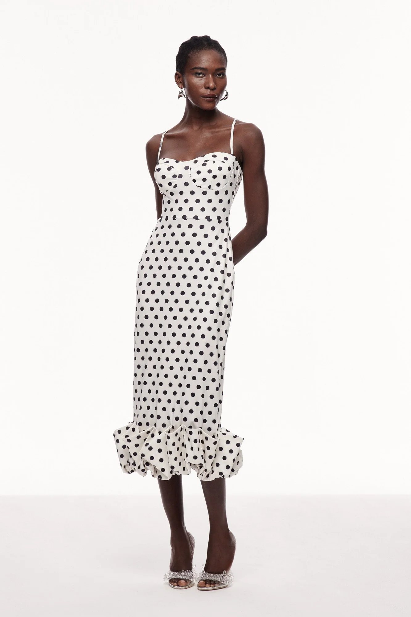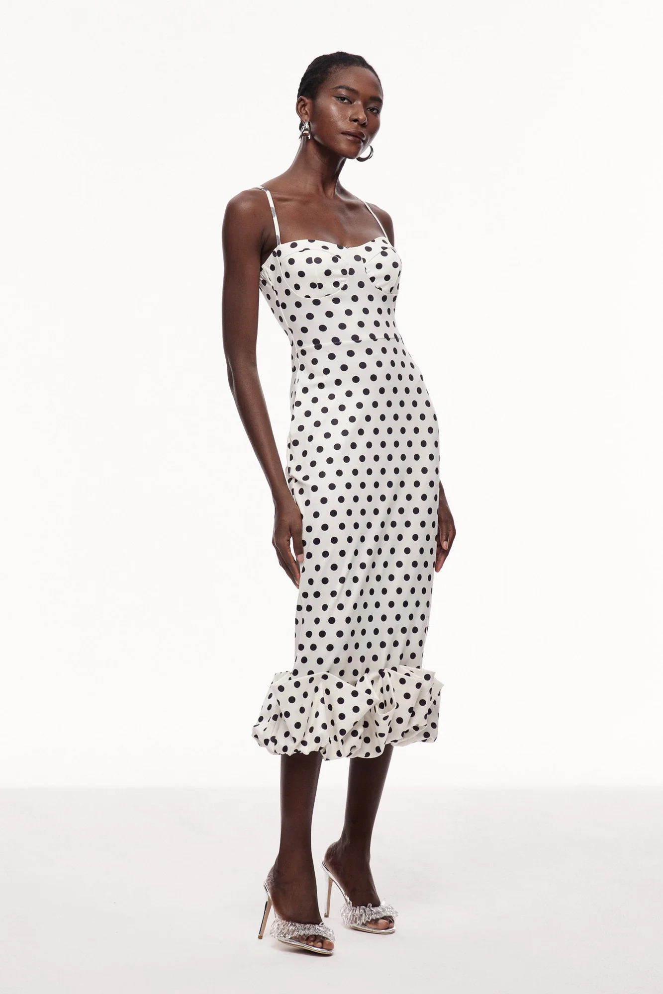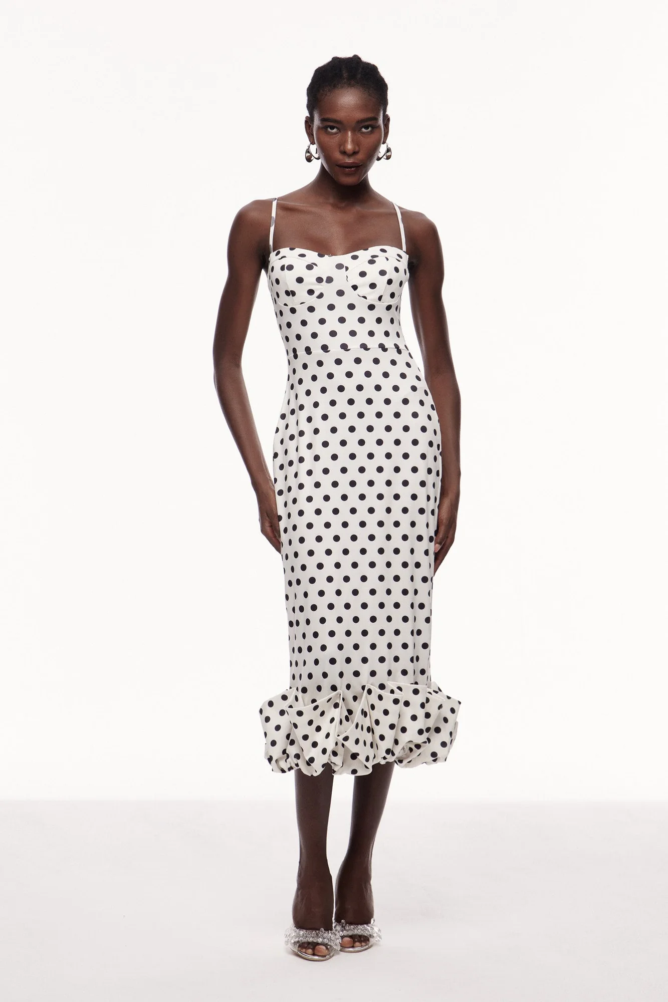 Elevate your style with our White Dot Ruffle Maxi Dress, an elegant fusion of classic charm and contemporary design. This stunning dress features a body-hugging bodycon silhouette that accentuates your curves beautifully. The delicate dot pattern adds a touch of texture, while the ruffle detailing enhances movement and femininity. Perfect for formal occasions or chic nights out, this maxi dress is designed for both comfort and sophistication. Feel confident and stand out in this versatile piece that promises a lasting impression. Stretch Factor: Non-Stretch. Care Instructions: Machine wash gently. Please note that the actual color may vary slightly due to lighting effects in the images.