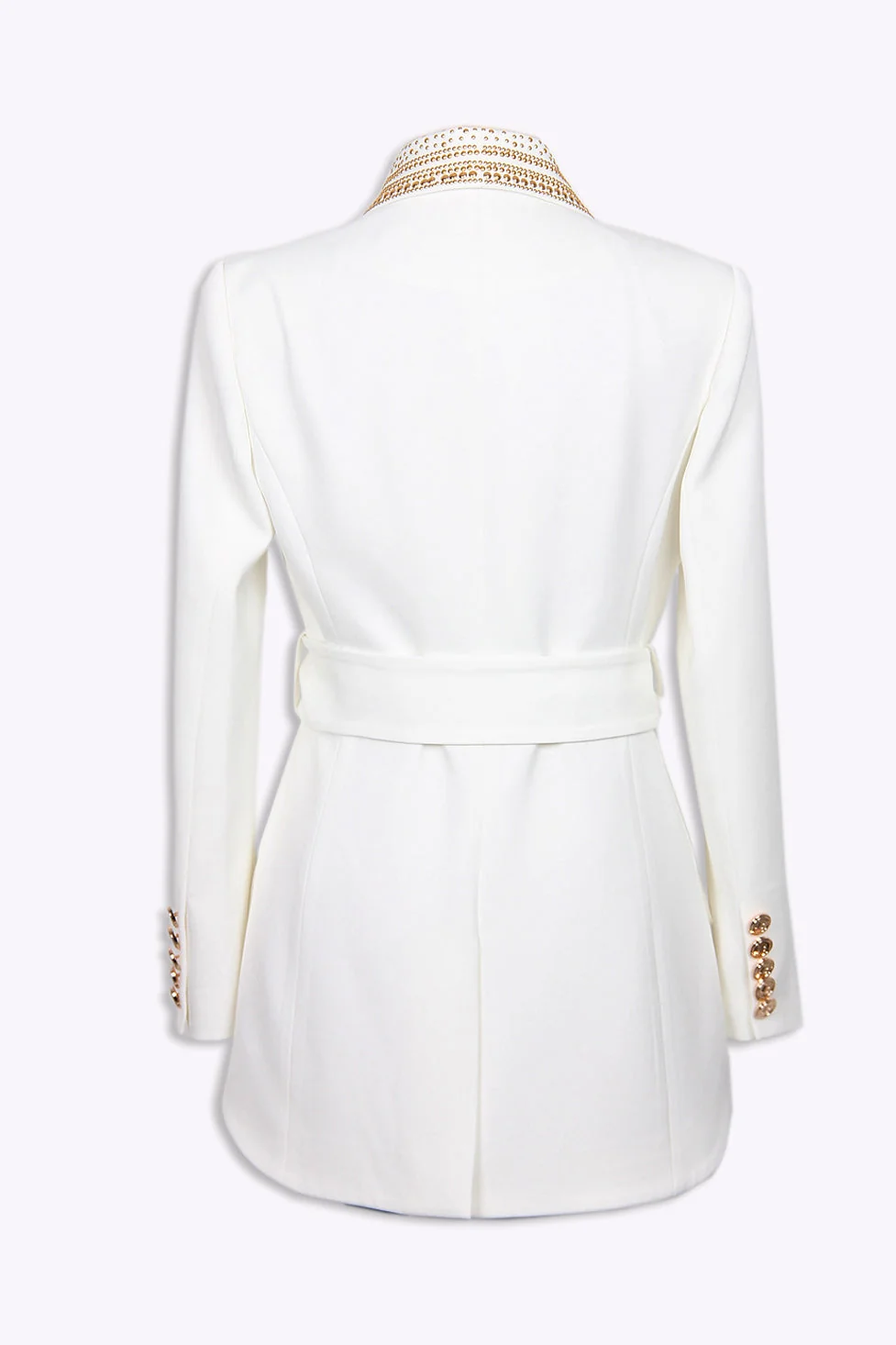 Elevate your wardrobe with the daring Andrea Embellished Belted Blazer in white. This luxurious blazer features exquisite embellishments and a sleek belt, adding a touch of glamour and edge to any outfit. Stand out and take risks with this bold and chic piece that exudes confidence and sophistication. Made from 100% Polyester. This blazer is perfect for both formal and casual occasions. Get ready to make a statement with this versatile wardrobe staple. Material Composition: 100% Polyester Stretch Factor: Non-Stretch Care Instructions: Gentle hand wash cold. Please note that the color of the product may vary due to lighting in images. However, the product images displayed (without the model) are the closest representation of the true color.