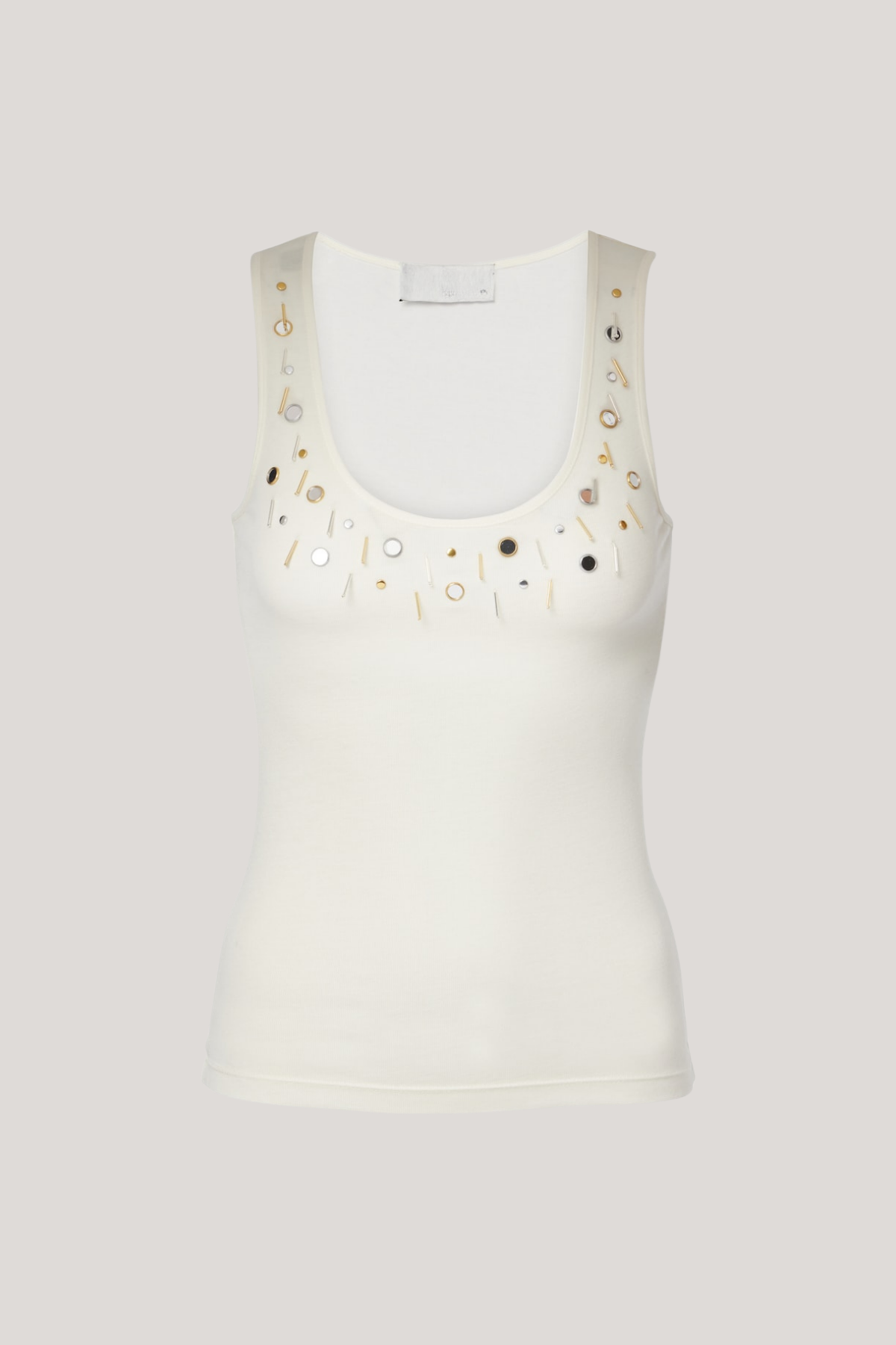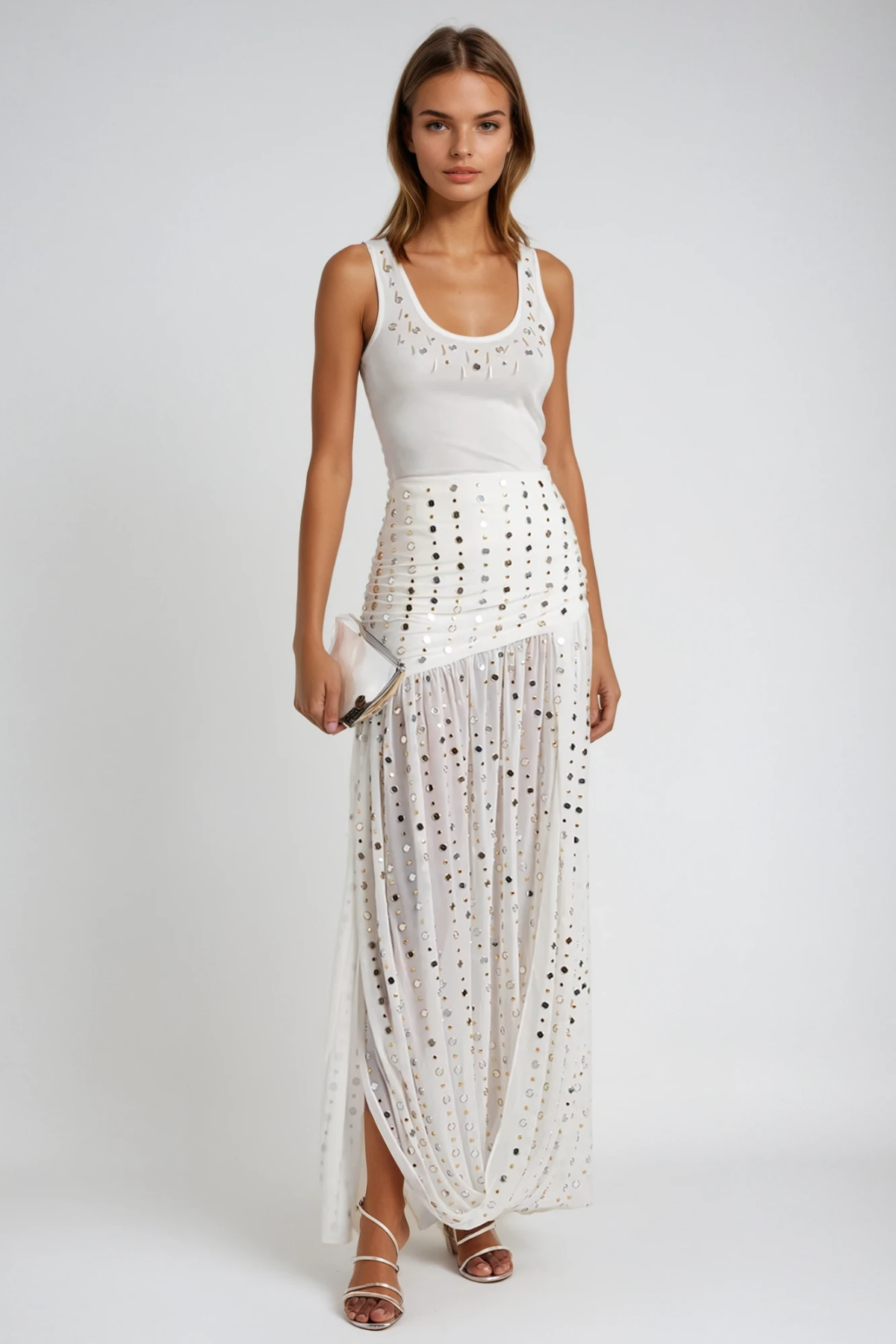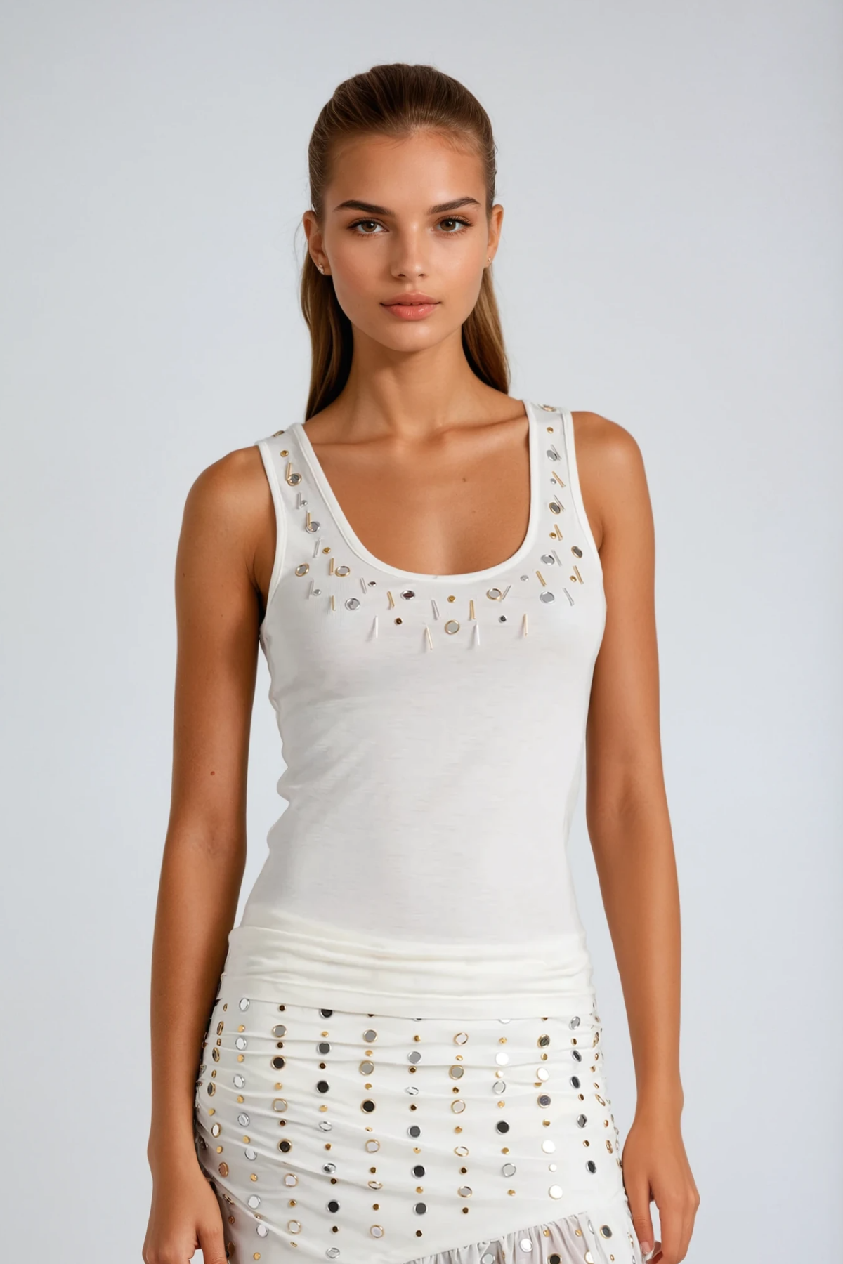 Elevate your wardrobe with our stunning White Embellished Sleeveless Top for women. Expertly crafted with intricate embellishments that shimmer elegantly with every move, this versatile piece transitions effortlessly from day to night. The sleeveless design offers layering options and individual wear versatility. Made with high precision and slight stretch for comfort. Gentle machine wash recommended. Color may vary in different lighting conditions. Enhance your style with this chic essential. Suitable for various occasions. Available in sizes S, M, L.