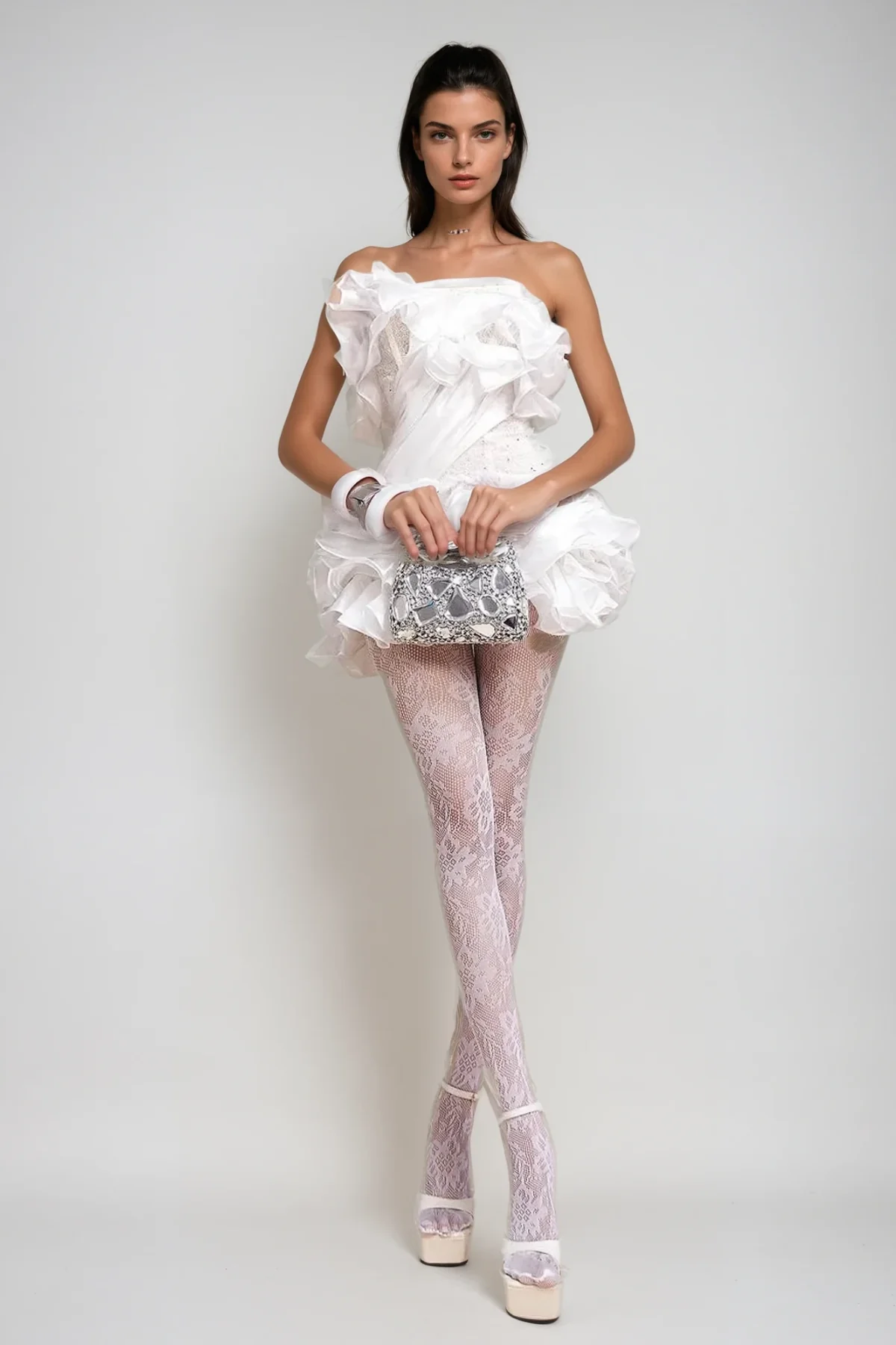 Elevate your style with the White Embroidered Ruffle Corset Mini Dress . Crafted with intricate embroidery, layered ruffles, and a tailored corset silhouette that accentuates your waist. This non-stretch dress exudes elegance and femininity, perfect for sophisticated events and evening occasions. Feel confident and chic in this stunning piece. Ideal for those who appreciate a refined yet bold fashion statement. Color may vary in images due to lighting conditions.