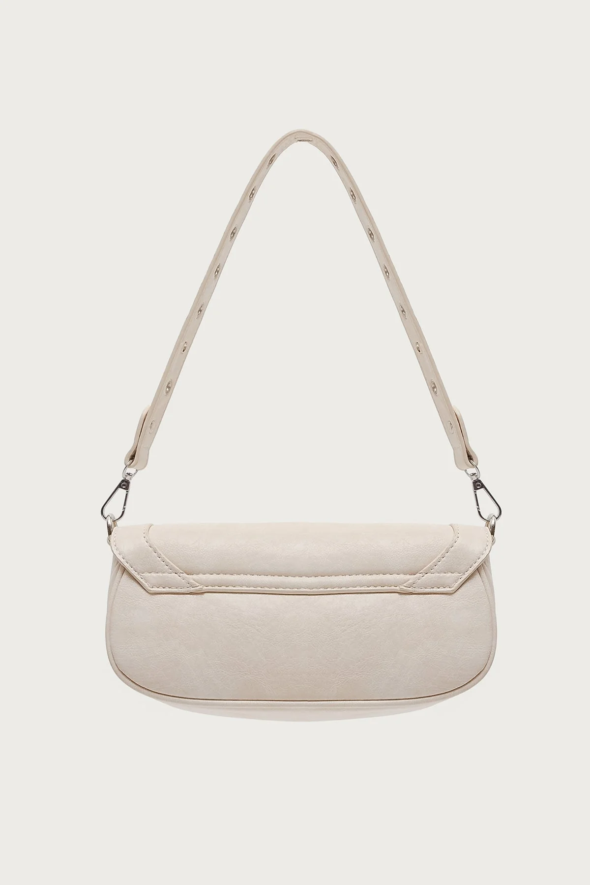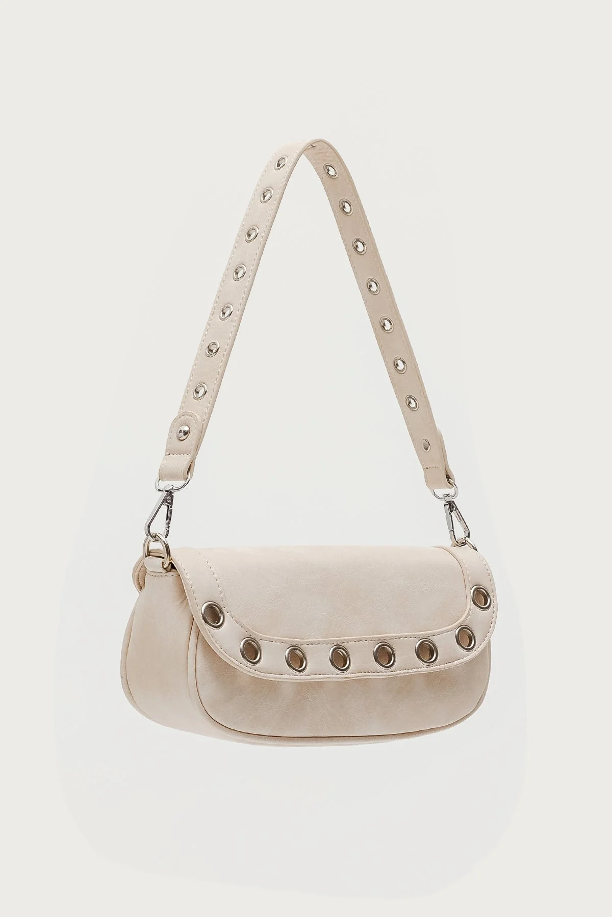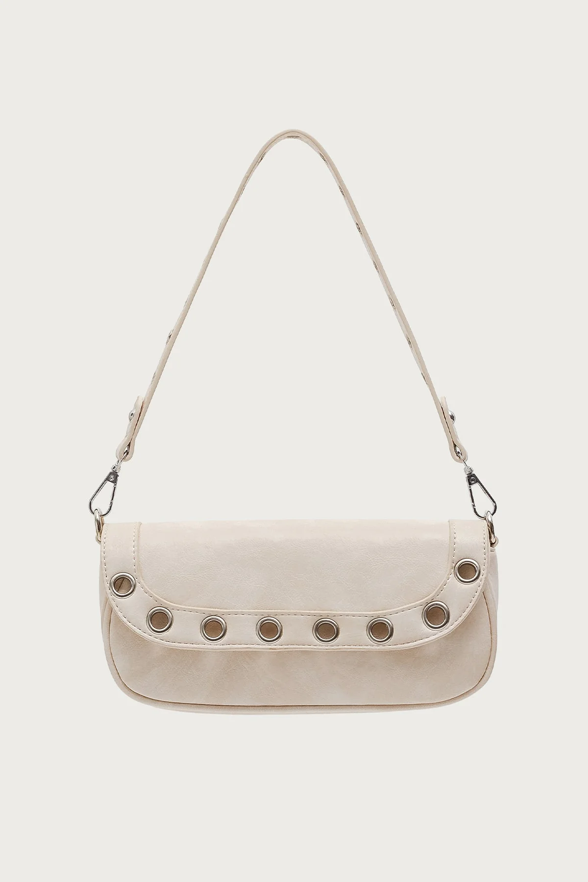 Discover the elegance of our White Faux Leather Grommet Bag. Crafted with intricate grommet detailing from premium polyurethane, this crossbody purse boasts dimensions of Width: 3.9in, Height: 9.3in, Depth: 2.3in. For easy maintenance, simply hand wash to keep it looking pristine and chic.