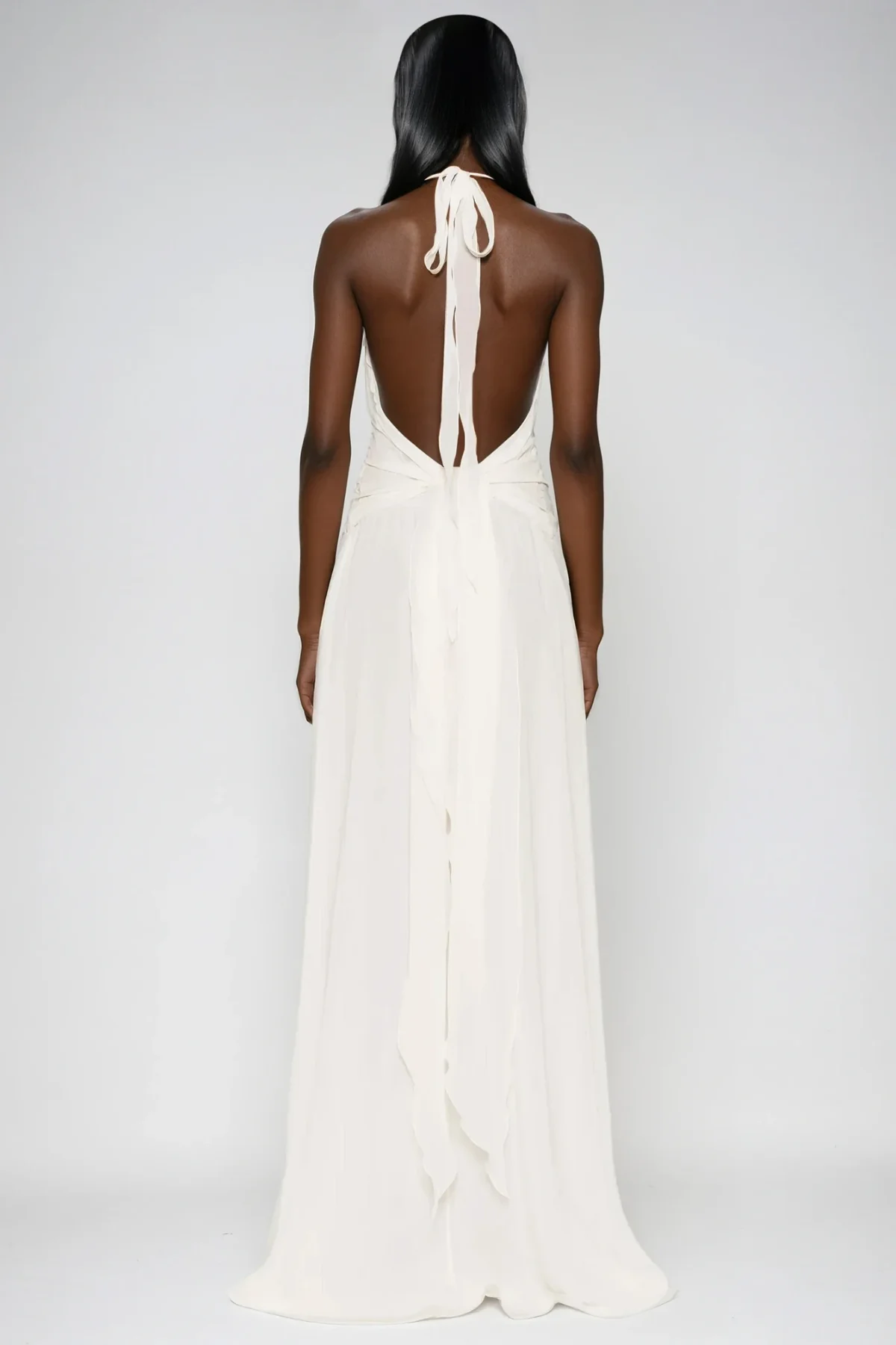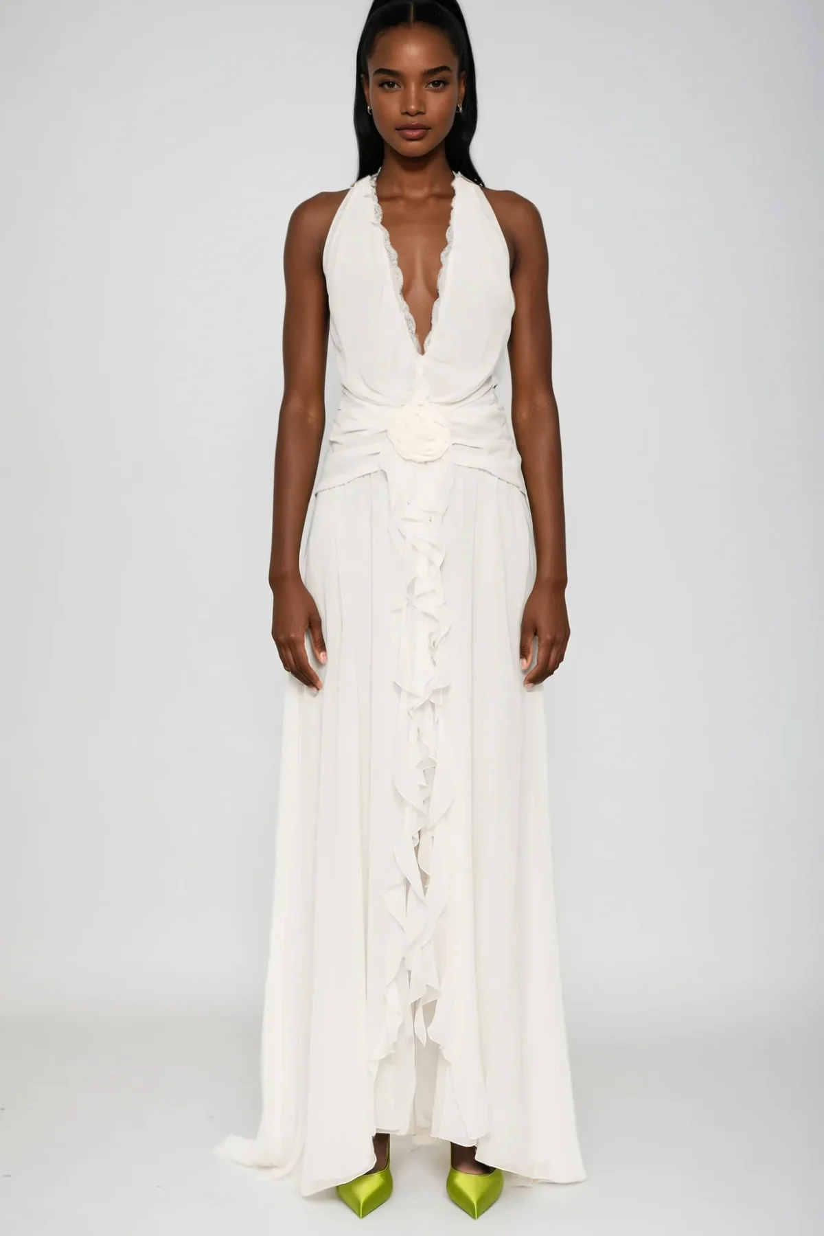 Elevate your style with this elegant White Floral Halter Neck Mesh Maxi Dress featuring a romantic floral design and a delicate halter neck for a touch of charm. Crafted from high-quality mesh fabric with 50% Polyester and 50% Cotton blend, this dress offers a slight stretch and a comfortable, breathable fit. Perfect for any summer occasion, this dress exudes sophistication and timeless beauty. Gentle machine wash recommended. Please note that color may vary due to lighting effects on images.