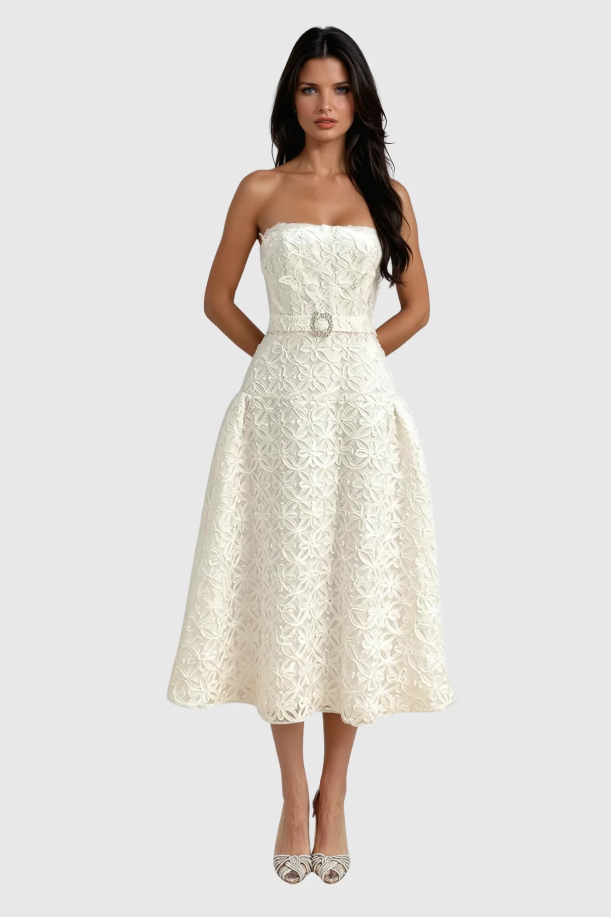 The White Floral Lace Strapless Midi Dress is an epitome of elegance and expert craftsmanship. This midi dress features delicate floral lace patterns for a refined silhouette, perfect for formal occasions. With a tailored fit that enhances your figure, it offers comfort all day or night. Elevate your wardrobe with timeless style and subtle texture. Ideal for those seeking sophistication and grace. Stretch Factor: Non-Stretch. Care: Gentle machine wash. Note: Color may vary due to lighting in images.