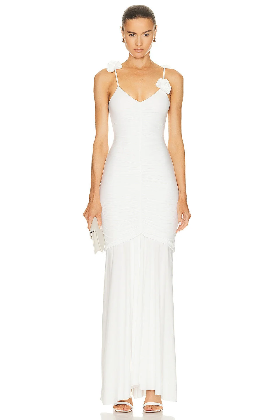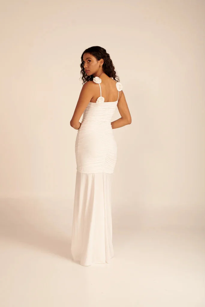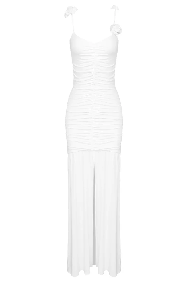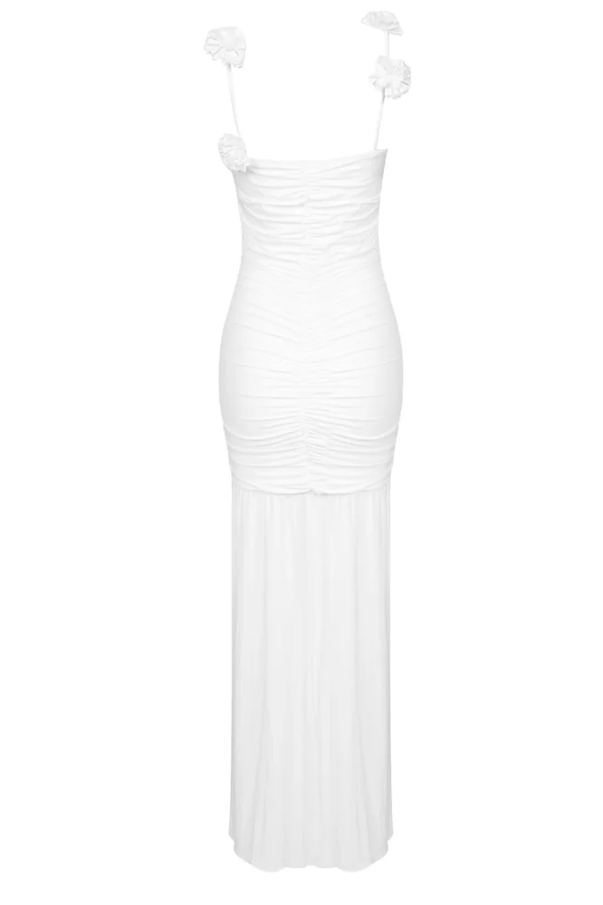 Elevate your wardrobe with our stunning White Floral Maxi Dress featuring rosette appliqués on the shoulder straps. Made of 78% polyamide and 22% elastane, this lightweight jersey dress is partially lined and boasts a ruched front seam for added charm. Enjoy the convenience of pull-on styling combined with a touch of feminine flair.