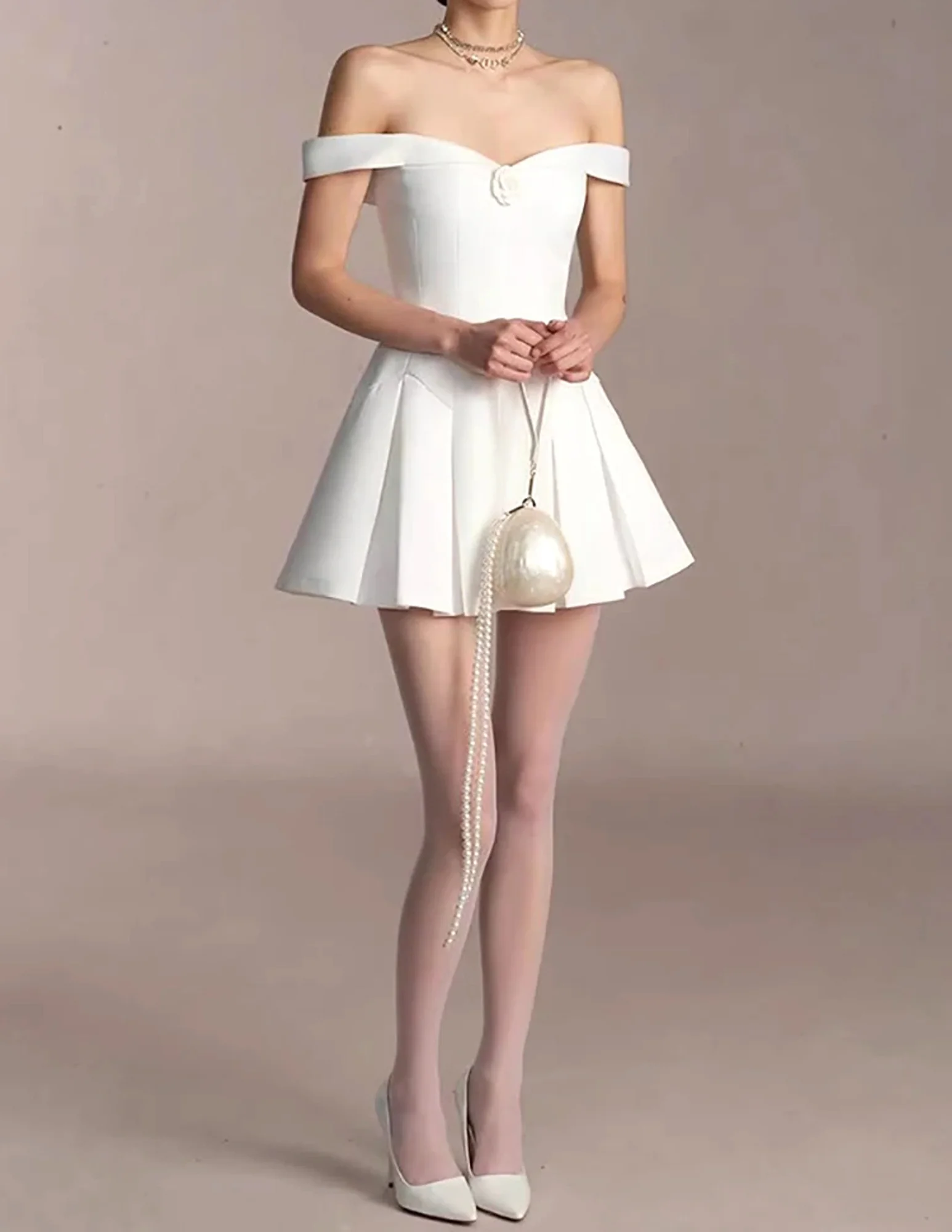 This elegant white dress features an off-shoulder design with floral details. It has a flattering A-line silhouette with pleats and is crafted from a blend of Polyester and Cotton for a chic look. The dress includes a YKK zipper for durability. Care instructions: Gentle Dry Clean Only. Please note that the color may slightly vary due to lighting. Enhance your wardrobe with this stylish and versatile piece from Night Novas.