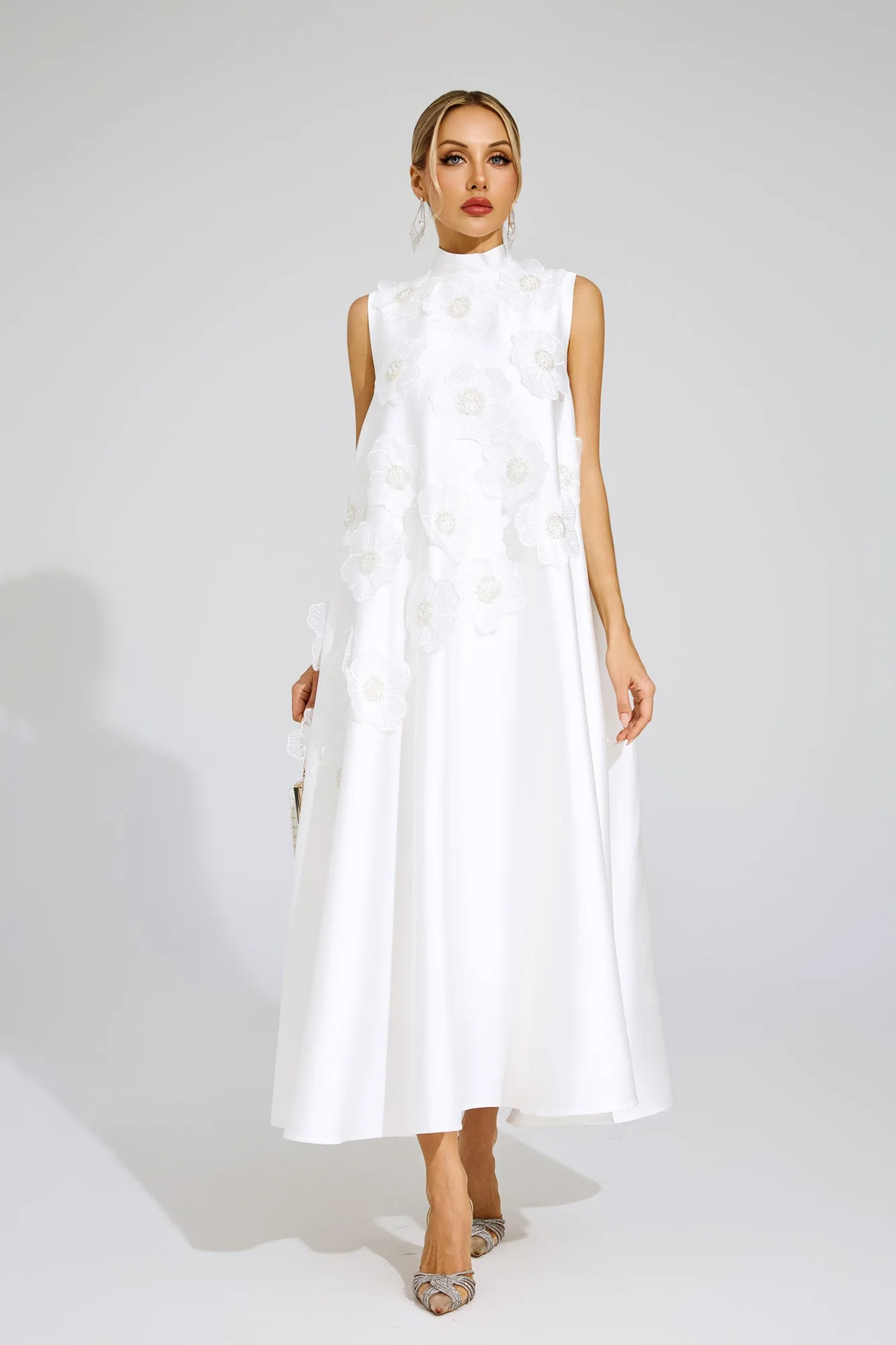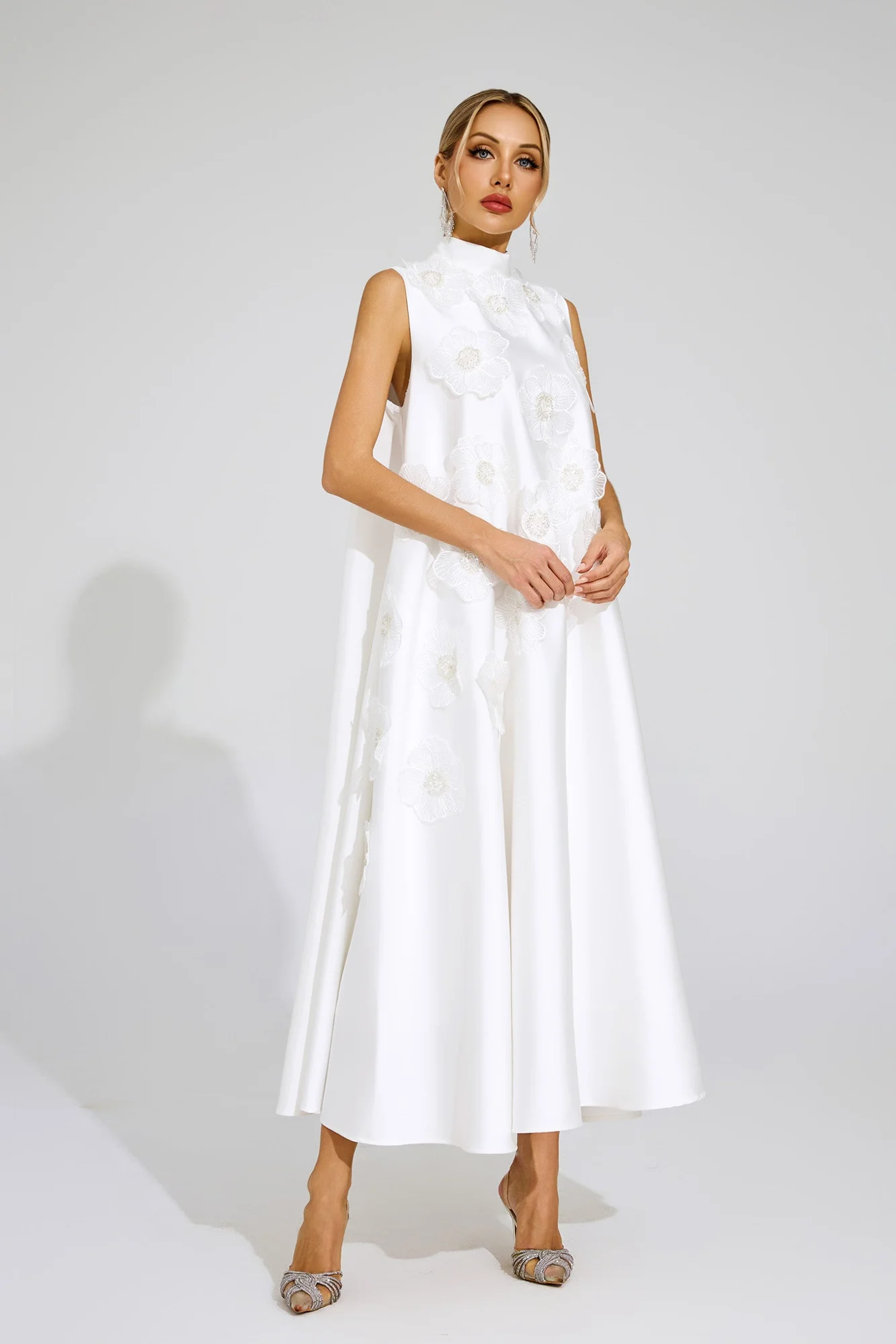 The White Floral Sleeveless Dress features exquisite three-dimensional floral appliqué and an elegant asymmetrical design. This sophisticated and long summer dress combines premium craftsmanship with a refined and fashionable silhouette for a statement-worthy look. Dress Length is approximately 131cm. Made of high-quality polyester. Recommended for gentle dry clean only. Available in sizes S, M, L, and XL. Model height is 5 ft 7. Color may vary due to lighting in images. Refer to the size chart for the best fit; do not size up or down for this stylish dress.