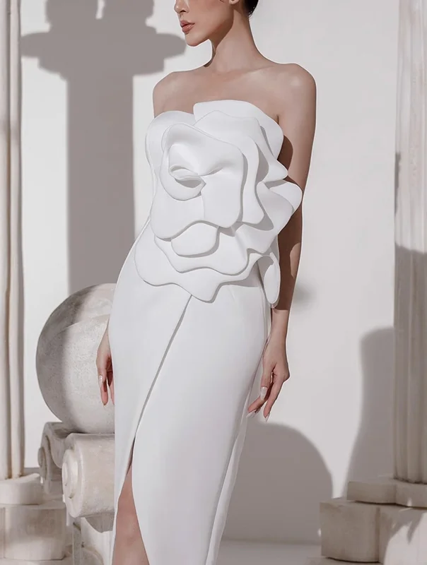Elevate your style with our stunning white floral strapless dress featuring delicate embellishments. Perfect for special occasions, this exquisite dress exudes confidence and beauty. The strapless design with intricate details ensures you stand out effortlessly. Look and feel your best in this elegant and chic dress that guarantees to turn heads wherever you go. Made with high-quality fabric and featuring flower details and concealed back zipper. Care instructions: Gentle Dry Clean Only. Please note that actual color may vary slightly due to lighting effects. The product images (without model) are the closest representation of the items true color.