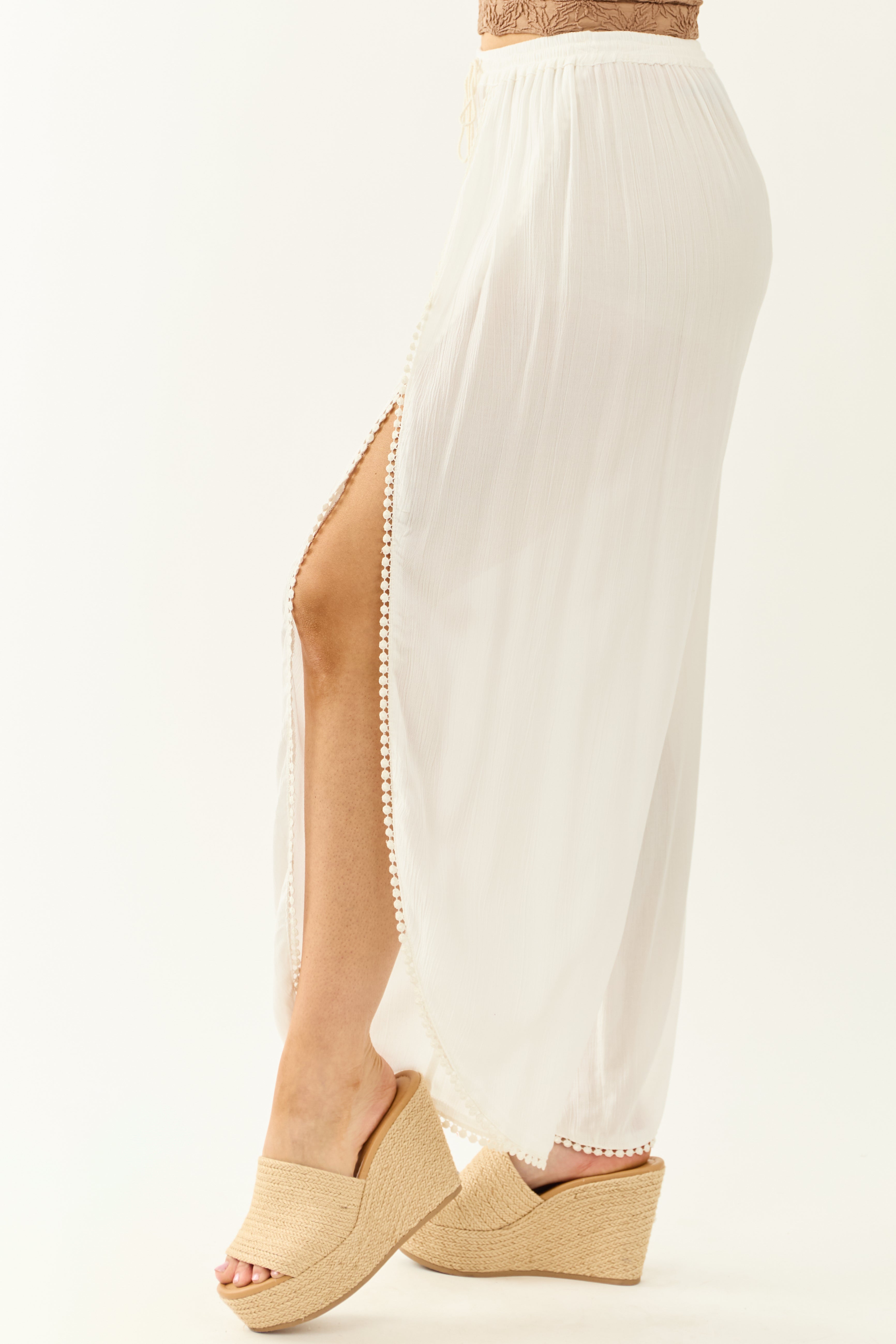 Indulge in the carefree charm of these White Flowy Boho Wrap Pants that elegantly sway with each step you take. Crafted from 100% Rayon, these pants feature an elastic waistband for comfort, adjustable drawstring with bead tassel tips, delicate dot lace trim, and a wrapped open leg design. Whether youre strolling by the beach or exploring a festival, these pants are the perfect combination of style and ease. Available in sizes S, M, and L to suit various body types. Embrace your bohemian spirit with these must-have bottoms .