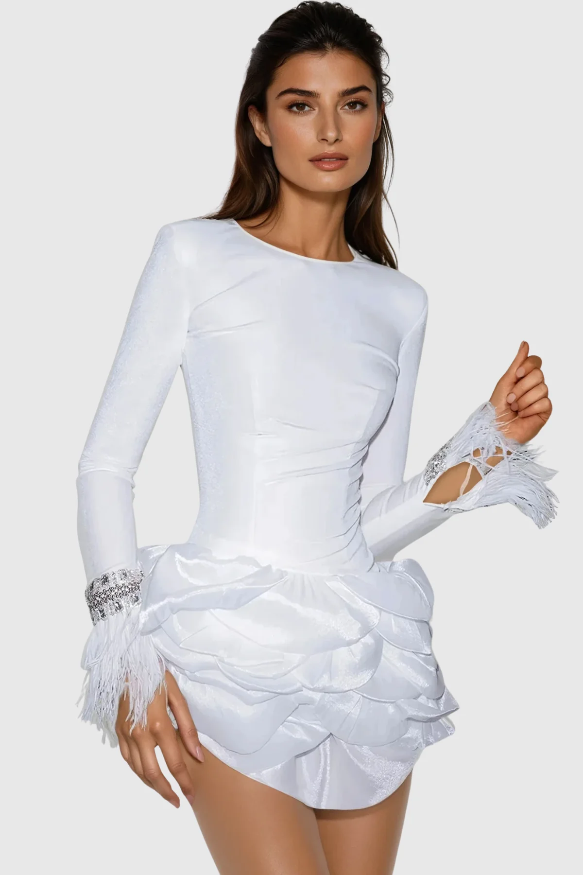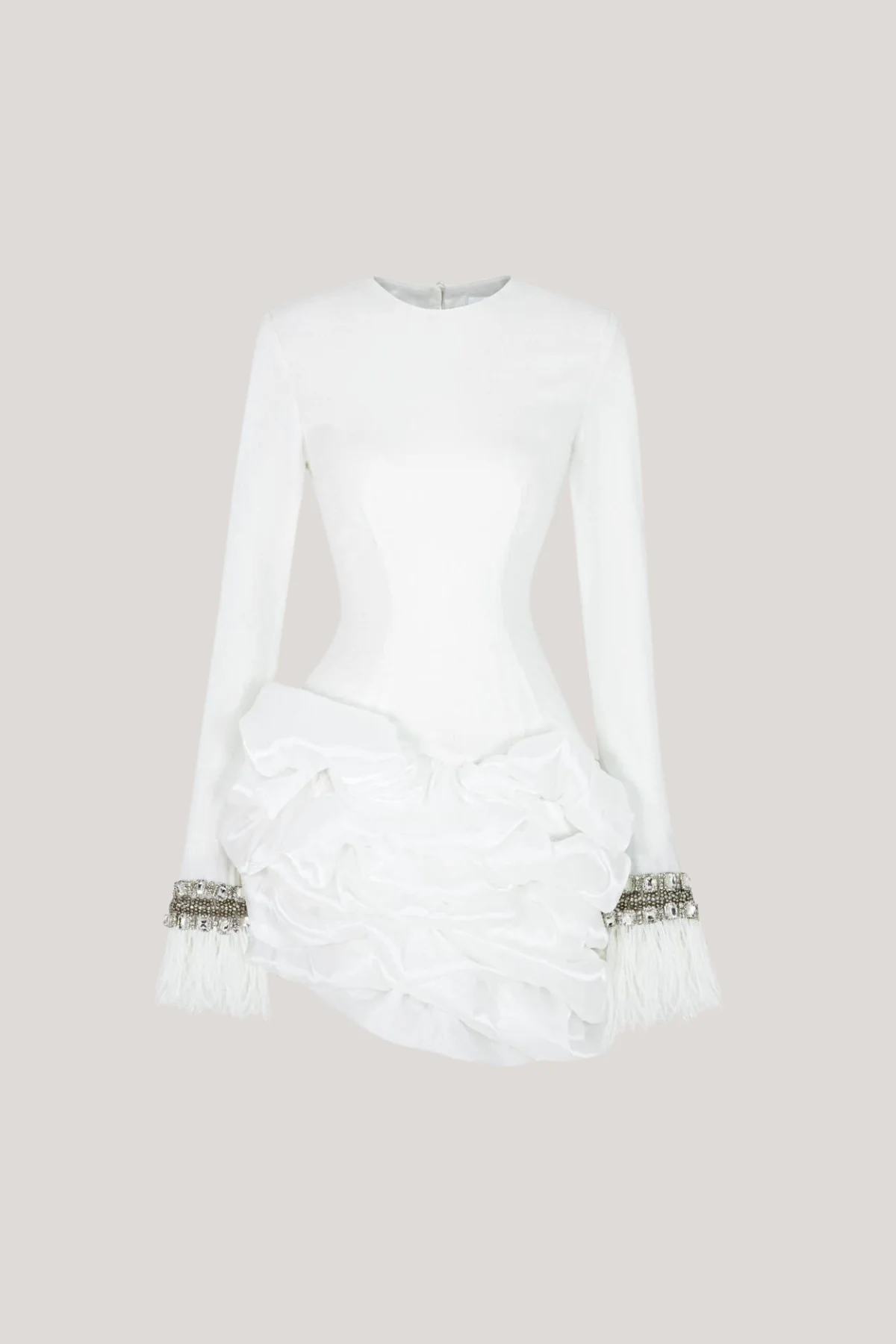 Elevate your evening wardrobe with the White Fringe Crystal Mini Dress. Expertly crafted with delicate fringe detailing and crystal embellishments for a refined sparkle. This mini dress offers a modern silhouette, perfect for special occasions. Designed for those who appreciate meticulous detail and standout style. Make a memorable impression with every step in this dress featuring slight stretch for comfort. Gentle machine wash. Color may vary due to lighting. Capture the true product color in the images.