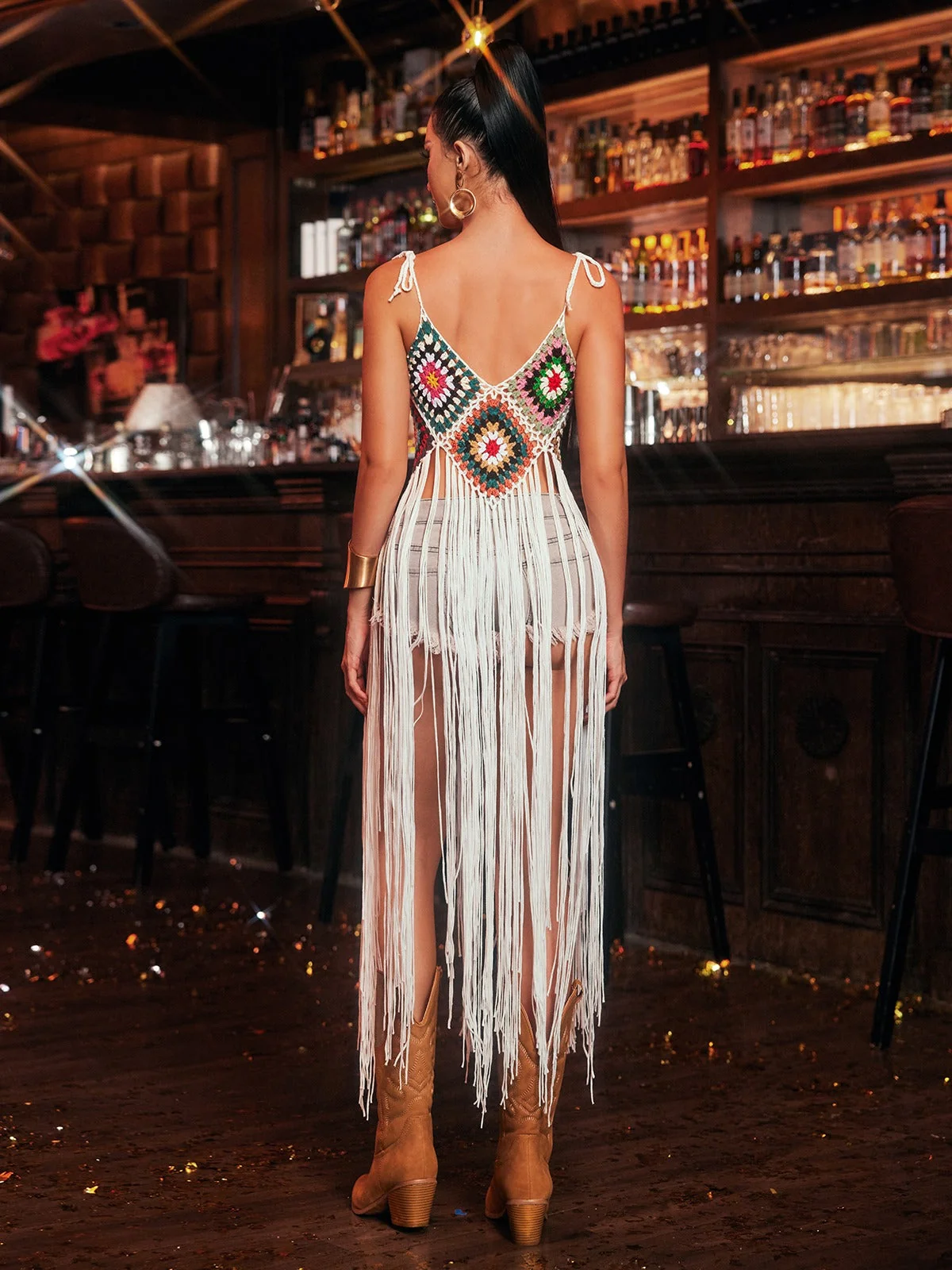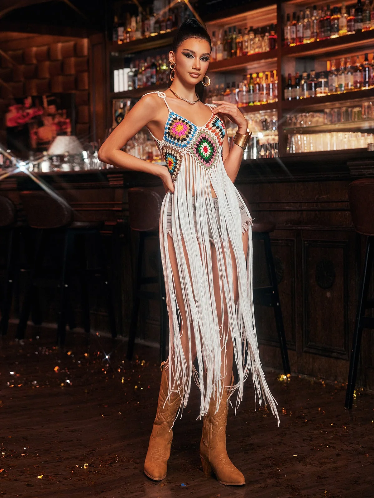 Elevate your beach style with our White Fringe Knit Beach Cover Up Dress. This elegant dress features delicate spaghetti straps, playful fringe accents, and a slight stretch for added comfort. Ideal for sunny days, this dress is a must-have for your summer wardrobe. Embrace the sun in style. Made of 100% Polyester. To maintain, dry clean only. Note: Colors may vary due to lighting effects. Model showcases O/S size.
