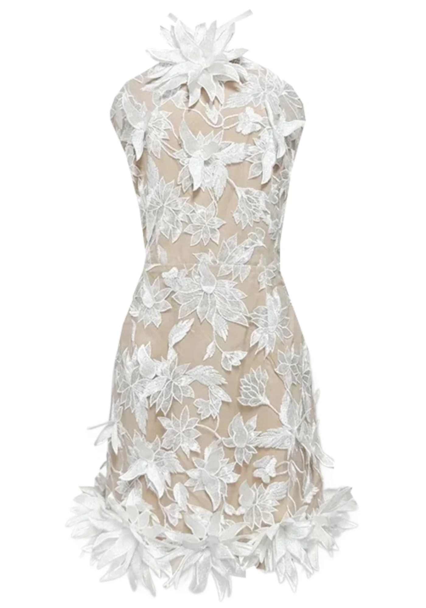 This exquisite mini dress in white boasts a halter neckline, sleeveless design, intricate floral embroidery, and an alluring open back with spaghetti straps. Crafted from a blend of Polyester and Cotton, it features a concealed zipper for easy wear. The high-quality fabric ensures durability, while the delicate sewing and YKK zipper add to its charm. Care instructions: Gentle Dry Clean Only. Illuminate any occasion with this stunning piece. Note: Color may vary due to lighting on images.