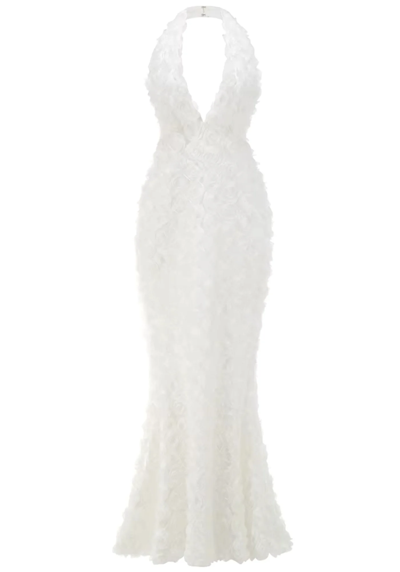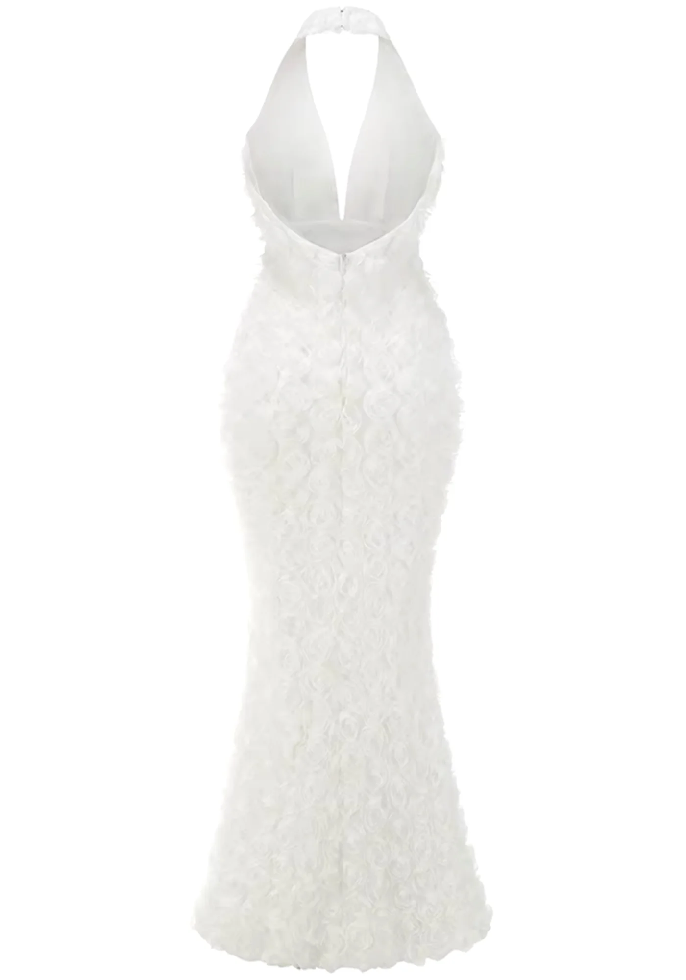 This stunning white halter floral maxi dress is a must-have in your wardrobe. Designed with a red V-neck and sleeveless style, featuring intricate floral details and a flattering mermaid design. Made of high-quality polyester and cotton blend for durability. The concealed YKK zipper at the back offers easy wear. Carefully crafted with delicate sewing and hemming for a perfect look. Ensure lasting beauty by following the care instructions provided. Elevate your style effortlessly with this elegant maxi dress. Note: Color may vary slightly due to lighting differences.