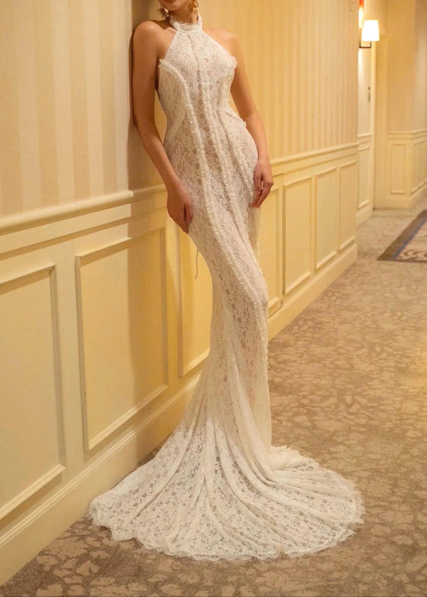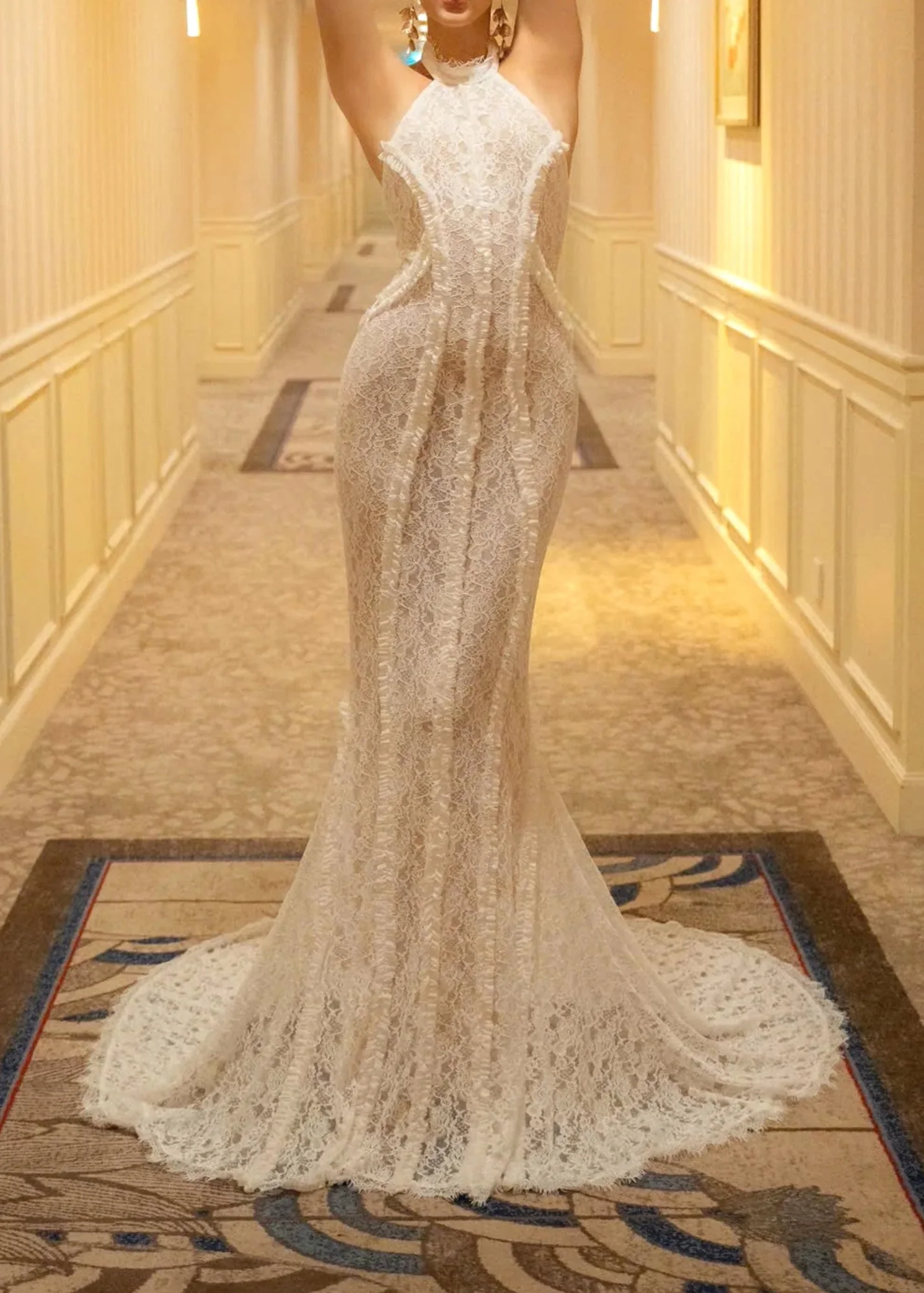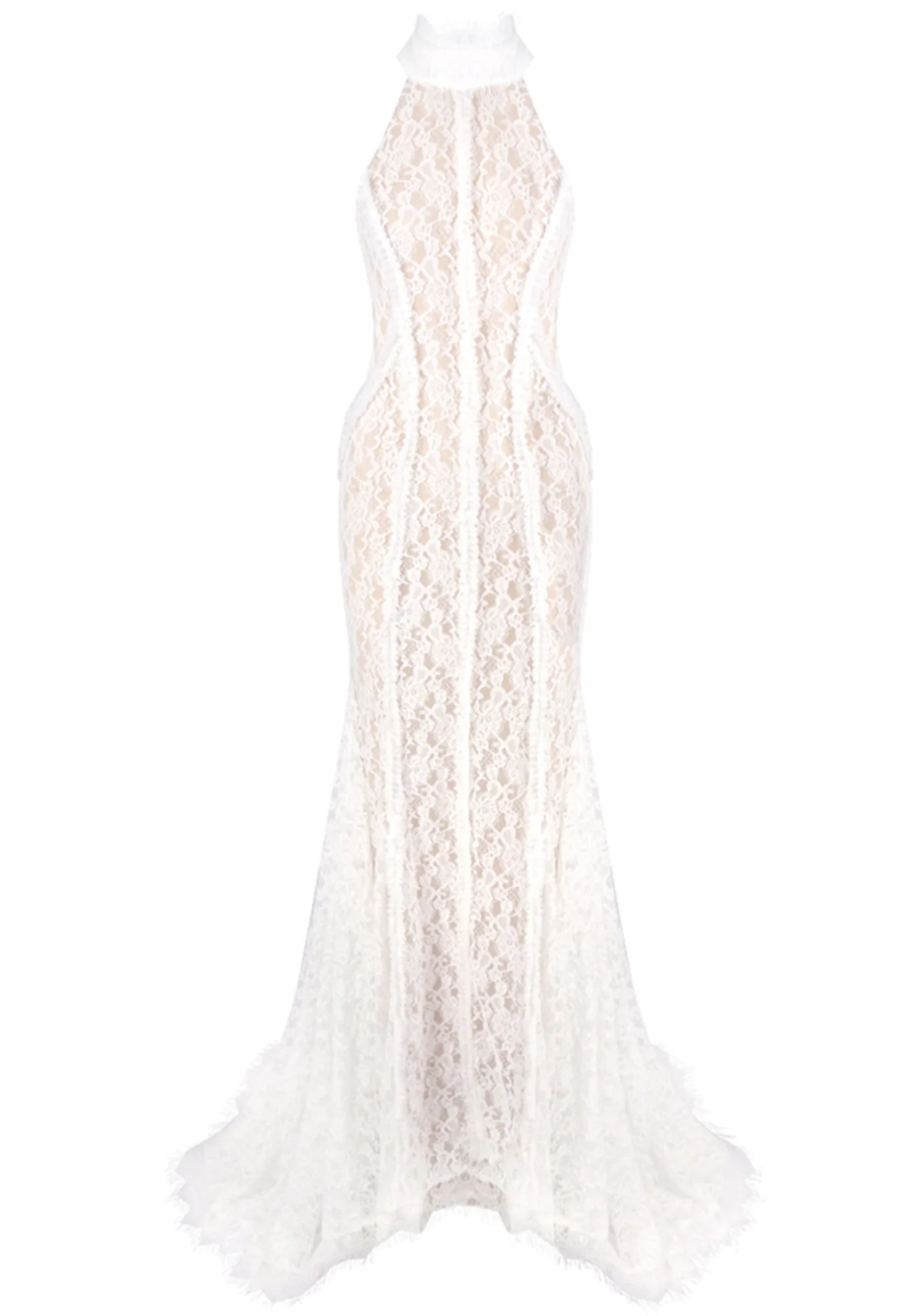 This stunning White Halter Lace Maxi Dress features a Halterneck design with Sleeveless lace insert, Ruffle detail, and a mesmerizing Corset detail at the back. The open back design adds a touch of allure, while the concealed zipper ensures a perfect fit. Crafted from high-quality Polyester and Cotton blend, this dress guarantees durability and comfort. The delicate sewing and hemming, along with the YKK zipper for reliability, make it a must-have in your wardrobe. For maintenance, gentle dry cleaning is recommended to preserve its beauty. Add a touch of elegance to your wardrobe with this exquisite maxi dress now!