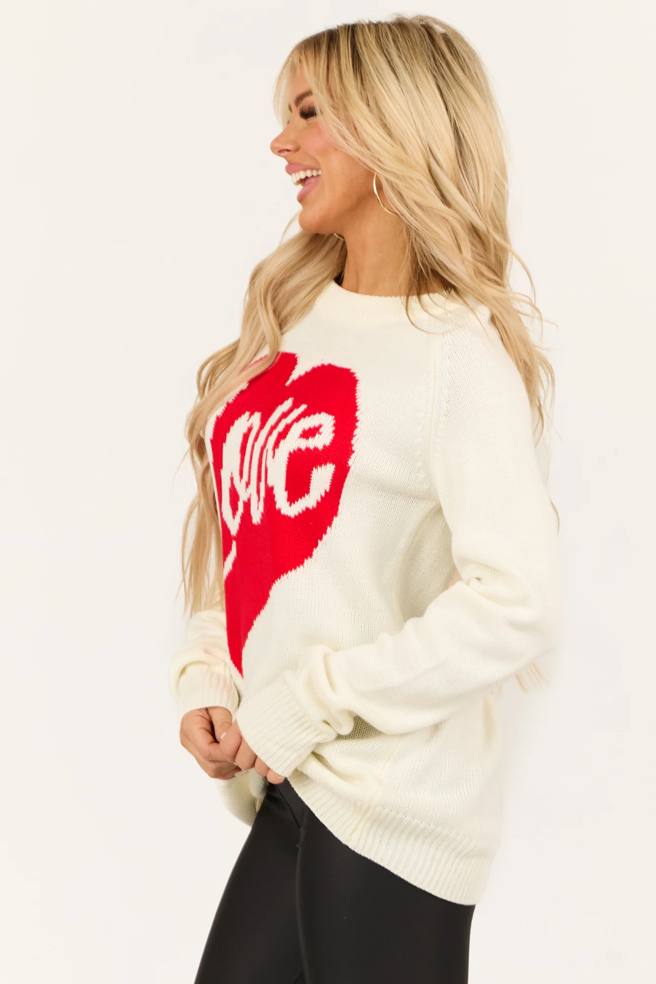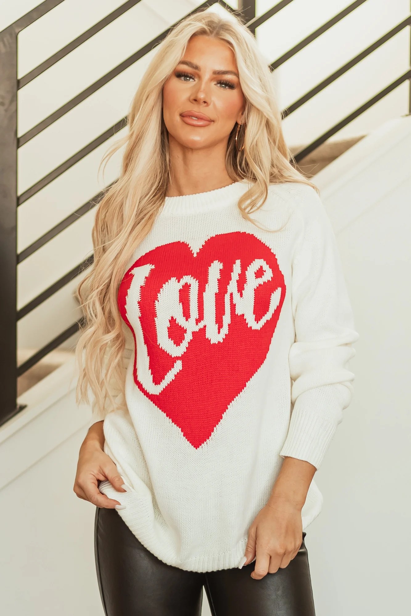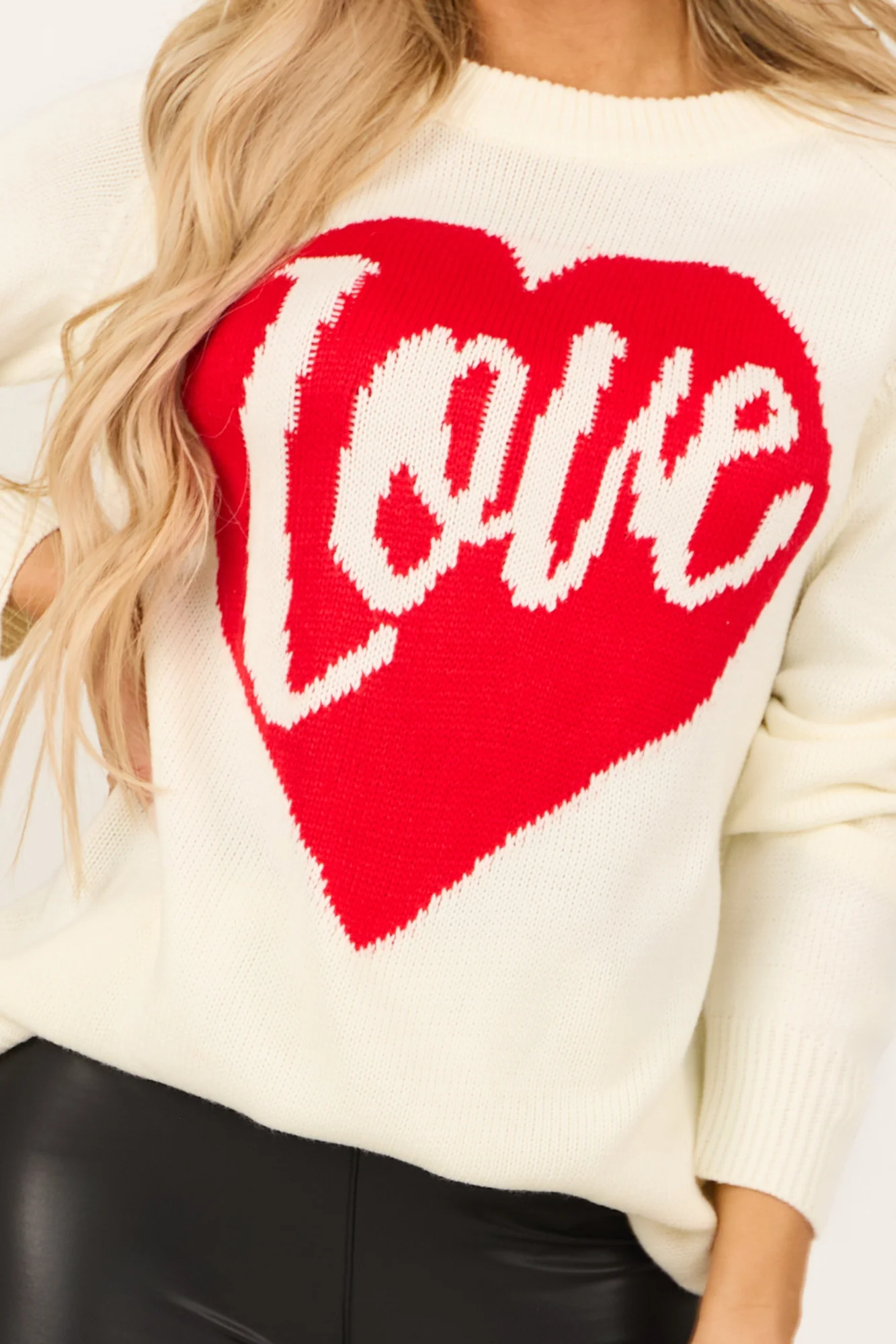 Stay cozy and stylish with our White Heart Graphic Long Sleeve Sweater. This loose-fit, semi-stretchy knit sweater features a charming ruby heart graphic on the front, complemented by raglan sleeves and ribbed details on the neckline, cuffs, and hemline. Made of 100% acrylic, this sweater is versatile and ideal for casual or daytime wear. Available in sizes S, M, L, and XL. Care instructions: Line dry, avoid bleach, medium heat ironing, no dry cleaning needed.