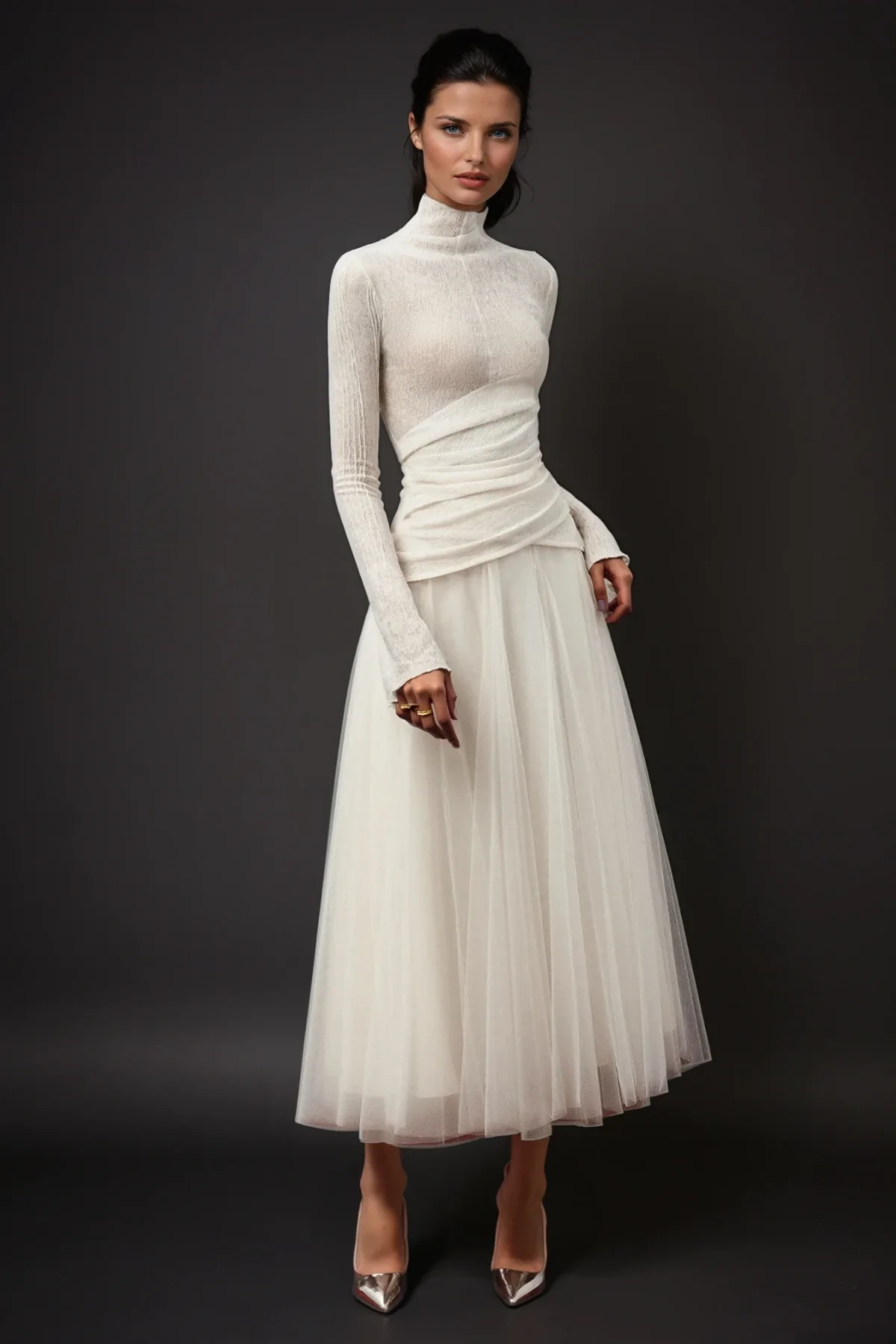 Achieve a sophisticated yet modern look with the White High Neck Ruched Skirt Set. This ensemble features a structured top with a high neckline and detailed ruching for a flattering fit. Paired with a coordinating skirt, it creates a seamless, polished appearance suitable for professional settings or upscale events. Crafted from high-quality materials, this set offers both comfort and durability while exuding refined style. Perfect for those in search of a versatile and expertly designed outfit. Experience a slight stretch for added comfort. Care instructions: Gentle machine wash. Please note color variations may occur due to lighting during photography.