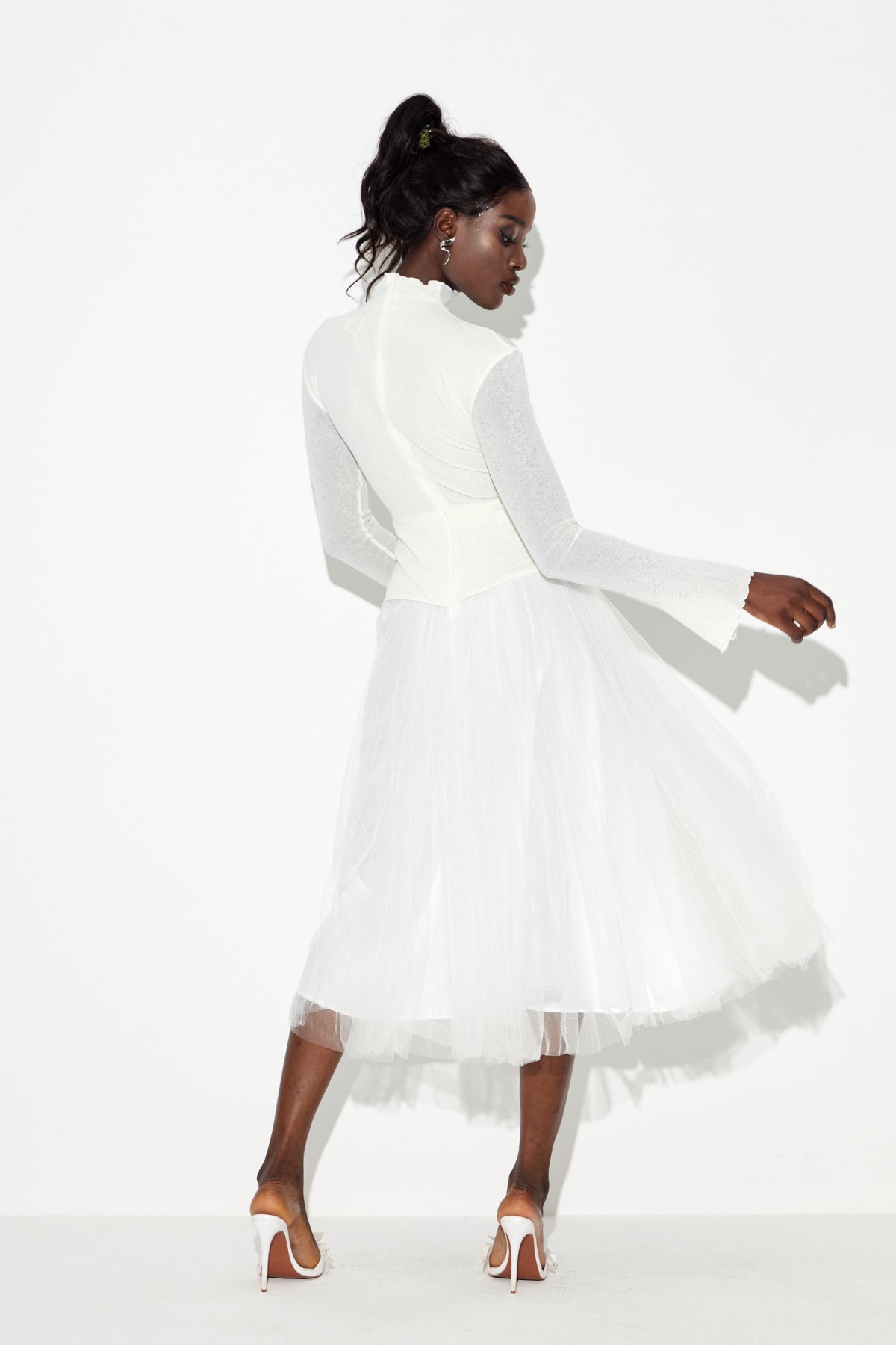 Elevate your style with the White High Neck Ruched Skirt Set, designed for modern elegance and sophistication. The high neckline and intricate ruching of the top offer a structured yet flattering silhouette. Paired with a matching skirt, this set exudes polished charm suitable for formal occasions or professional settings. Expertly crafted from premium materials to ensure comfort, durability, and refined style. Experience versatility and timeless design with this impeccably tailored ensemble. Enjoy a slight stretch fit for added comfort. Care Instructions: Gentle machine wash separately to maintain pristine condition. Please note, color variations may occur due to lighting conditions in images.