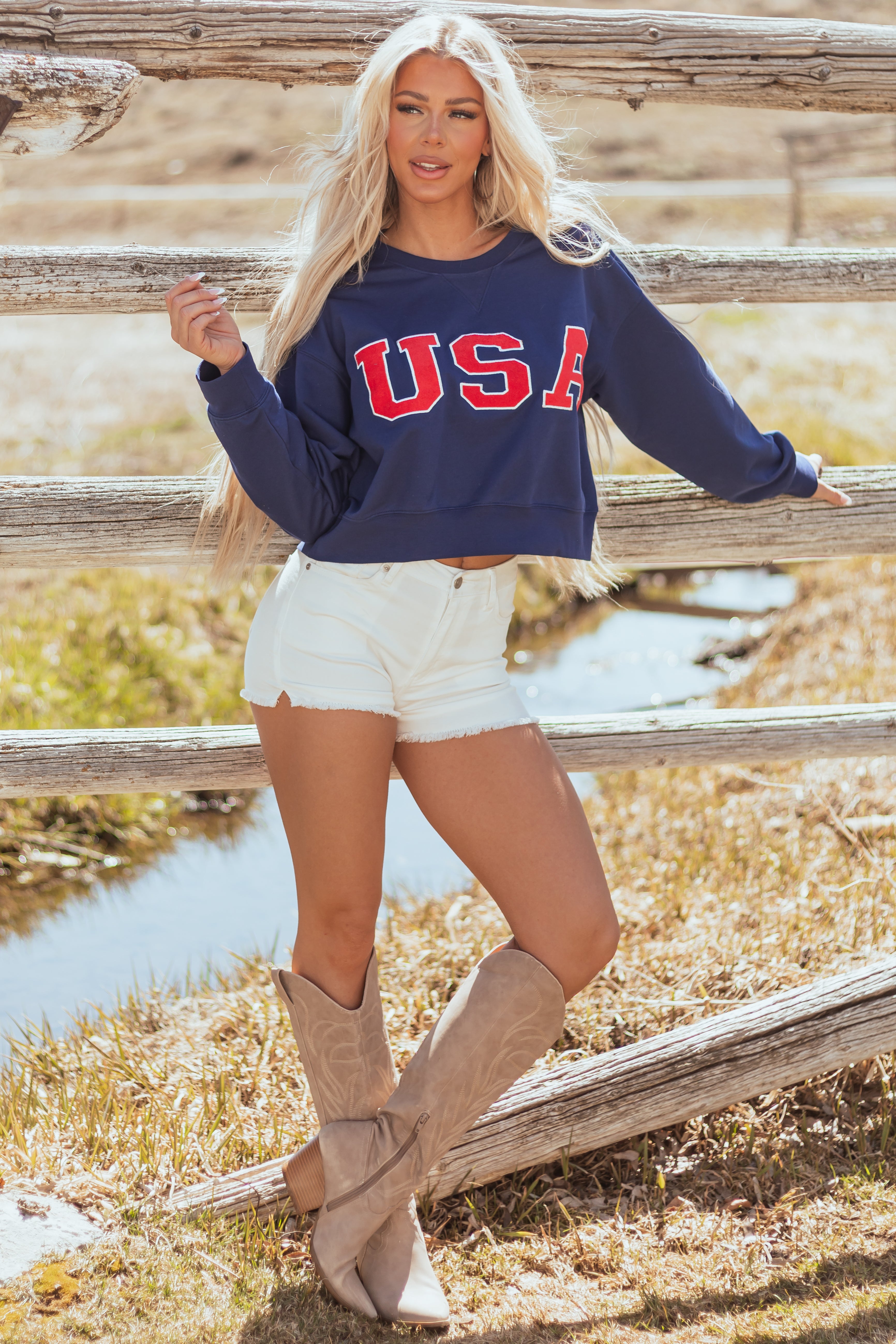 These white high rise denim shorts with frayed hems offer a playful and casual look when paired with colorful tops. Crafted from soft stretchy denim for a comfortable fit, these shorts feature a zipper fly with button closure, 5 pockets, belt loops, and varying inseam lengths. Made of 65% Lyocell, 25% Cotton, 8% Polyester, and 2% Spandex, these shorts are easy to care for and perfect for warm weather. Model is wearing a size Small. Available in sizes S, M, L, XL.