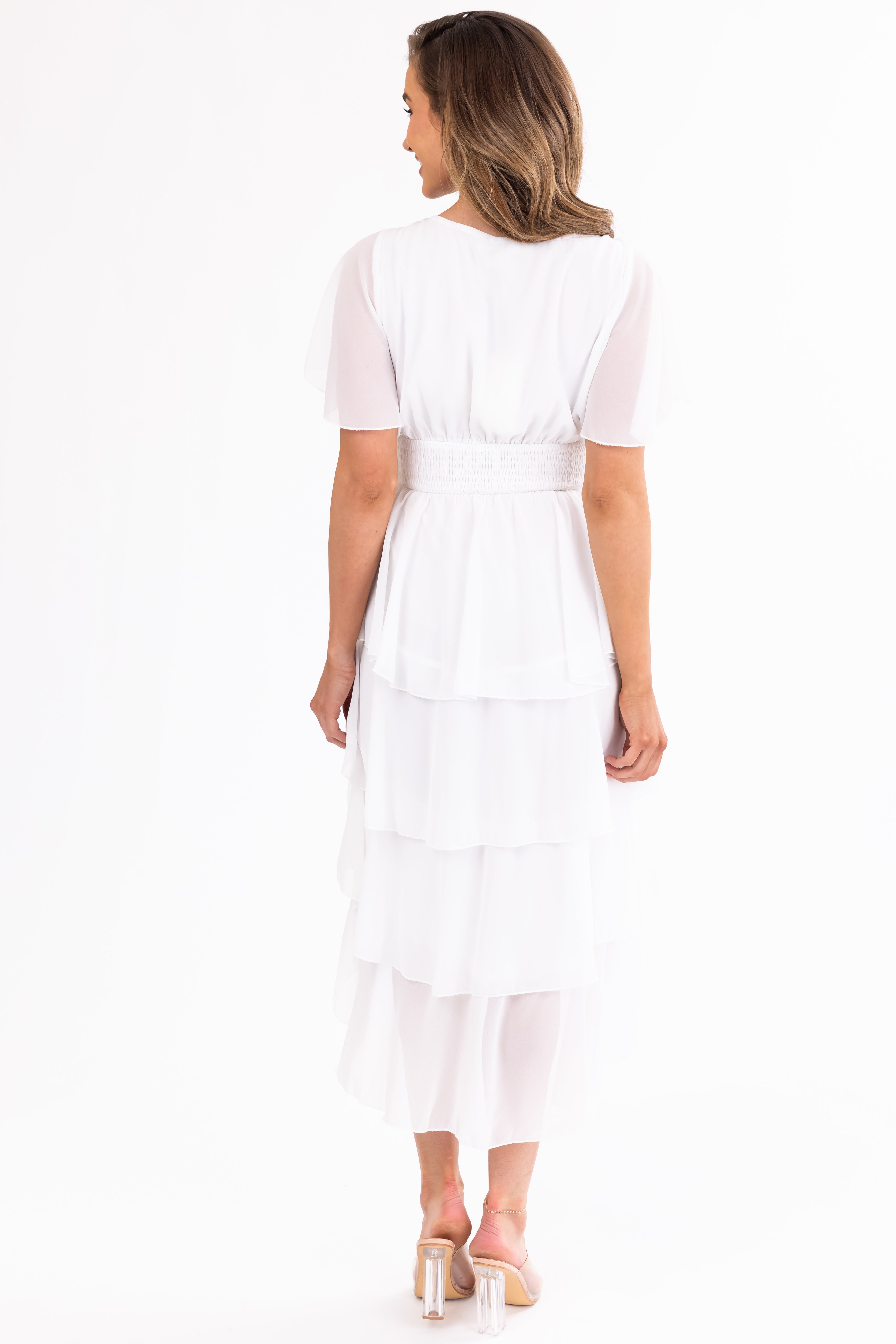 Embrace elegance with our White Ivory Ruffle High Low Midi Dress. Designed for comfort and style, this dress features a V-neckline, half flutter sleeves, and a smocked elastic waistband for a flattering fit. Made of non-stretchy woven fabric with 100% Polyester self and lining, this dress is perfect for daytime or party occasions. The dress comes in sizes Small, Medium, and Large, ensuring a true-to-size fit. Feel beautiful and confident in this lined imported dress. Care Instructions: Hand wash, do not bleach, dry flat.