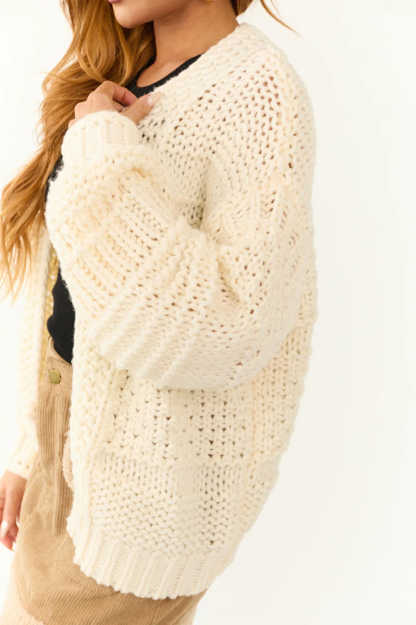 Stay cozy and stylish in our White Knit Oversized Cardigan with Puff Sleeves. Crafted from stretchy knit, this cardigan features long puff sleeves, banded trim, and a drop shoulder design for a relaxed fit. The unlined construction adds breathability, making it perfect for layering. Care instructions: Hand wash cold with similar colors, do not bleach, lay flat to dry, cool iron if necessary. Available in XS, S, M, and L sizes.