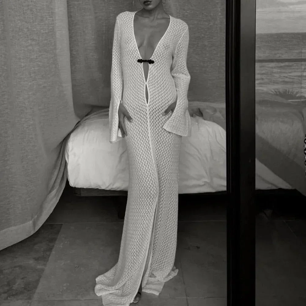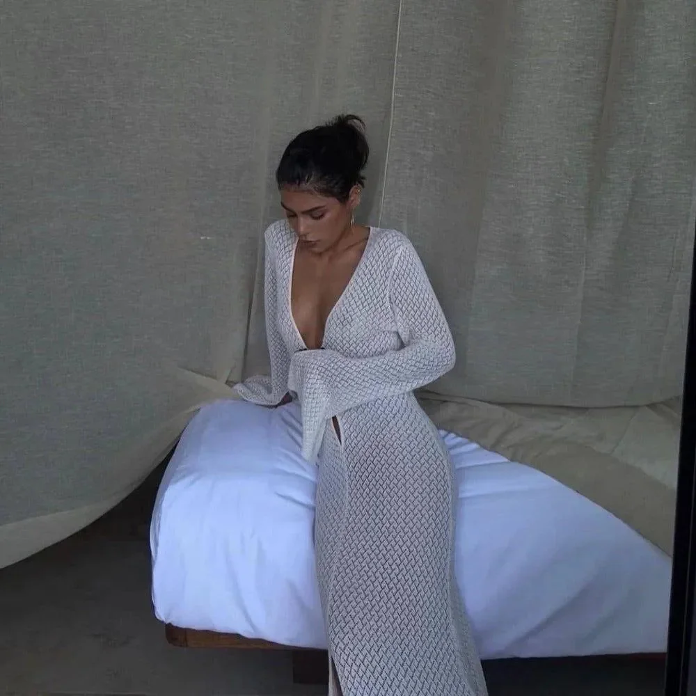 Elevate your style with this stunning White Knitted Maxi Dress featuring a flattering V-neck, long sleeves, and a sexy frontal slit. Crafted from soft cotton fabric for all-day comfort, this dress is a perfect blend of chic and cozy. Its timeless design makes it a versatile wardrobe essential suitable for any occasion, from casual outings to special events. Make a bold statement and turn heads effortlessly with this must-have knitted maxi dress that guarantees to enhance your look. Discover more style inspirations on our Instagram @mermaid_way. If the dress doesnt fit, we offer a complimentary size exchange. Dont miss out on this stylish piece!