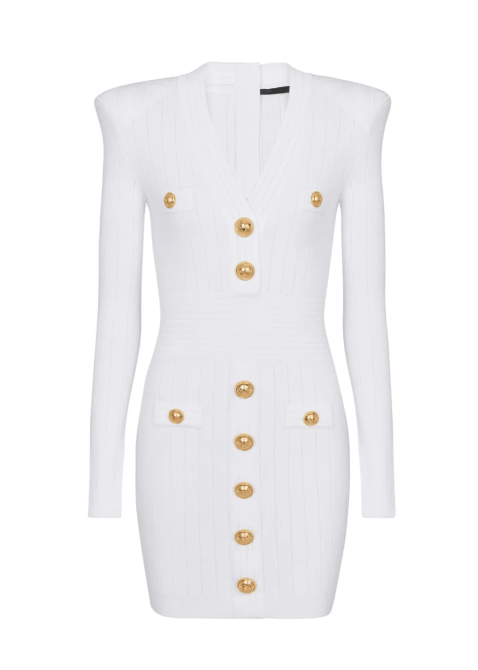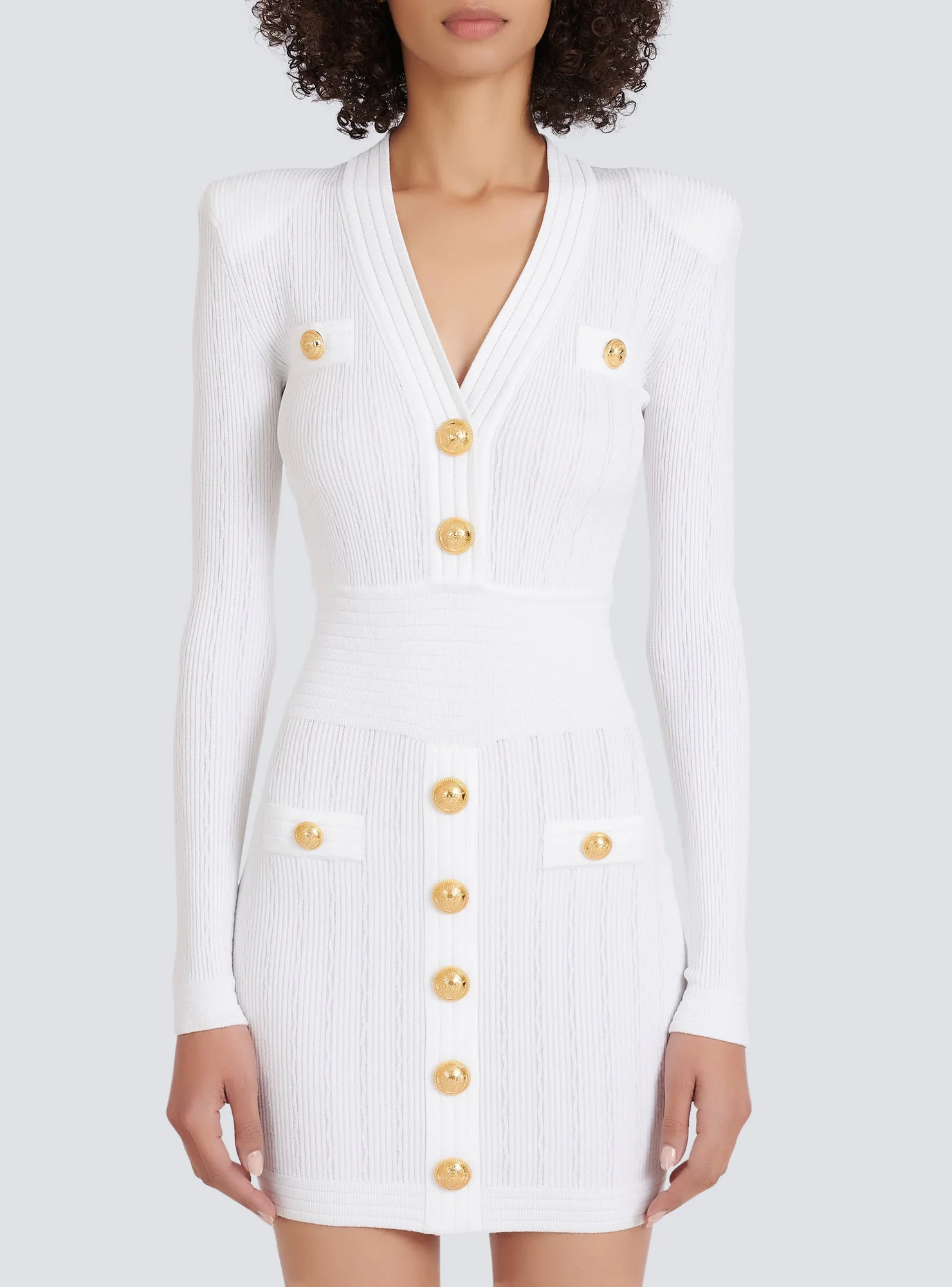 Elevate your style with our white knitted mini dress featuring exquisite gold buttons. Crafted from high-quality fabric for comfort and elegance. This chic dress with long sleeves and a fitted cut is versatile for any occasion, ensuring a sophisticated look every time. The openwork viscose design and zip fastening on the back add a touch of glamour. Available in sizes S, M, and L. Order yours now!