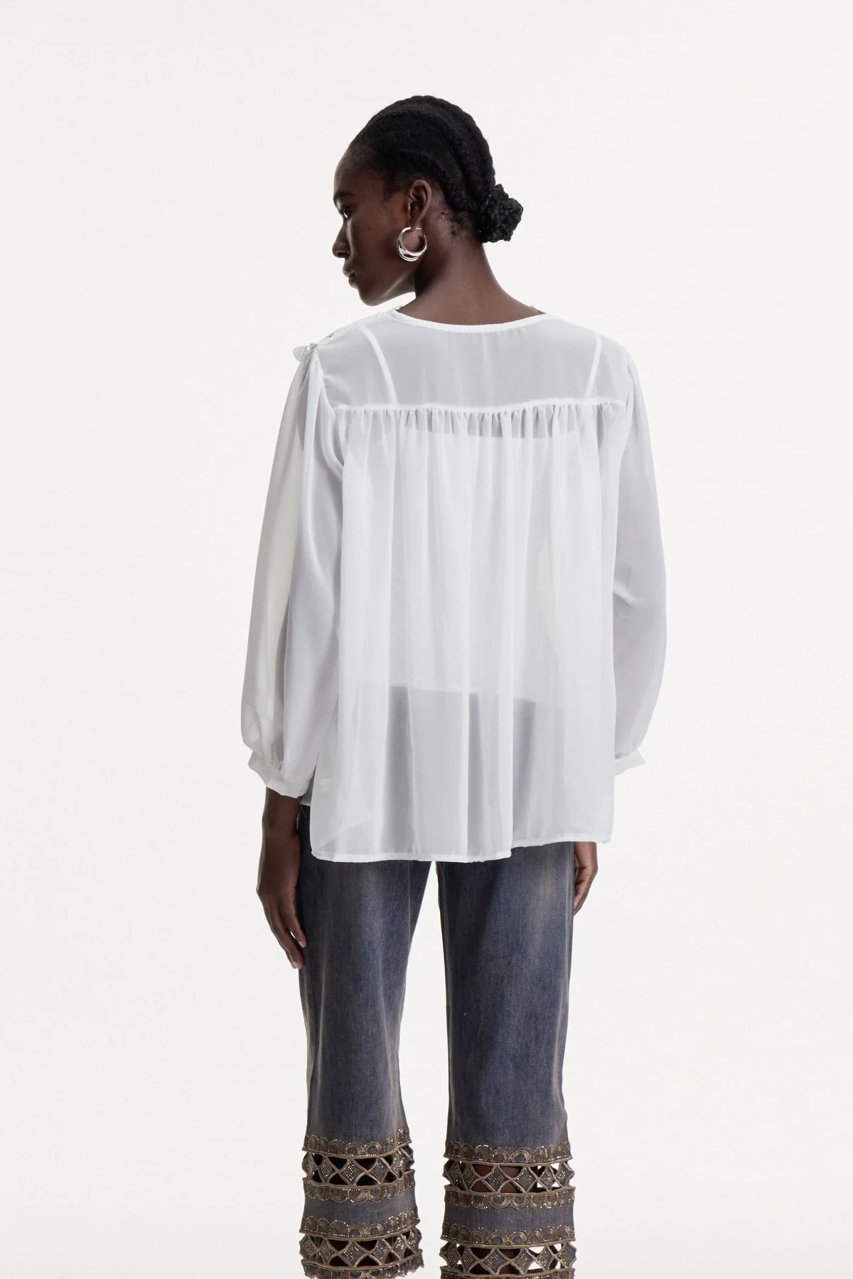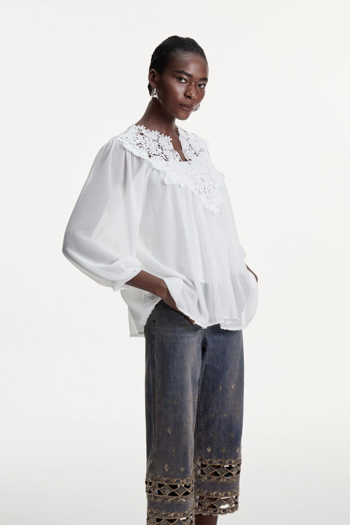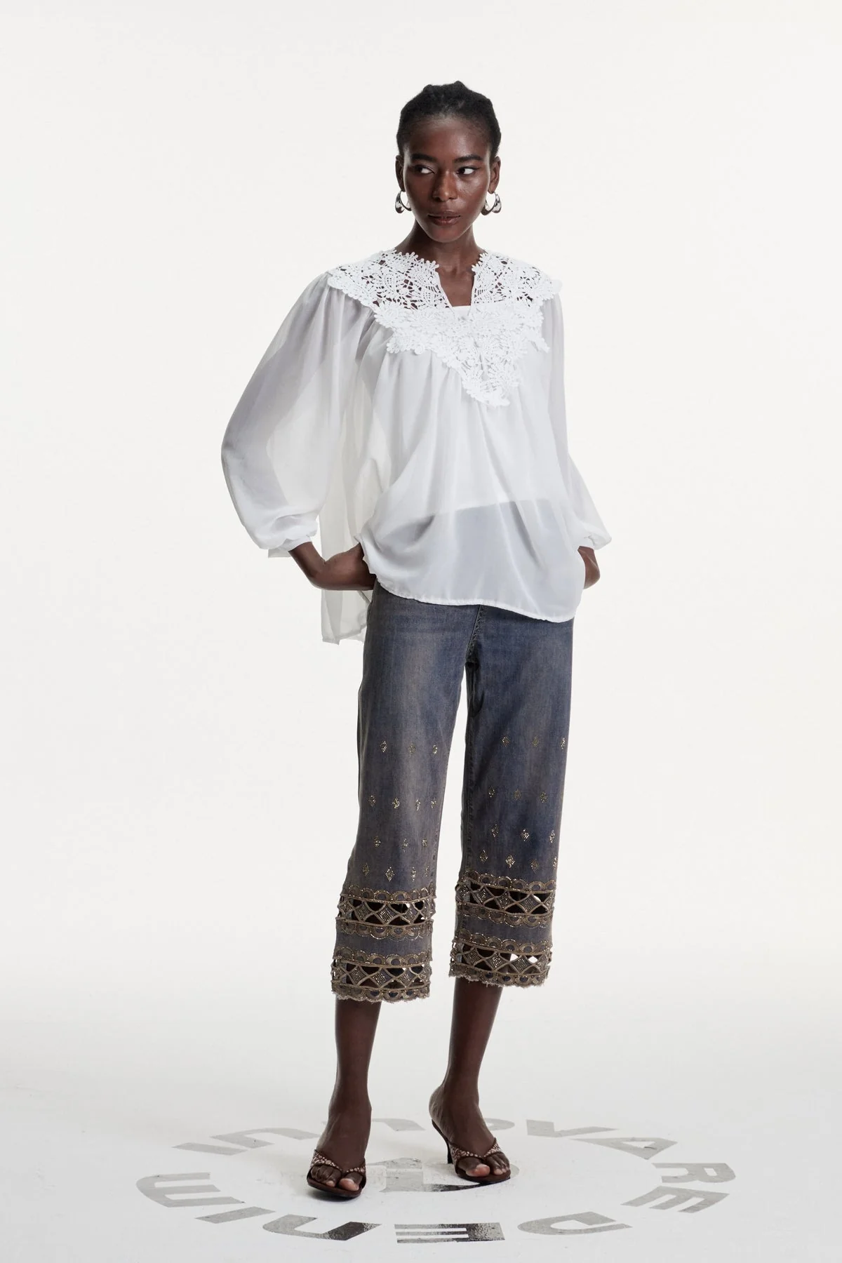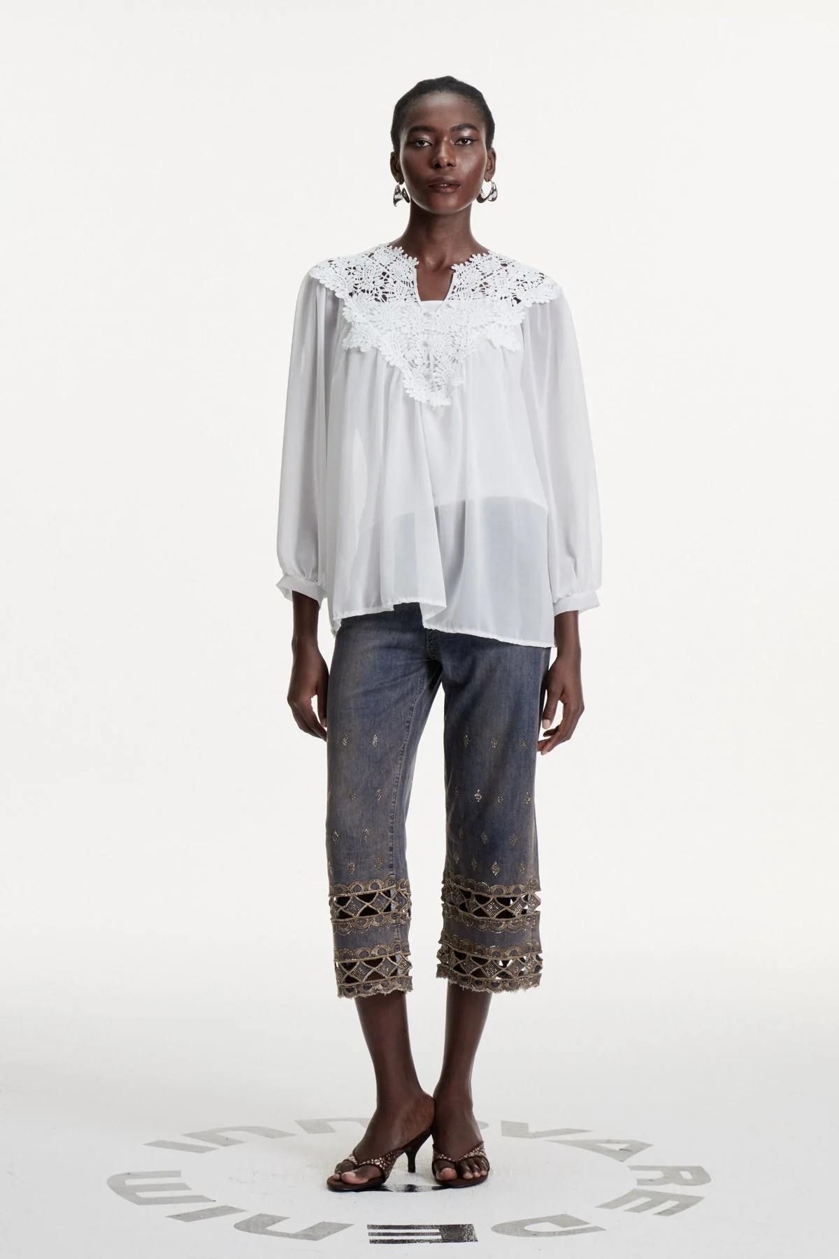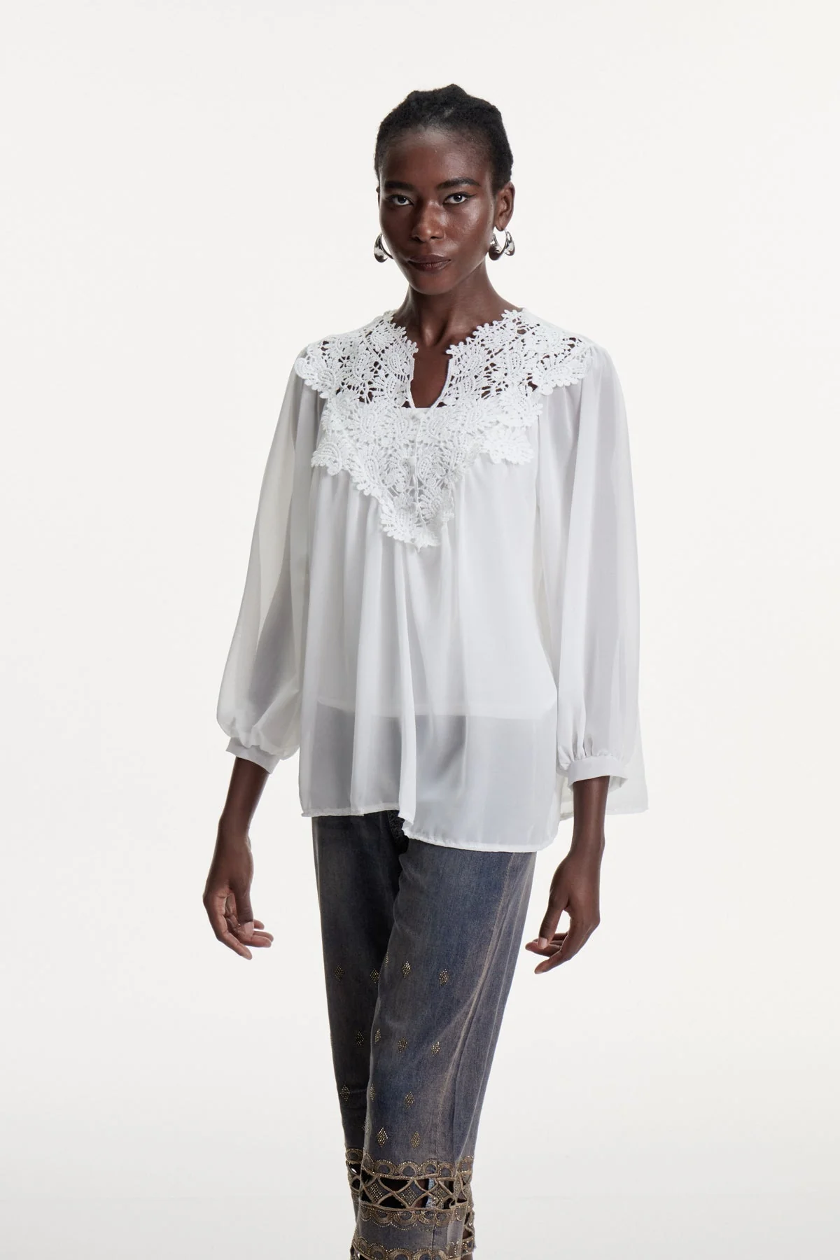 Elevate your wardrobe with our White Lace Balloon Sleeve Top for women, featuring delicate lace fabric and voluminous balloon sleeves for a refined silhouette. This chic essential blends feminine elegance with a modern edge, perfect for sophisticated daytime events or chic evening outings. The breathable lace ensures comfort while adding texture and visual interest to your ensemble. Ideal for layering or standalone wear, our top offers versatility and standout style that complements tailored trousers or skirts effortlessly. Stretch Factor: Non-Stretch Clean: Gentle machine wash Color may vary due to lighting. Discover the perfect mix of romance and sophistication!