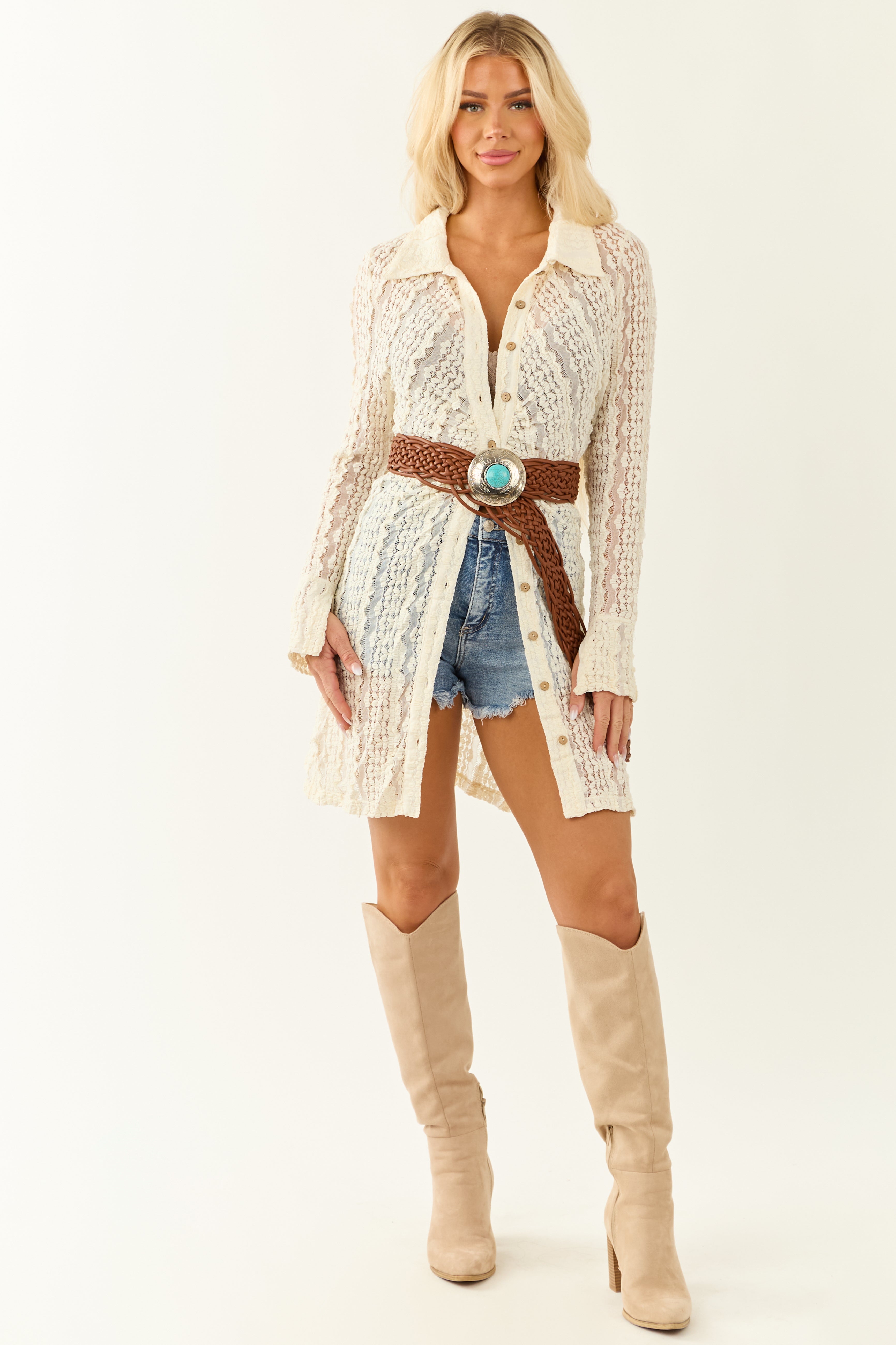 This stunning White Lace Button Down Sheath Dress features a shirt dress style with a semi-stretchy woven lace fabric that offers ultimate comfort and style. Designed with a collared neckline, ruched waist, and cuff slits on the sleeves for a fashionable touch. Perfect for any occasion. Belt not included. Imported. Care instructions: Hand wash cold, line dry, iron low heat. Model is wearing size Small. Models Profile: Size 1, Height 57″, Bust 34″, Waist 26″.