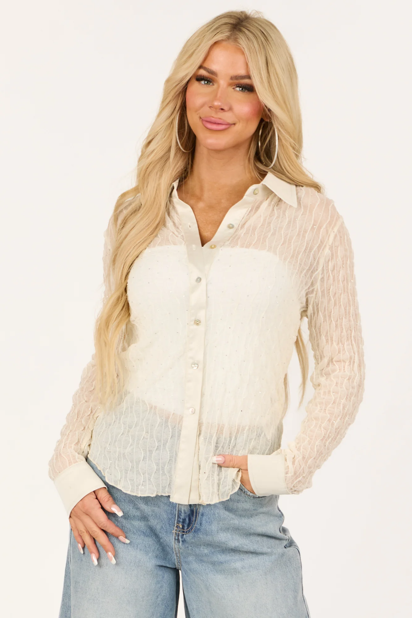 Experience elegance with our White Lace Button Up Rhinestone Top. This top features a faux suede collar, bubble mesh fabric, and delicate silver rhinestone details for a touch of glamour. Enjoy a comfortable fit with stretchy fabric and banded button cuffs. Perfect for both casual and formal occasions. Available in sizes S, M, and L. Dry clean recommended. Model is wearing a size Small. Ideal for those who seek sophistication and style.