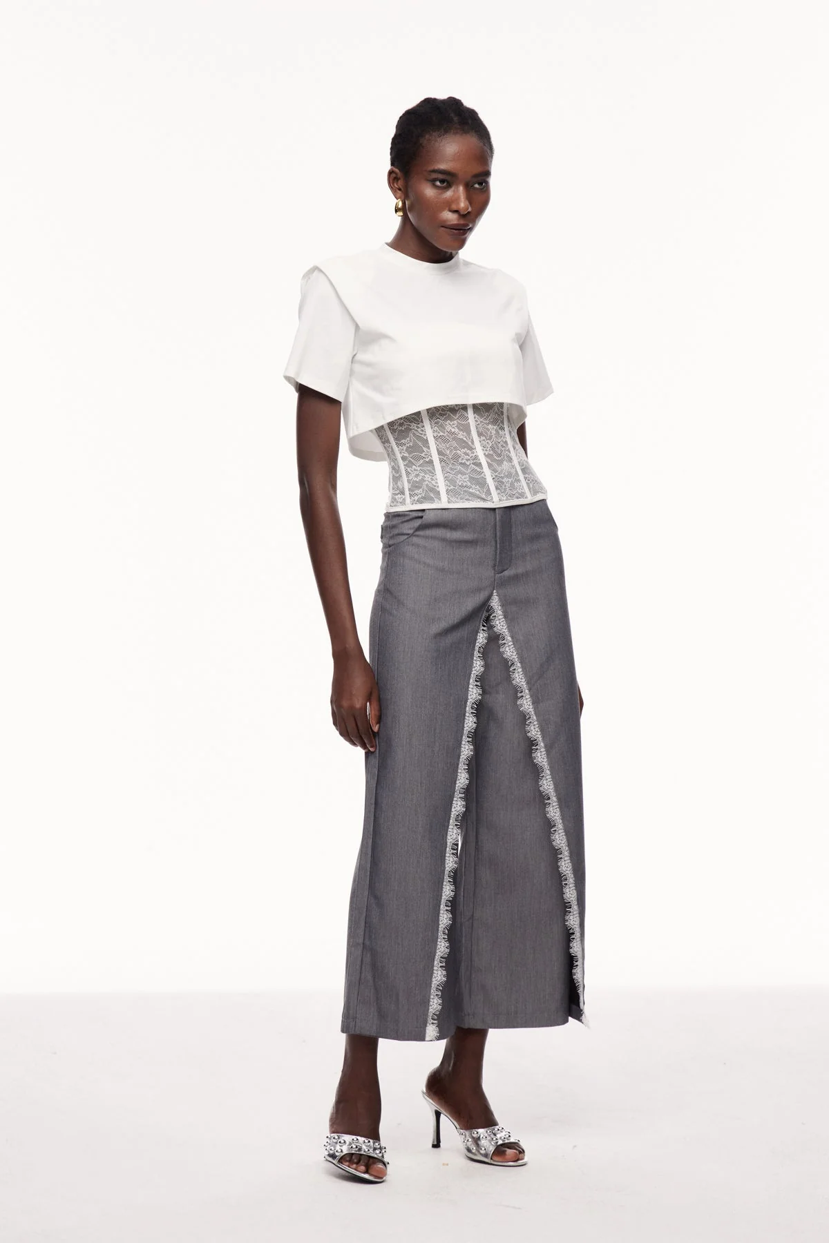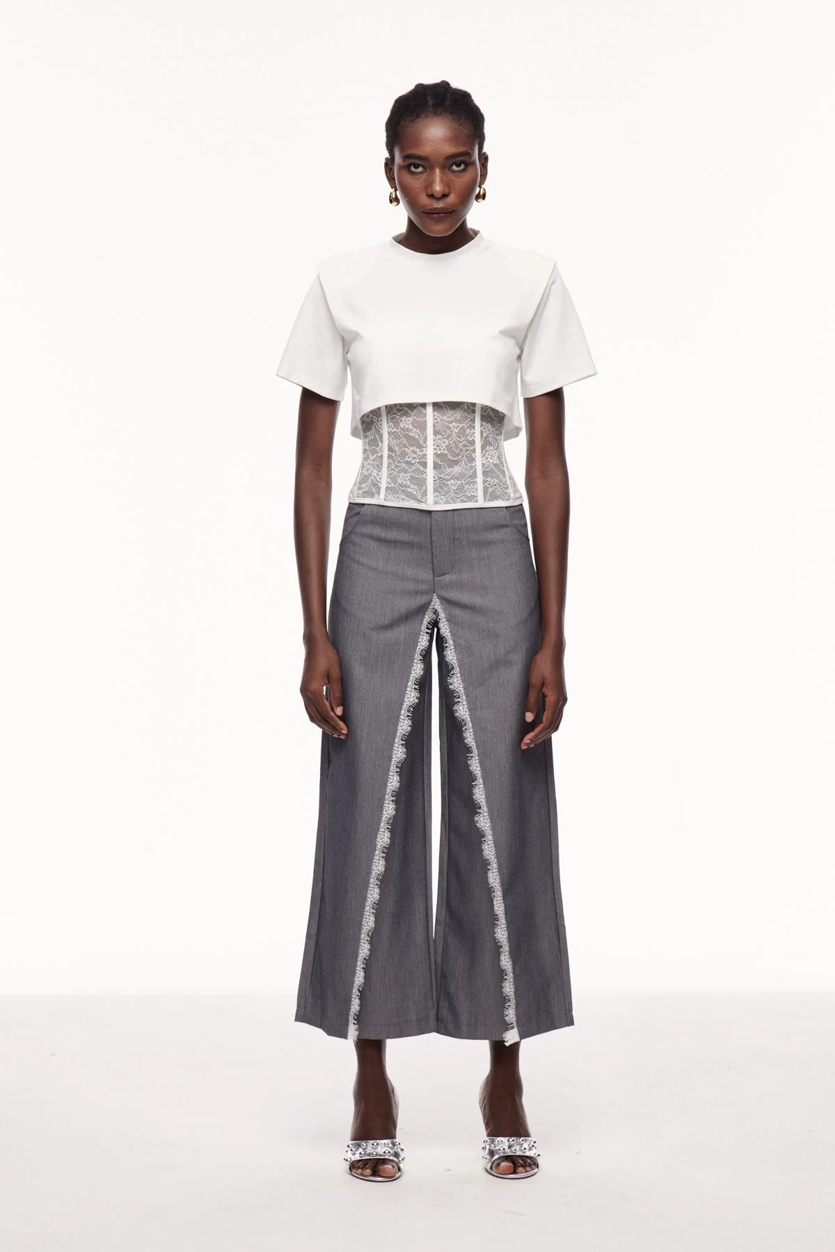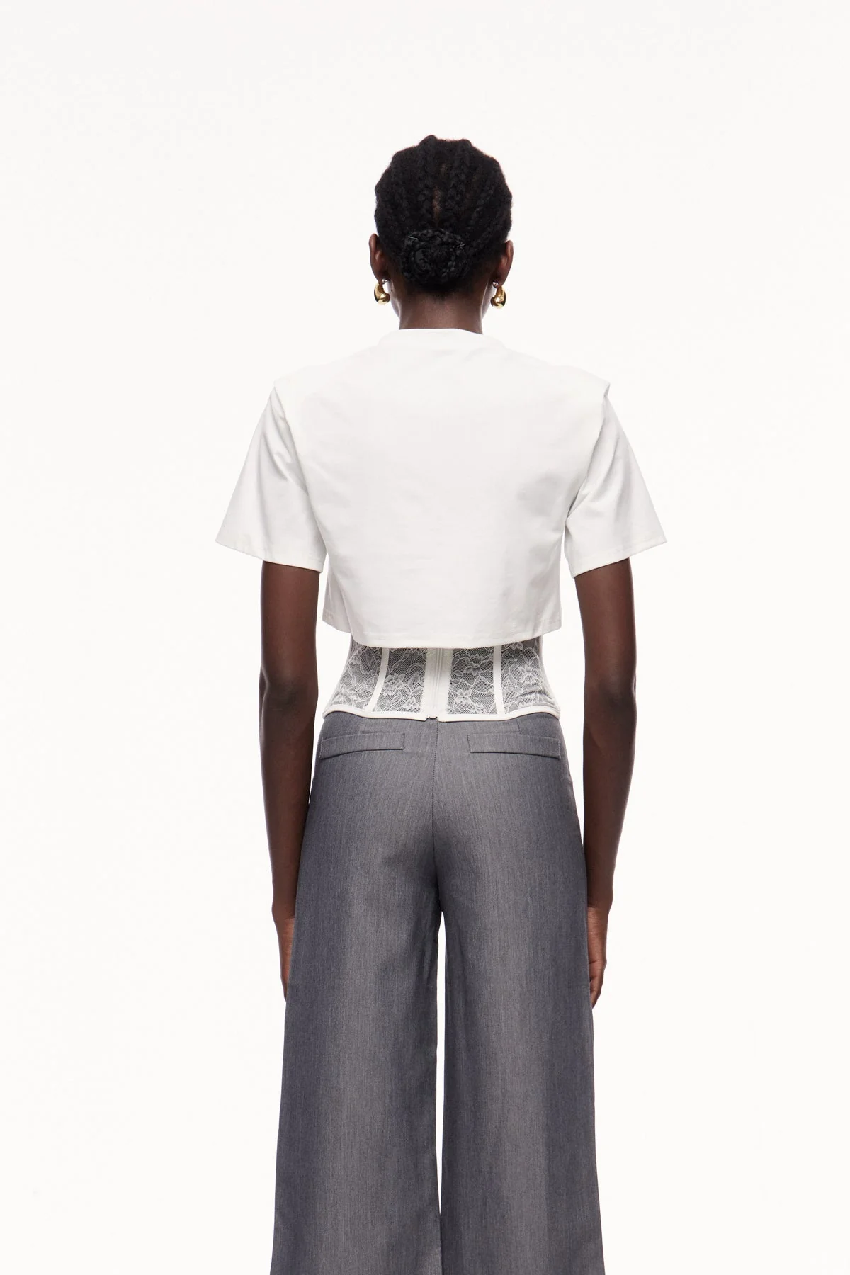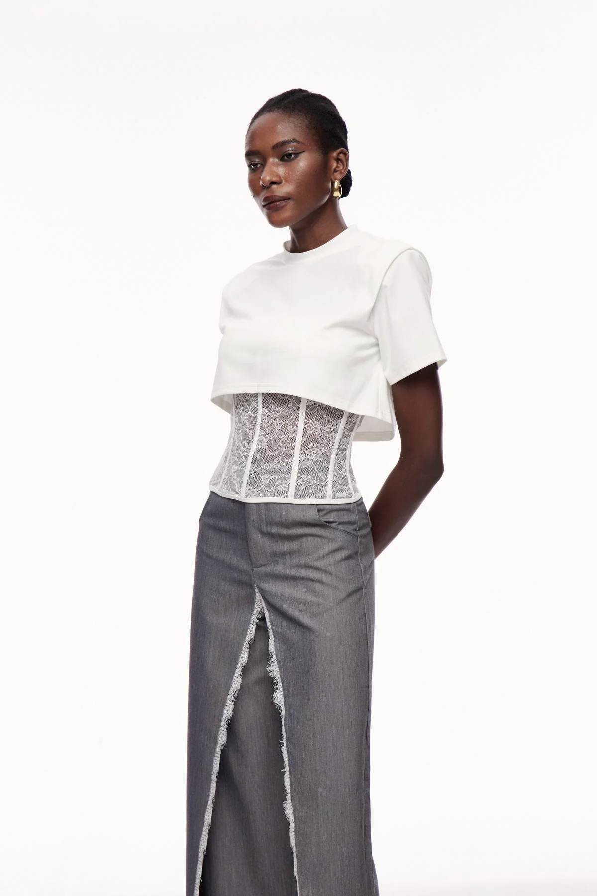 Elevate your style with our White Lace Corset T-Shirt for women . This chic essential combines edgy design with refined craftsmanship. The corset-inspired lace detailing enhances your silhouette for a bold, fashion-forward statement. This top offers a structured yet comfortable fit, crafted from high-quality materials ensuring durability. Ideal for the rebel office or a romantic coquette look. Enjoy a versatile addition to your wardrobe that is easy to clean with a gentle machine wash. Stretch Factor: Non-Stretch. Please note, color may vary due to lighting effects on images.