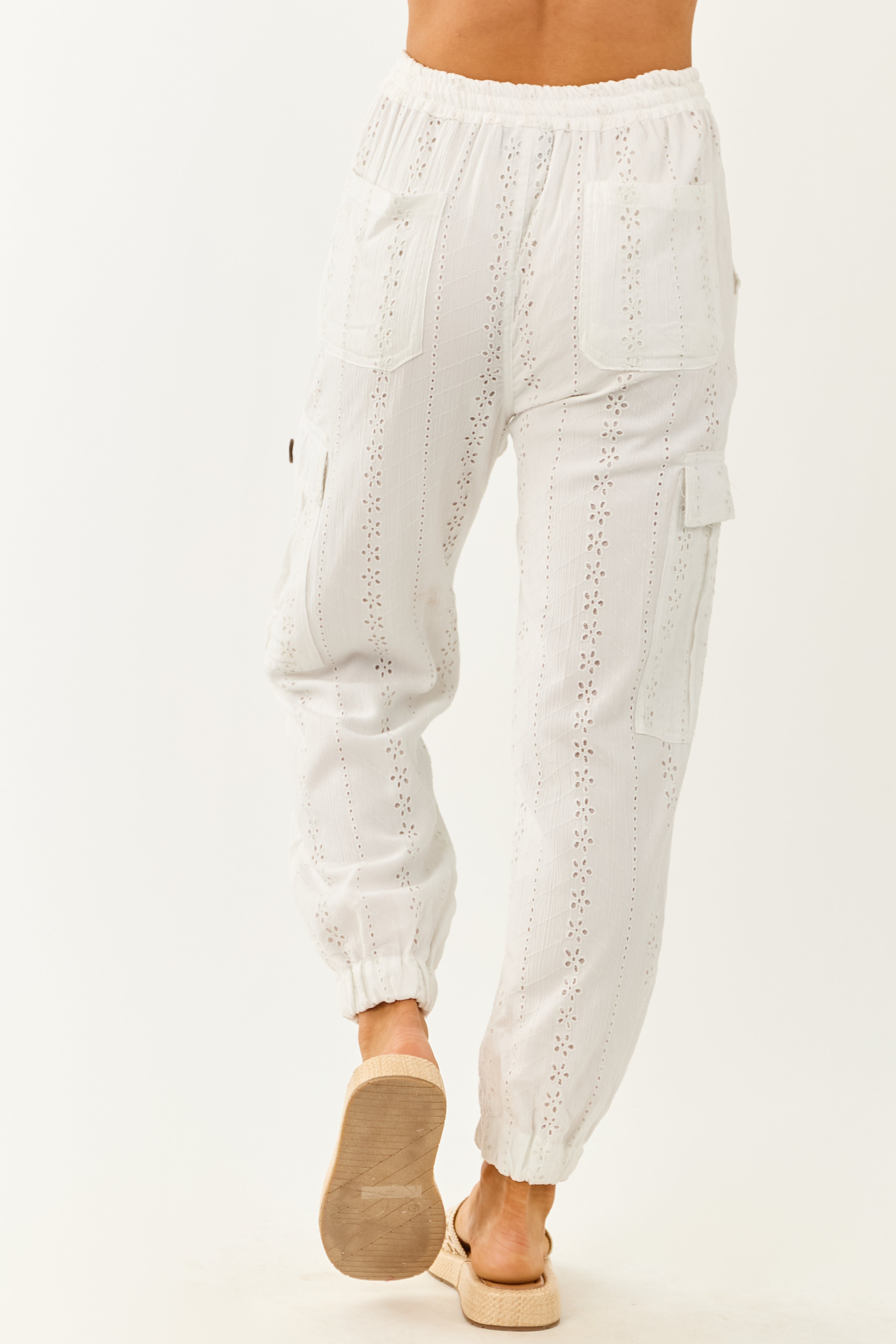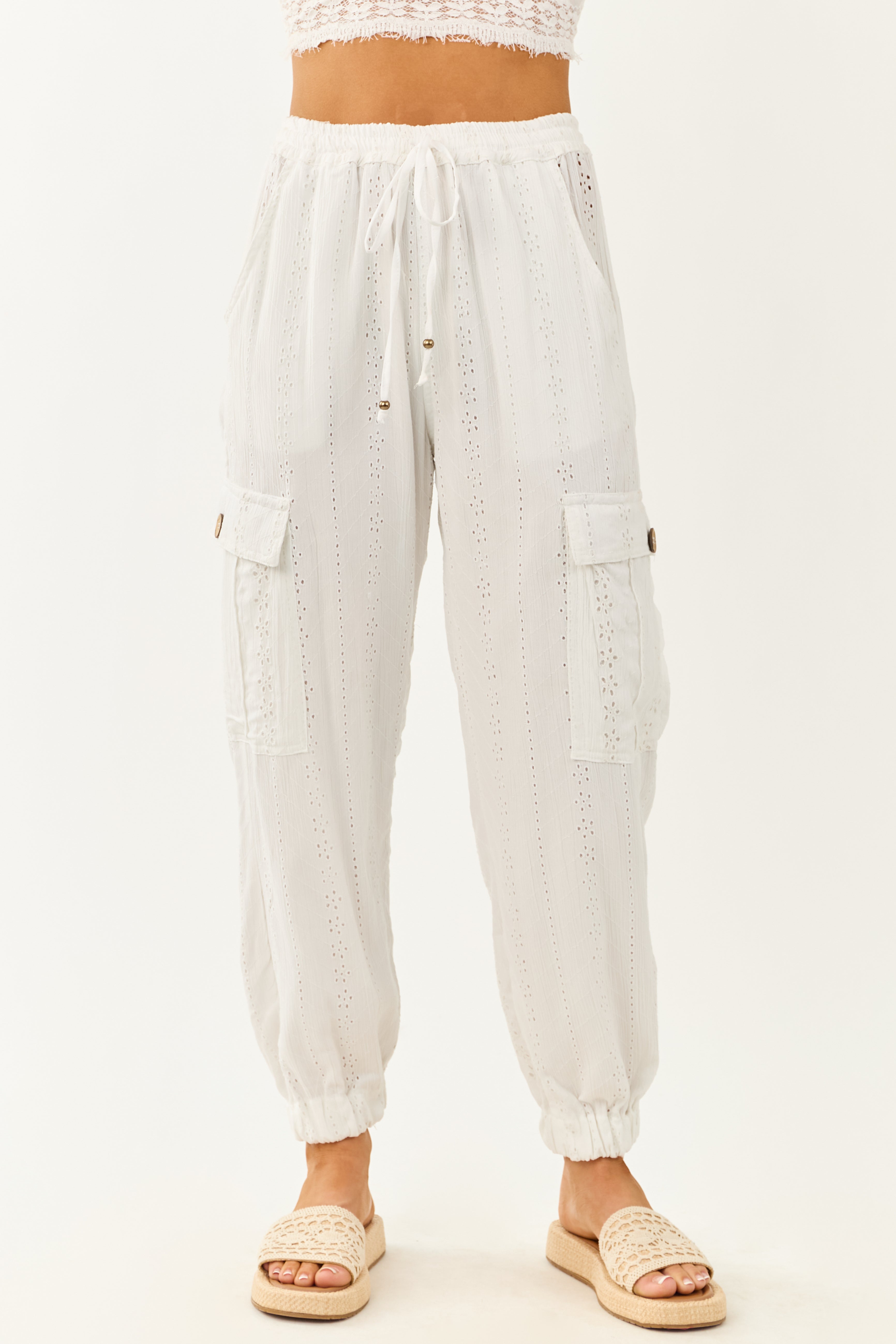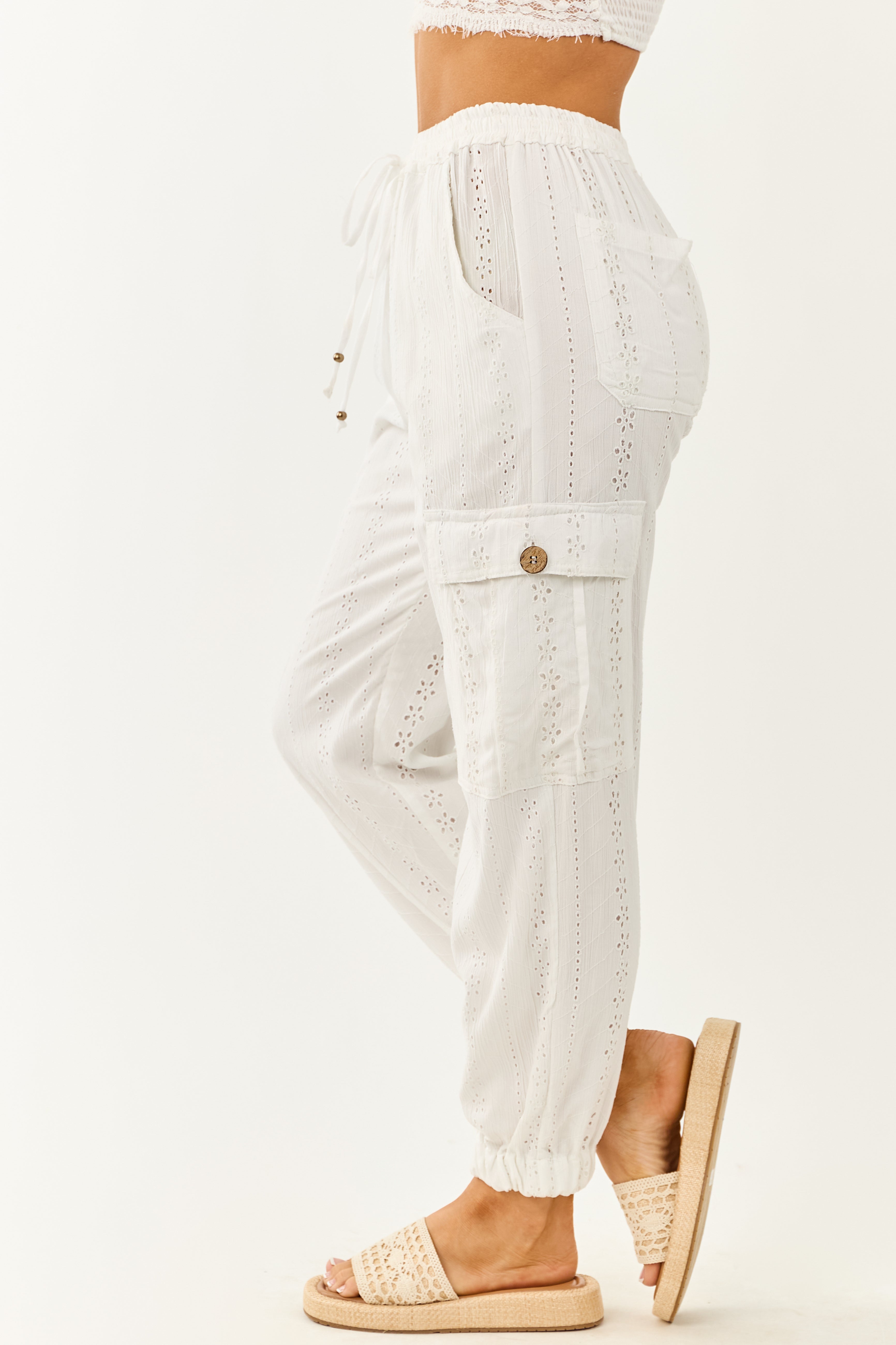 Enhance your wardrobe with these versatile white lace drawstring cargo jogger pants . Featuring an airy eyelet texture, smocked waistband, and bead tassel tips, these pants blend utility and style seamlessly. The pants offer a stretchy fit with six pockets, perfect for both casual outings and lounging. Crafted from 100% Rayon, these lined pants provide comfort and elegance. Available in sizes XS to XL, these jogger pants are a must-have for any fashion-forward individual.