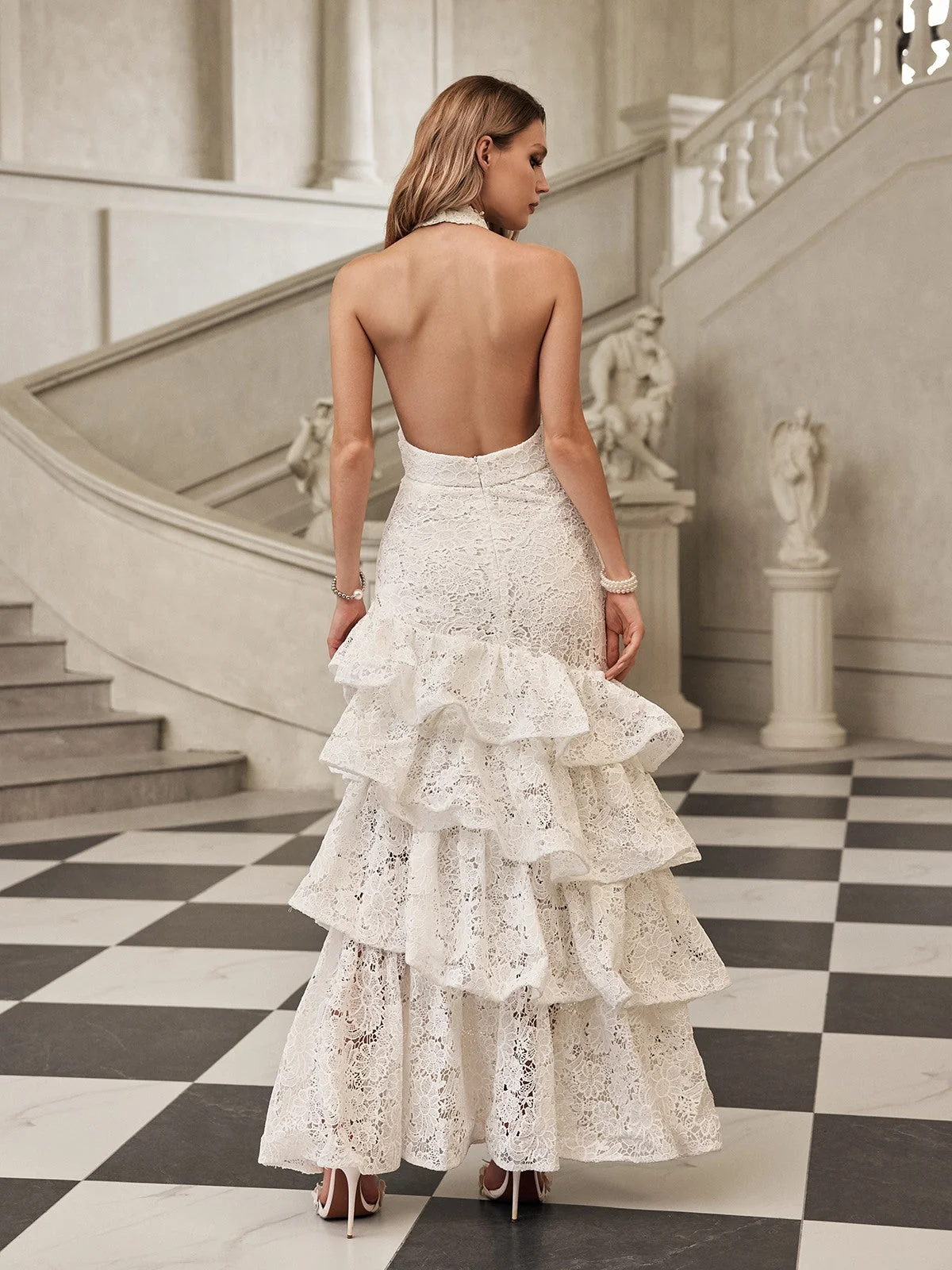 Indulge in elegance with the White Lace Halterneck Ruffle Maxi Dress. The halterneck design accentuates your shoulders, while the tiered ruffles infuse a flirty, feminine essence. Tailored for both comfort and style, this maxi dress drapes gracefully, ideal for summertime gatherings or beach strolls. Embrace a look that effortlessly blends sophistication and charm. Crafted from 100% Polyester with a slight stretch, featuring an invisible zipper at the back. Please note, color variations may occur due to image lighting. Dry clean only. Model wears size S.