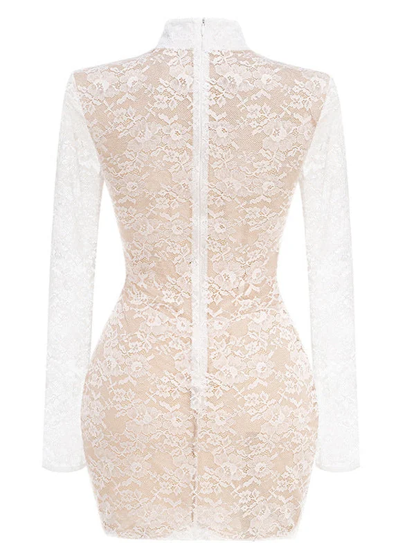 Elevate your style with our White Lace Jacquard Fishbone Bodycon Mini Dress. This dress, crafted from premium lace, offers a flattering fit with a unique fishbone pattern. Perfect for special occasions, it exudes elegance and sophistication, ensuring you stand out effortlessly. The 100% Polyamide fabric ensures durability while adding a touch of luxury. Please note that the color may vary slightly due to lighting effects in images. For the best fit, refer to our size chart as this dress adheres to standard sizing. Avoid sizing up or down for optimal comfort.