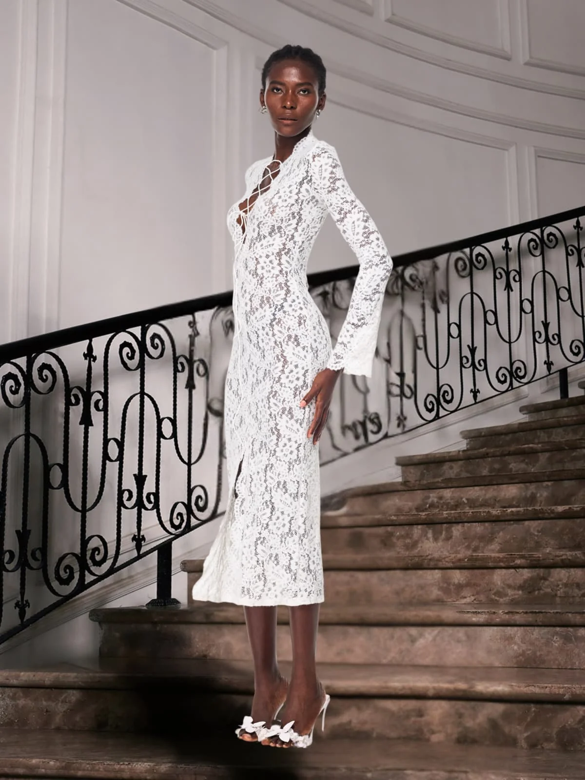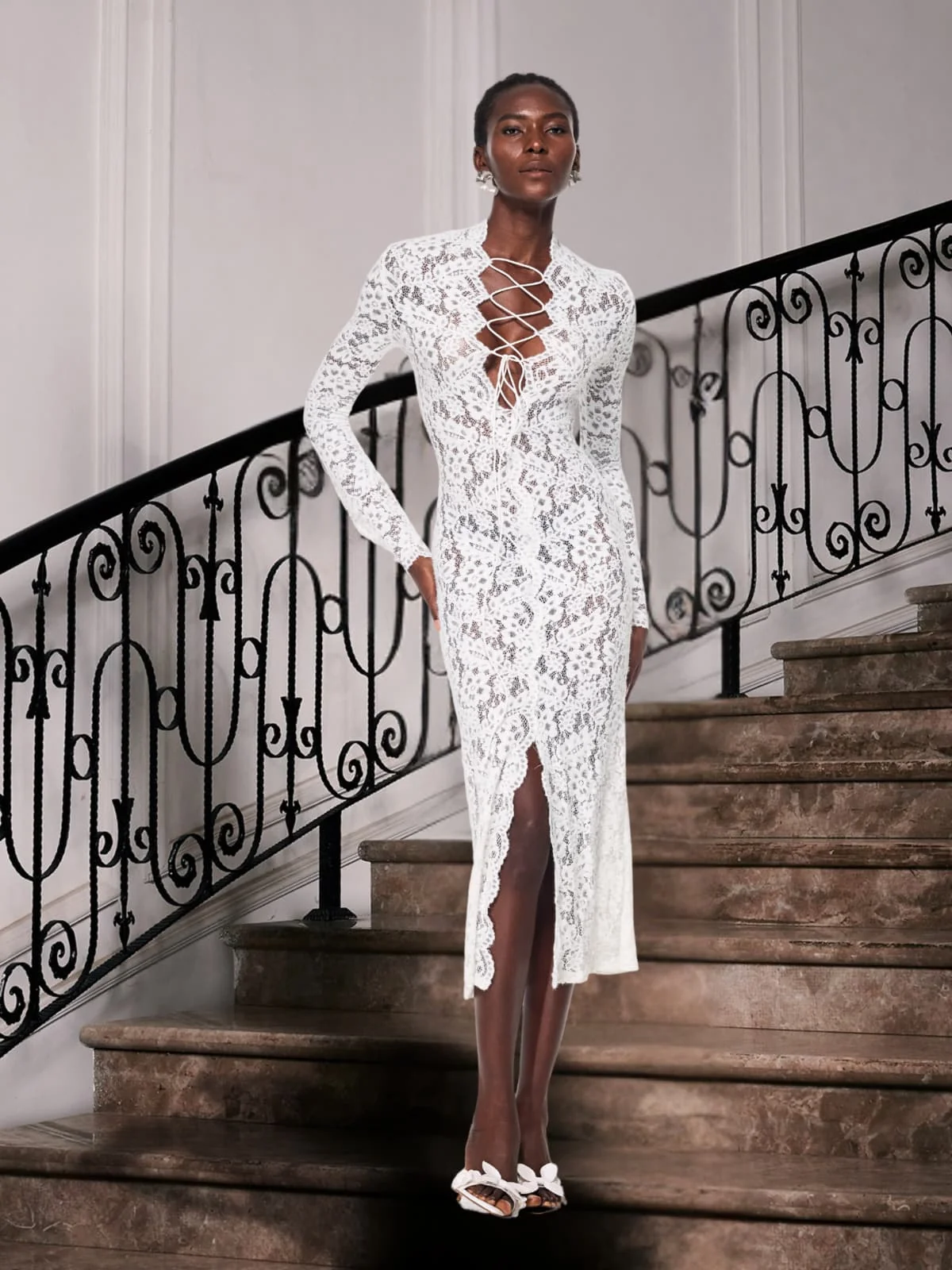 Elevate your style with the White Lace Midi Dress featuring delicate lace detailing and a flattering lace-up design, combining elegance with allure. The midi length and side split create a graceful silhouette ideal for special occasions or evening events. Embrace confidence and sophistication effortlessly in this stunning piece crafted from 100% Polyester. Stretch Factor: Low Stretch. Care Instructions: Dry clean only. Please note, color may vary due to lighting. Model is wearing a size S.