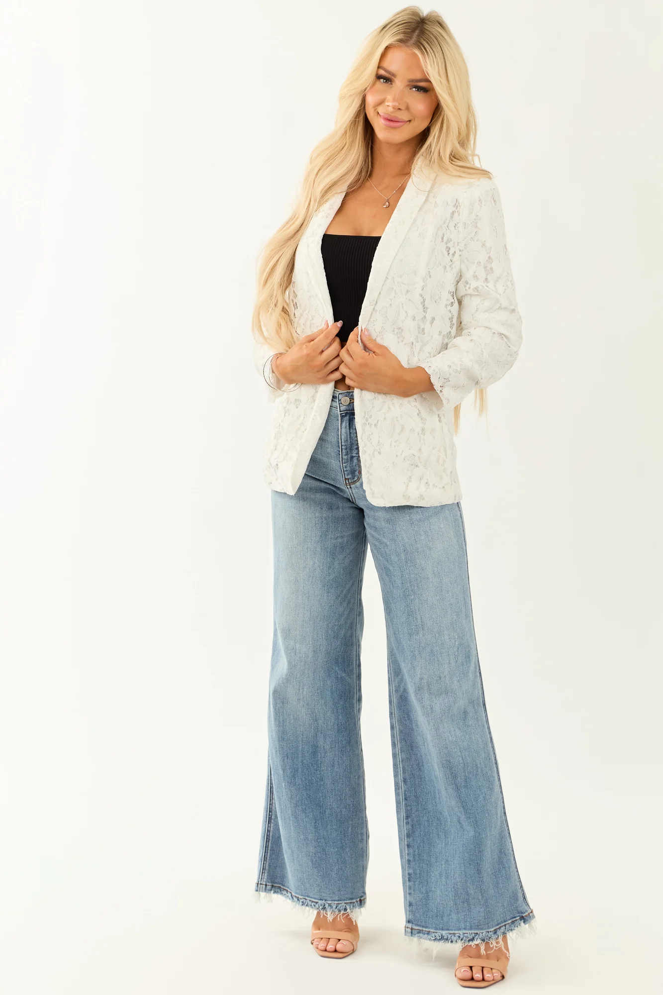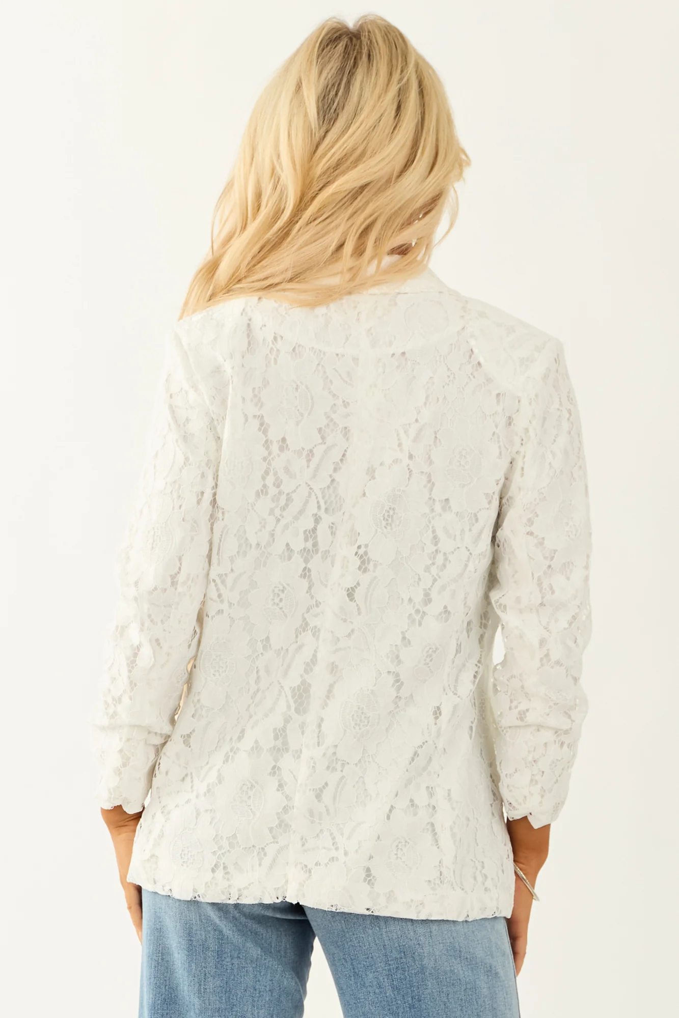 Elevate your look with this sophisticated and elegant lace blazer featuring collared lapels, side pockets, and shoulder pads. The satin lining enhances comfort and style. Perfect for any occasion. Available in sizes S, M, L. Length options: 26″, 27″, 28″. Sleeve length: 22″. Self & Lining: 100% Polyester. Imported. Hand wash cold, do not bleach, line dry, iron on low heat. Model is wearing a size Small. Model’s Profile: Size 1, Height 57″, Bust 34″, Waist 26″.