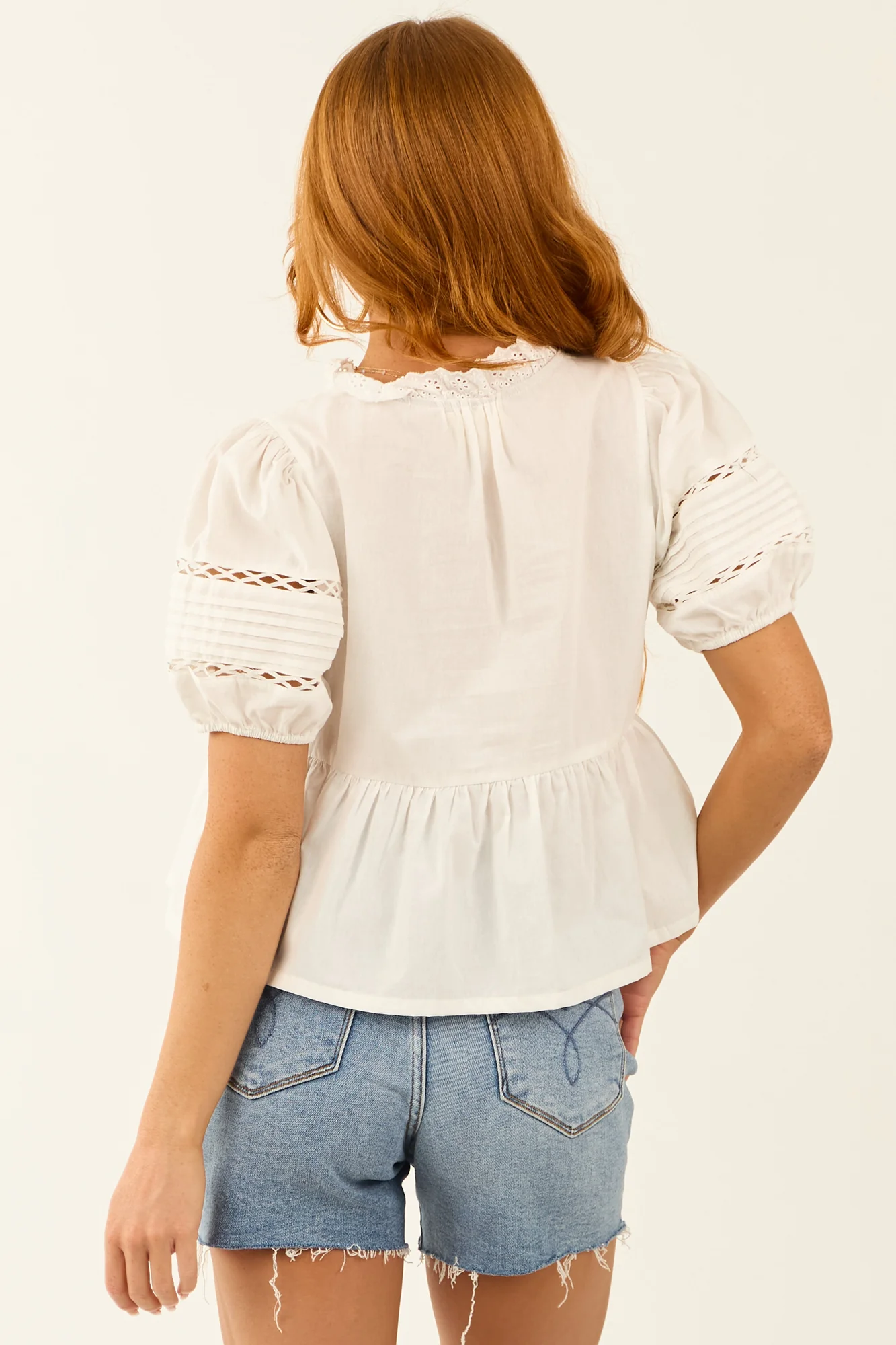 Elevate your style with this White Lace Peplum Blouse featuring a charming lace detail, ruffle trim, V neckline, dart seams, and elastic cuffs. Made from non-stretchy woven cotton, this blouse exudes elegance and sophistication. The flattering peplum silhouette adds a feminine touch to any outfit. Available in sizes S, M, and L. Hand wash cold, line dry.