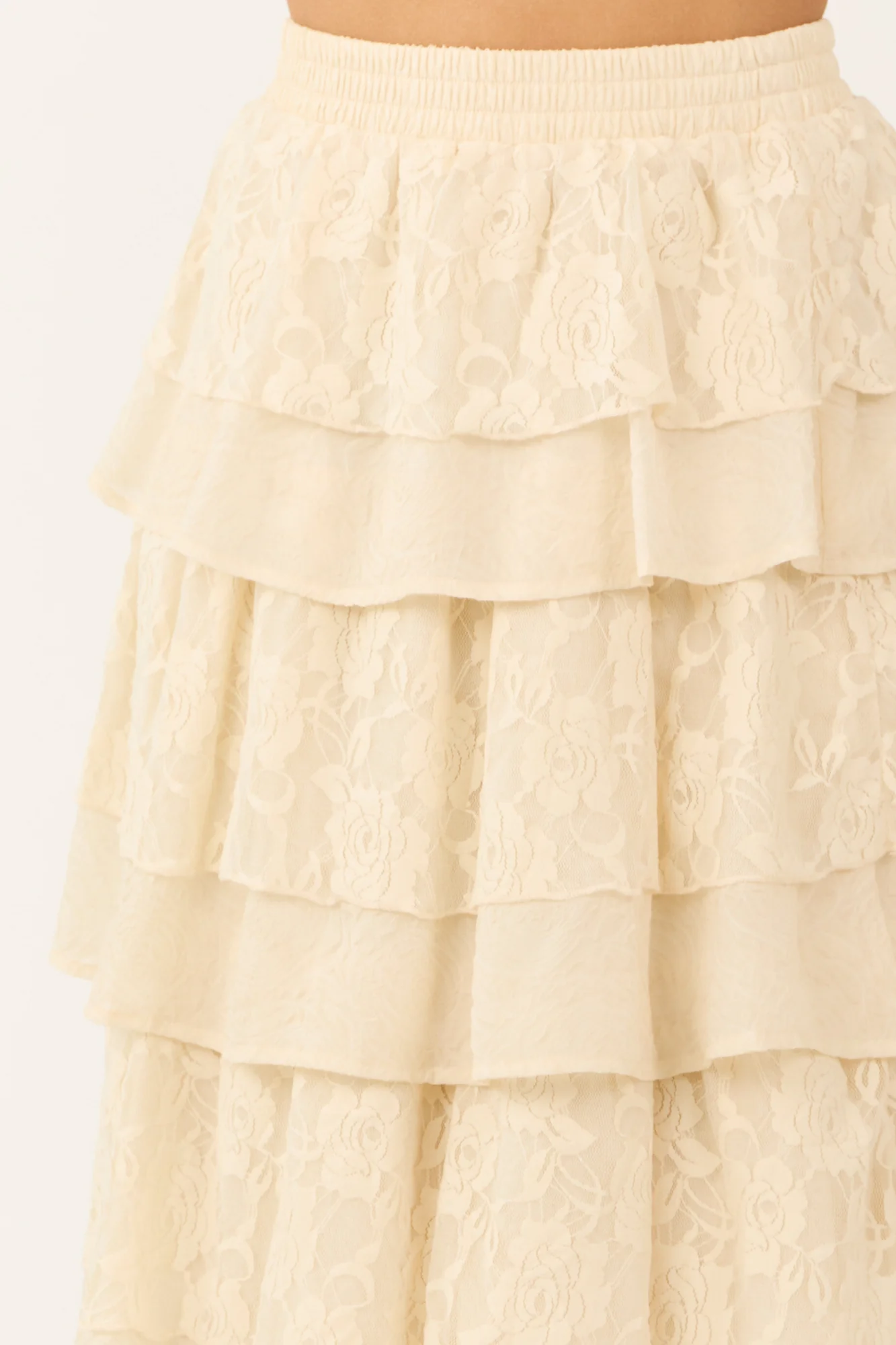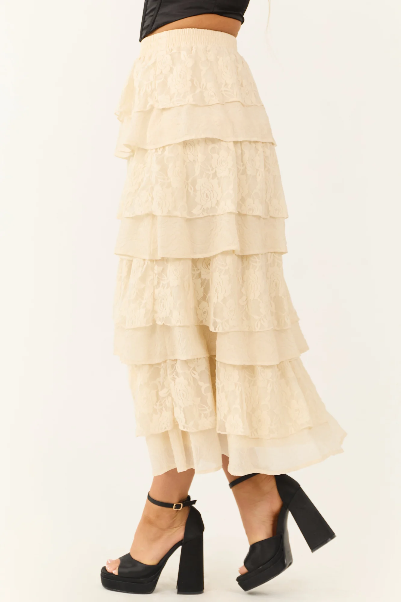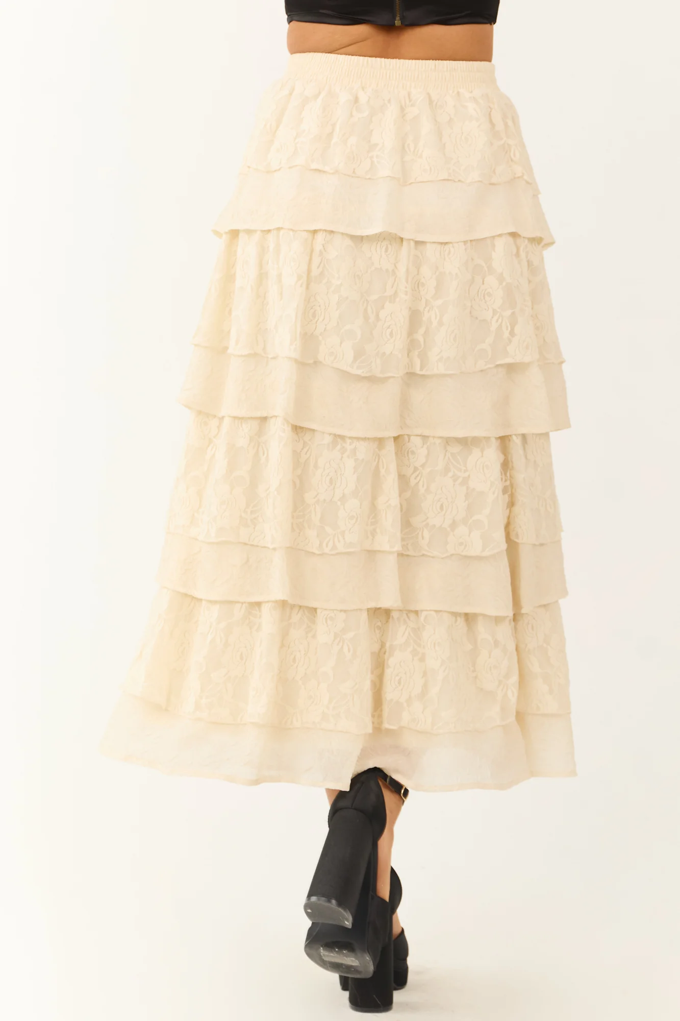 Embrace elegance with our White Lace Ruffle Maxi Skirt featuring stretchy lace knit, tiered ruffling, and floral jacquard detailing. The elastic waistband offers comfort and adjustability for sizes S, M, and L. Perfect for daytime winter looks, this skirt is lined for a flawless finish. Made of 100% Polyester for quality that lasts. Hand wash cold, no bleach, line dry, iron on low. Model height 57″, wearing size Small.