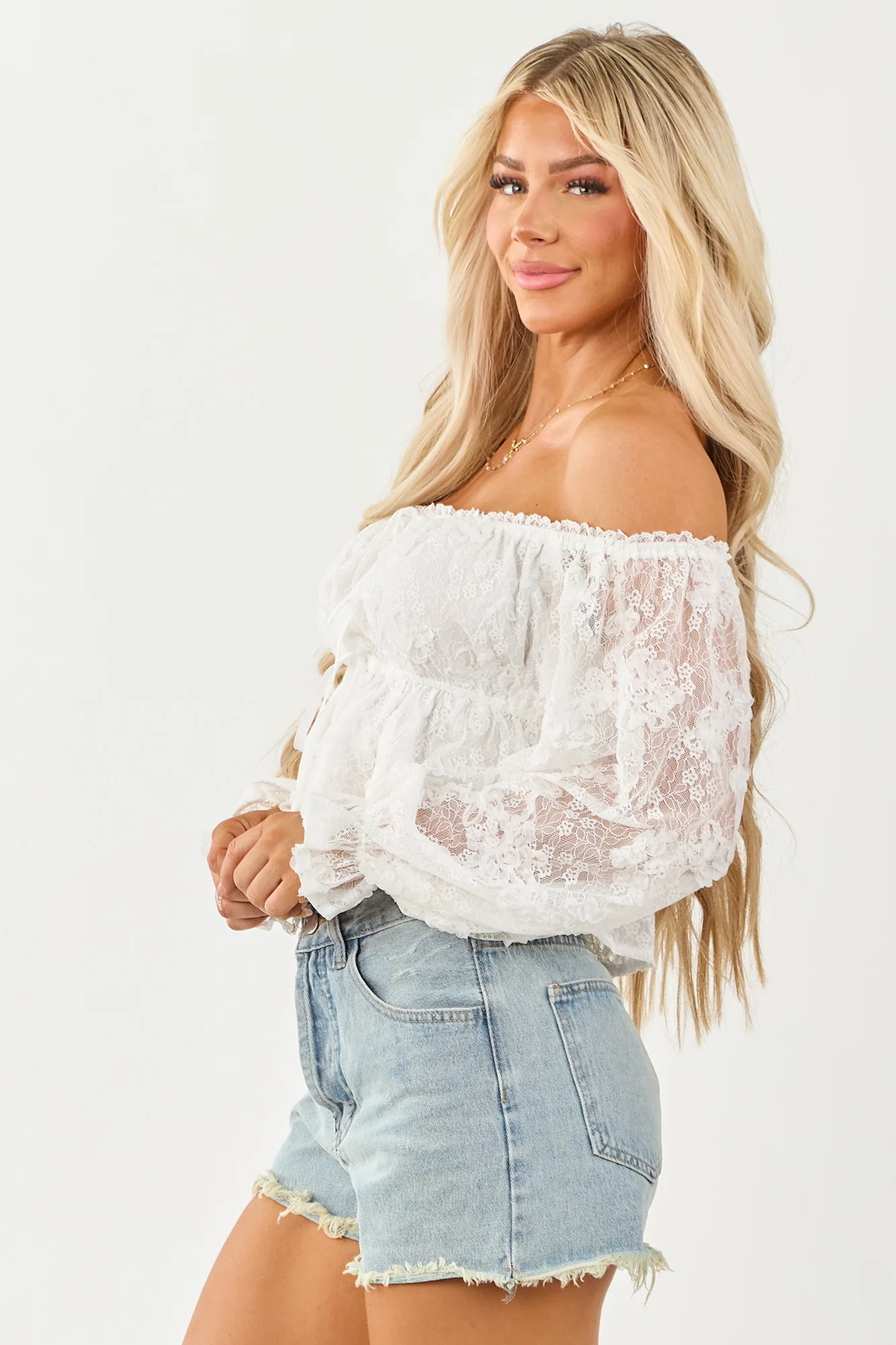 Elevate your look with our exquisite White Lace Sleeve Babydoll Crop Top. Crafted with delicate lace mesh for a touch of cottagecore charm, this top features an elastic neckline, waistband, and cuffs for a comfortable fit, sheer sleeves for an elegant appeal, front tie detail, and a lined torso. Perfect for stealing the show, whether you pair it with jeans for a casual vibe or a skirt for a more dressed-up ensemble. Embrace the versatility and charm of this 3D lace crop top today!