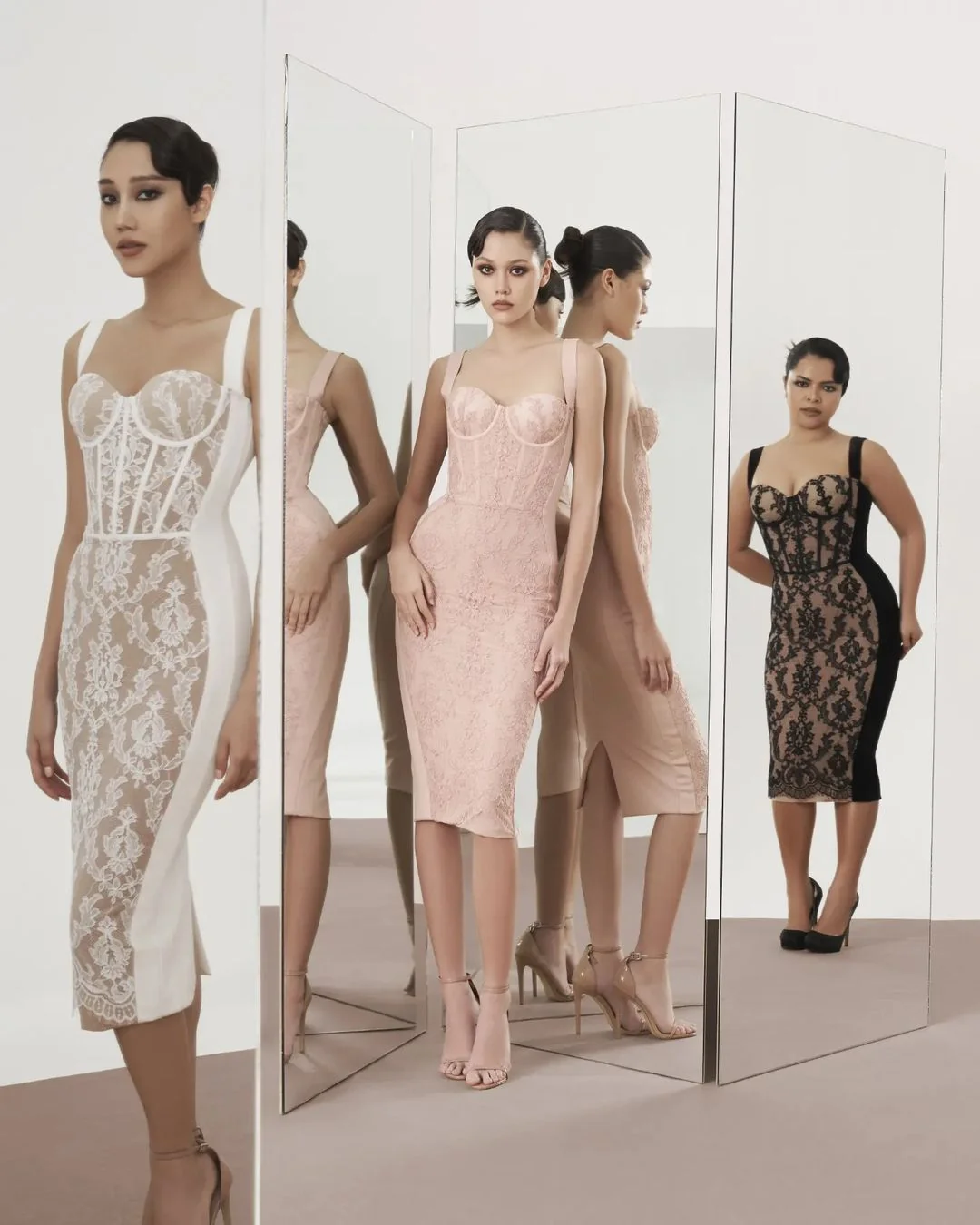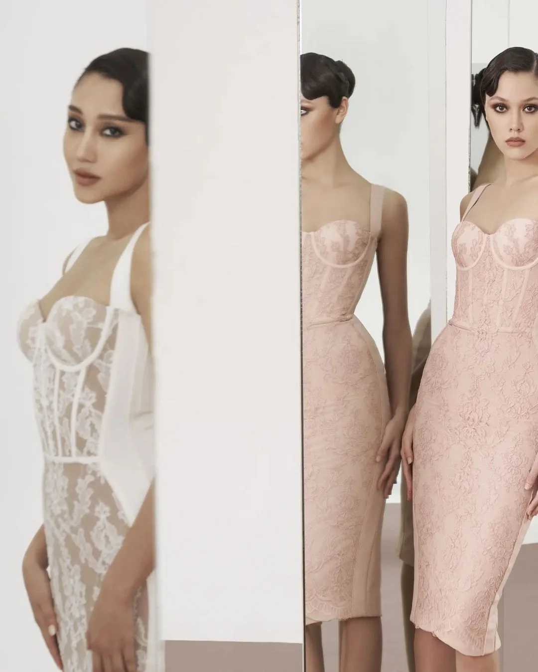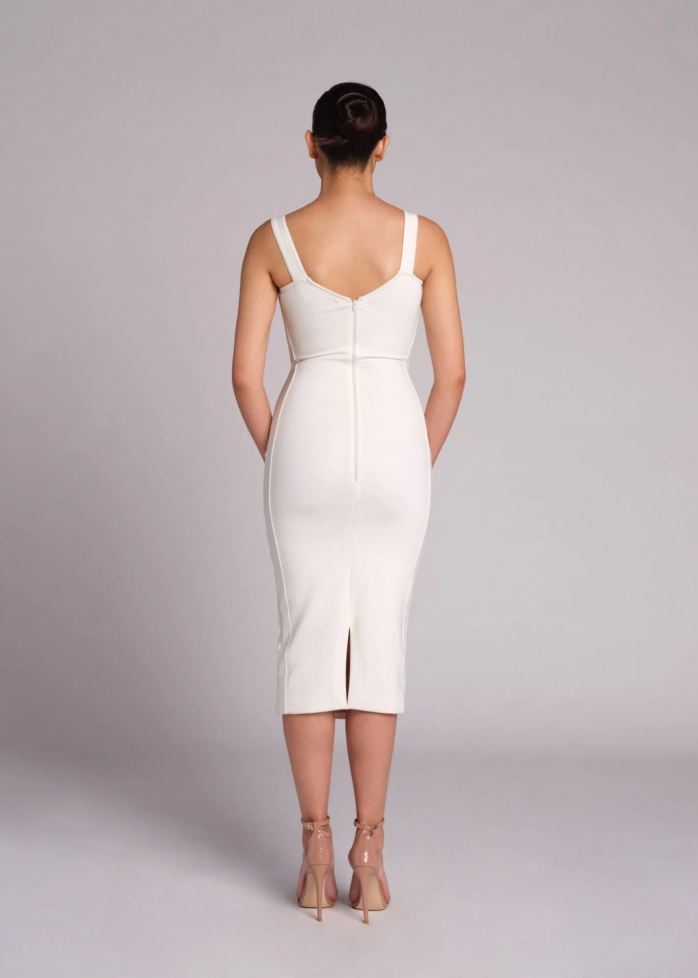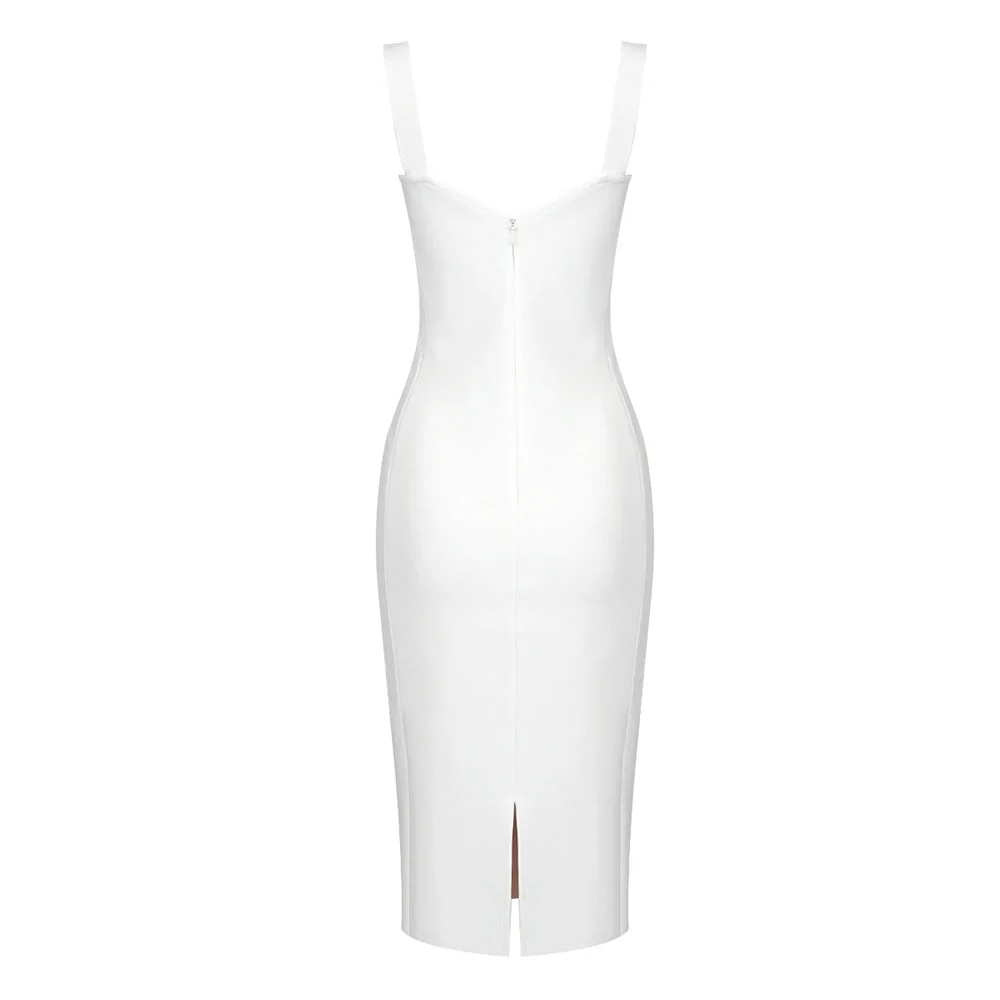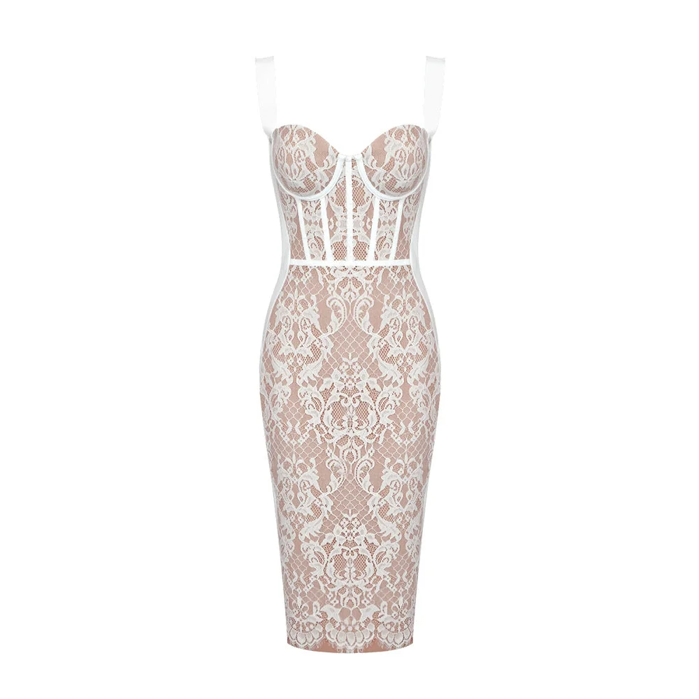 Indulge in the timeless elegance of our White Lace Strap Midi Dress. Crafted with a patchwork lace bodice and bandage design for a flattering A-line silhouette. This exquisite dress offers high stretch comfort and an invisible zipper at the back. Perfect for special occasions. Material: Bandage (95% Polyester, 5% Spandex). Gentle machine wash recommended. Variations: XS, S, M, L.