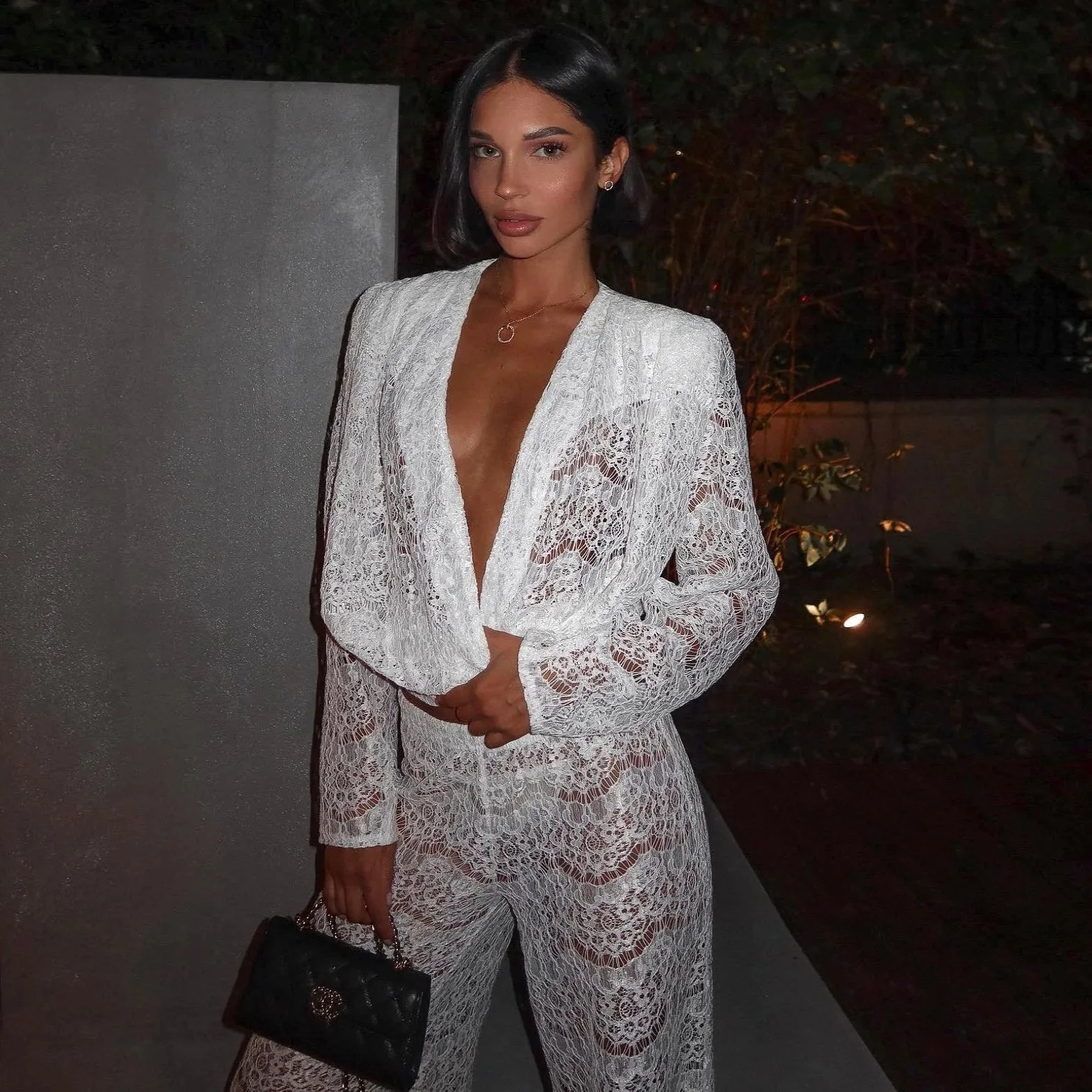Elevate your style with this White Lace Two-Piece Set, featuring a wrap-style top with a deep V-neckline, structured shoulders, and a cinched waist for a flattering silhouette. The set also includes wide-leg lace pants that elongate the frame with delicate floral patterns for a sophisticated and ethereal look. Perfect for evening events, special occasions, or upscale resort wear. Add your touch for a striking finish!