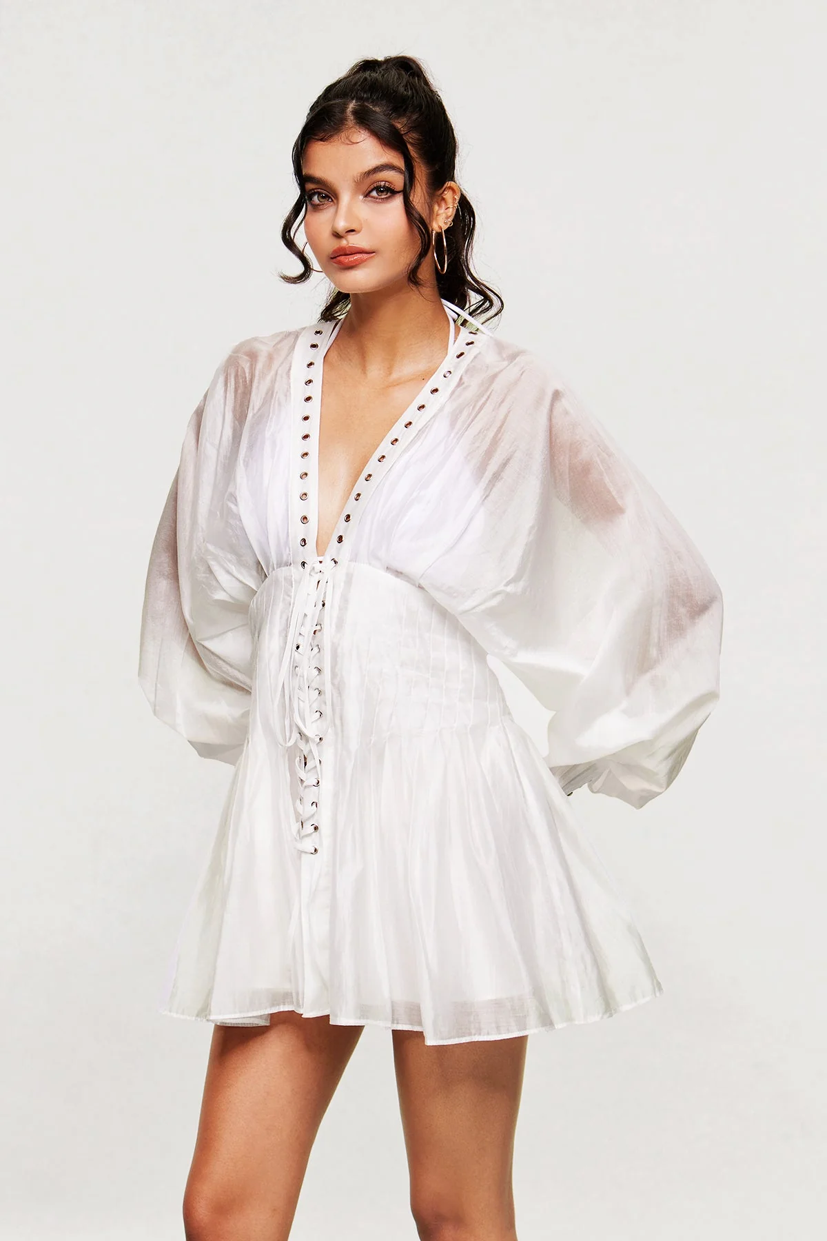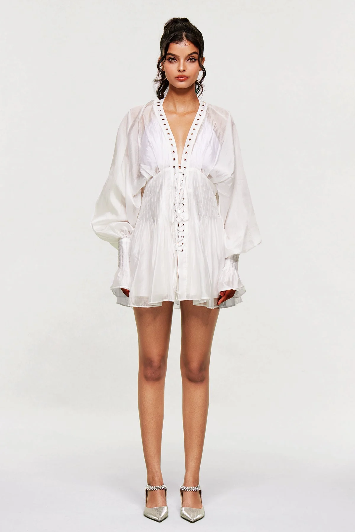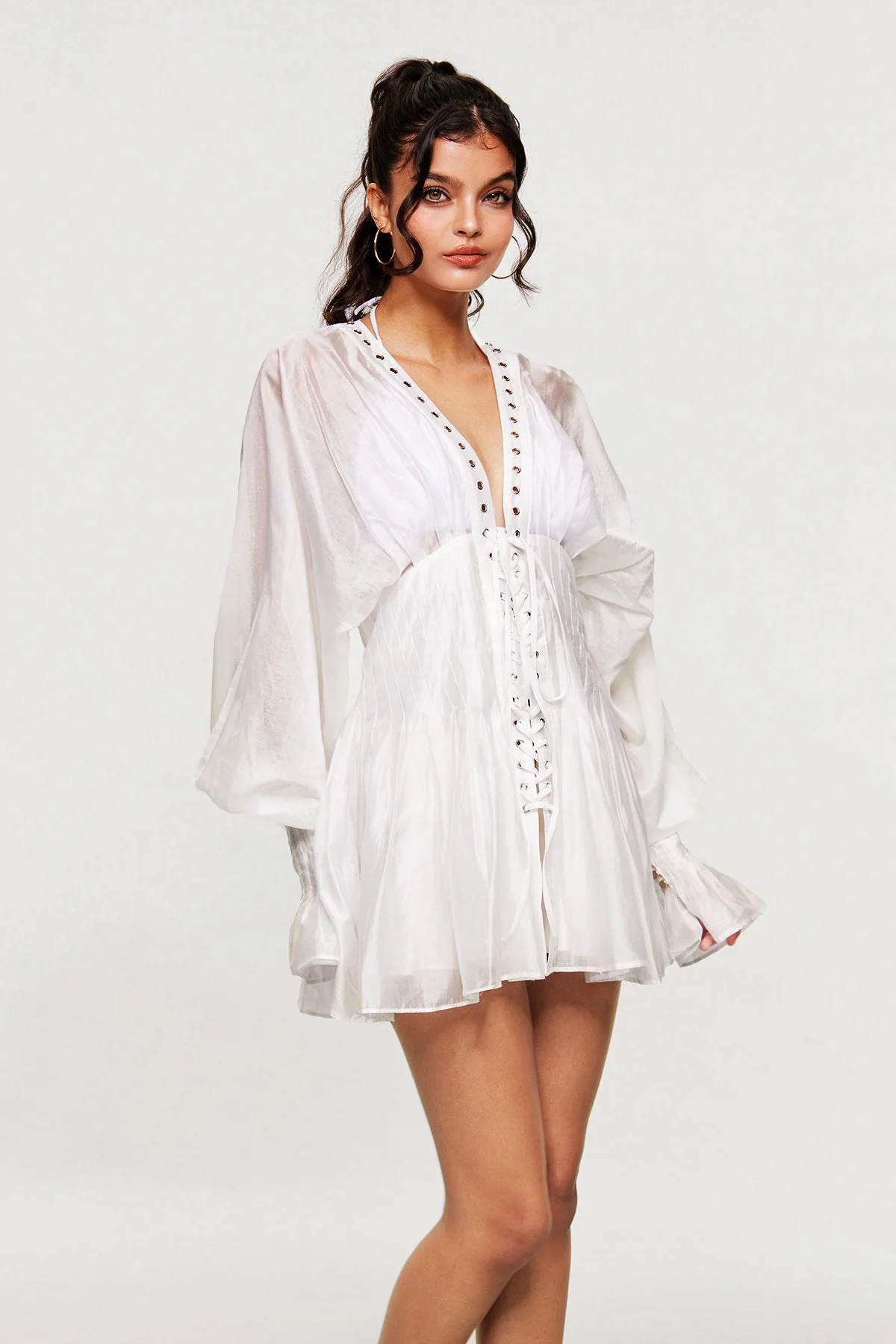 Elevate your style with the elegant White Lace-Up Mini Dress featuring voluminous balloon sleeves and a flattering lace-up front. This dress offers a sophisticated silhouette that enhances your natural shape and ensures comfort at any event. The blend of refined charm and modern flair makes it a chic essential for your wardrobe. Color variations may occur due to lighting. Enjoy the non-stretch fabric with gentle machine wash care. Add this boho-inspired piece to your wardrobe for a timeless and versatile look.