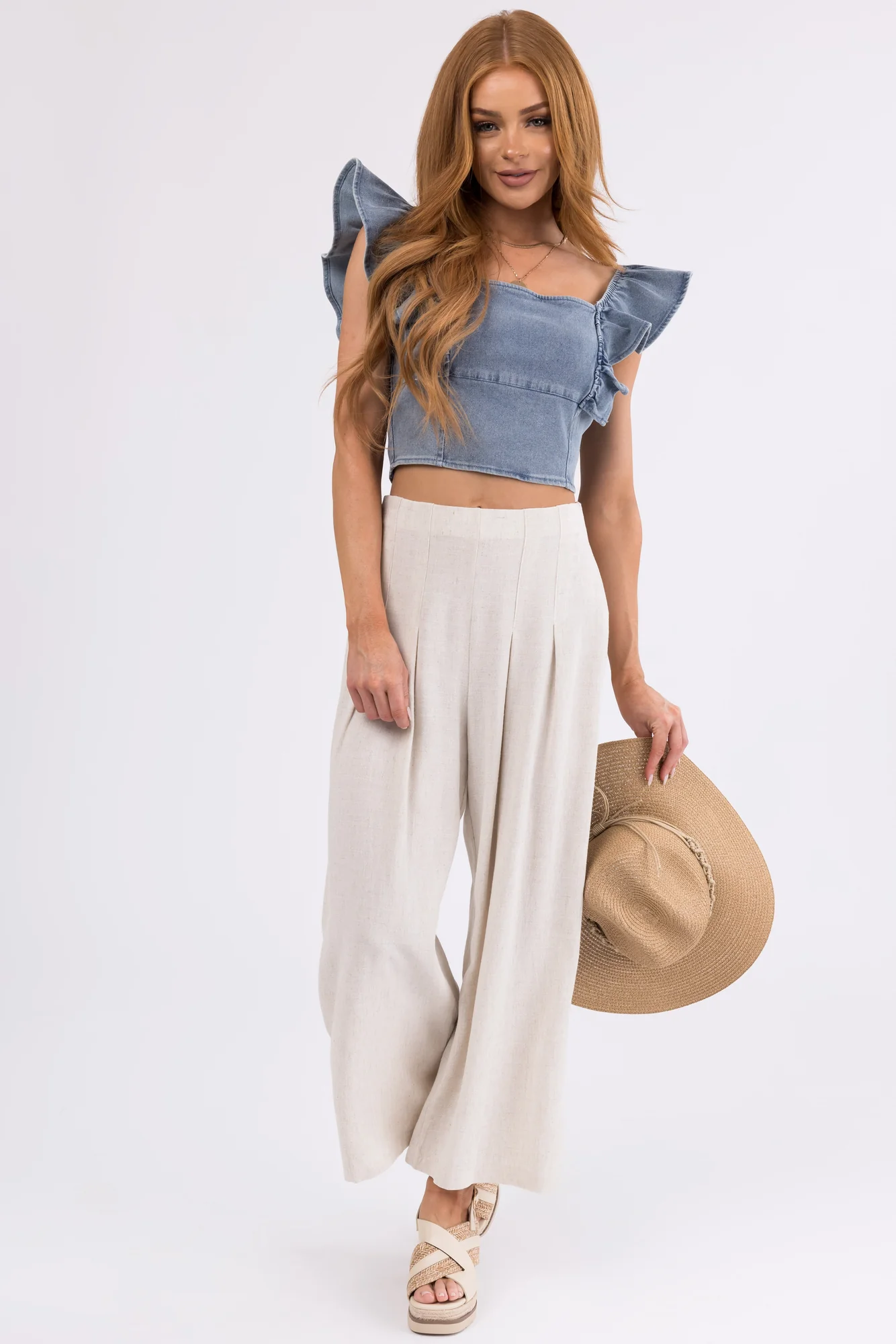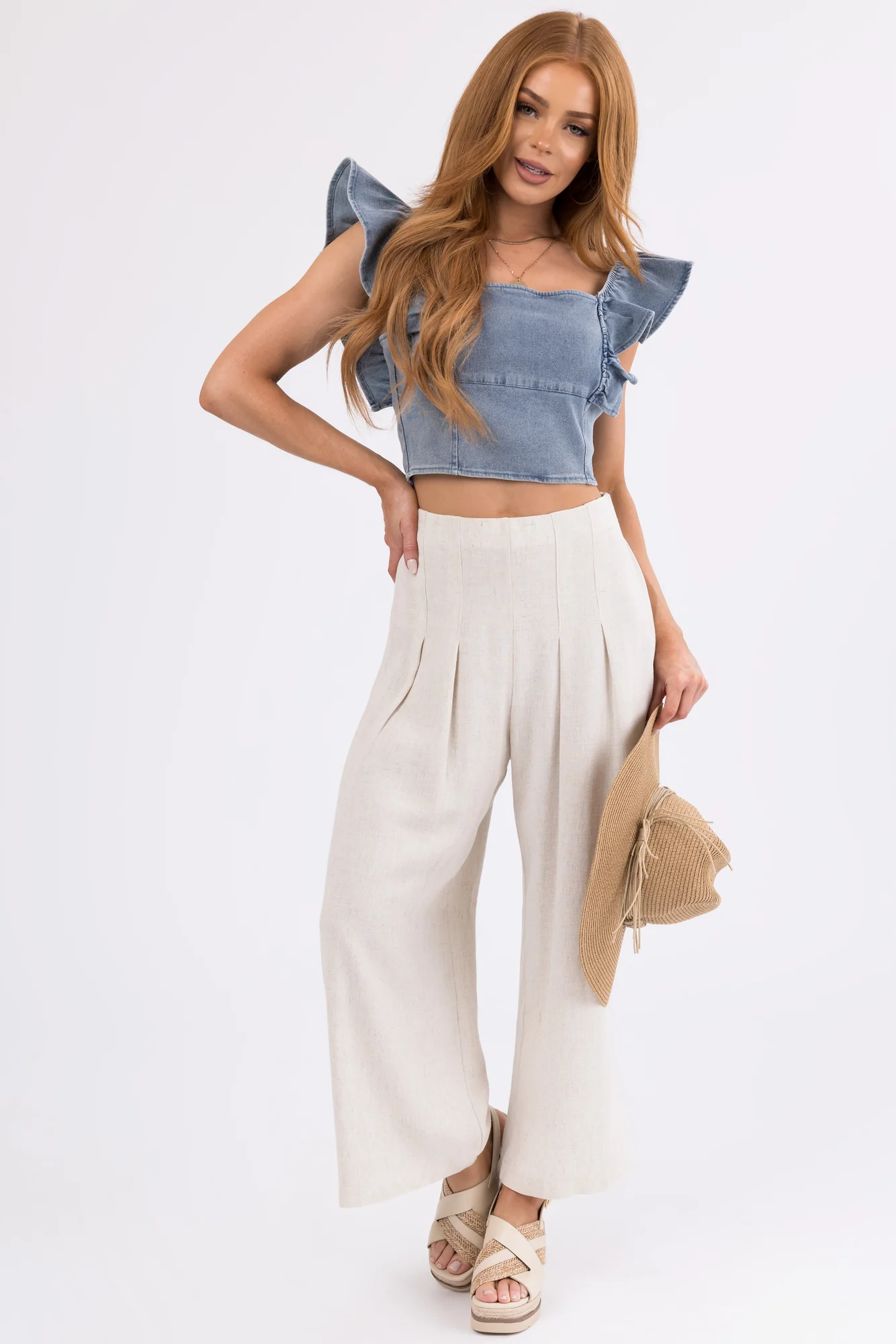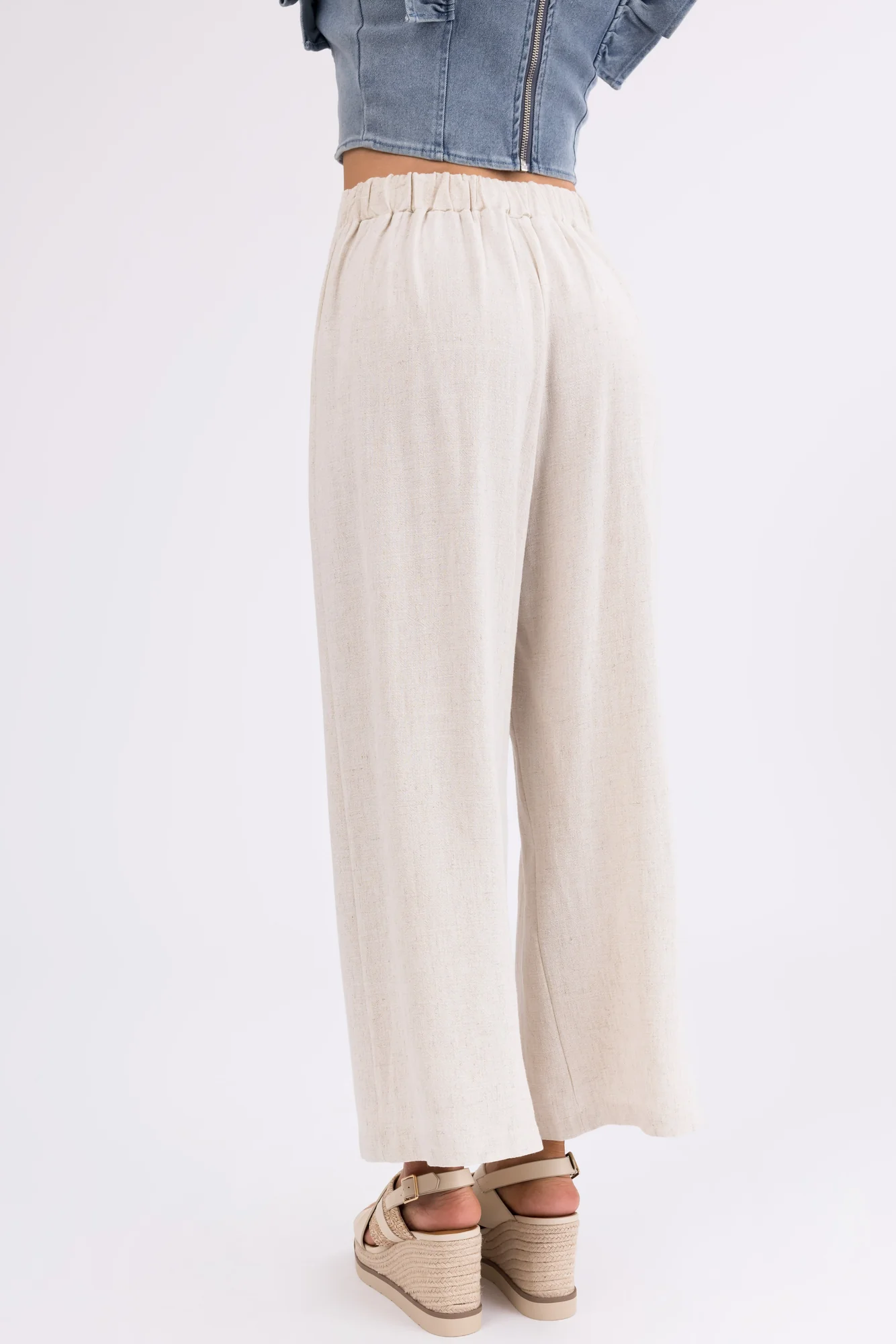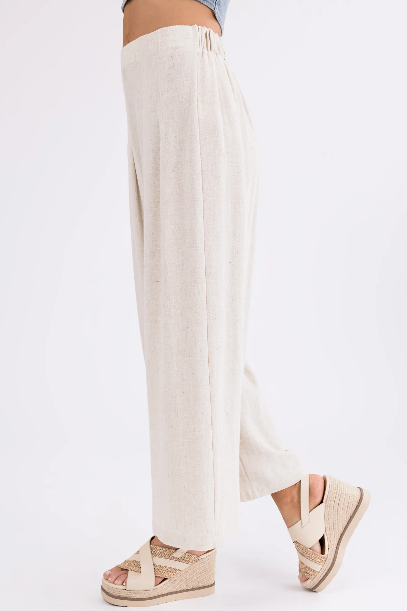 Crafted in the USA, these palazzo pants feature a non-stretchy linen blend for a comfortable fit. The elastic high waistband provides extra room. The wide-leg design offers a trendy look perfect for casual or daytime wear. Machine washable. Model is 55″ and wears size Small.