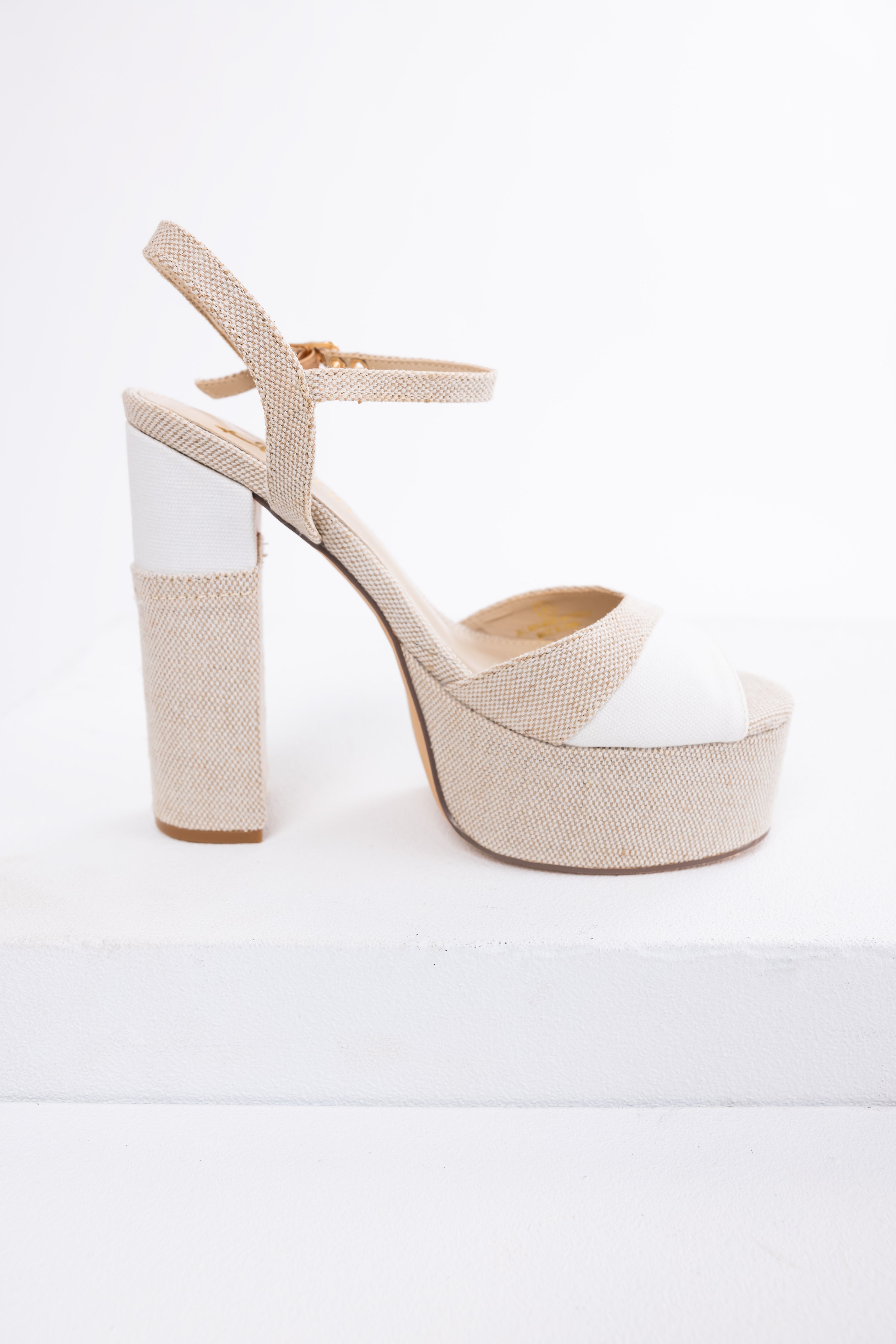 Step into style with these white linen patchwork high heel sandals featuring a peep toe, adjustable buckle ankle strap, block high heel, slightly cushioned insole, and a heel height of 5.5 inches with a 1.75-inch platform. The shaft measures 4 inches. Elevate your outfits effortlessly with these chic heels. Available in sizes 6-10.