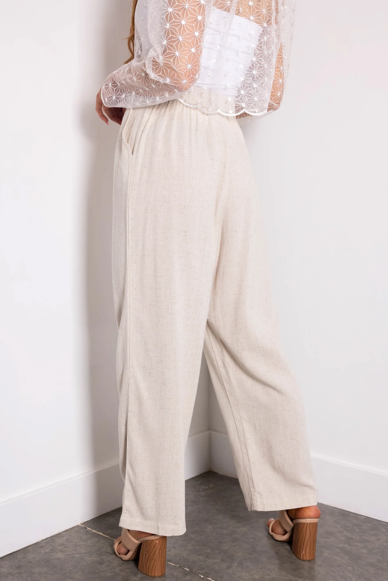 Experience comfort and style with our White Linen Straight Leg Pants. These non-stretchy woven pants feature an elastic back waist, zipper fly, hidden hook and button closure, pockets, belt loops, and are unlined for a breathable feel. Imported and crafted from 85% Viscose and 15% Linen. Care instructions: Hand wash cold, iron on low heat, do not bleach, line dry. Model is wearing a size Small. Model stats: Size 1, Height 55″, Bust 31″, Waist 24″.