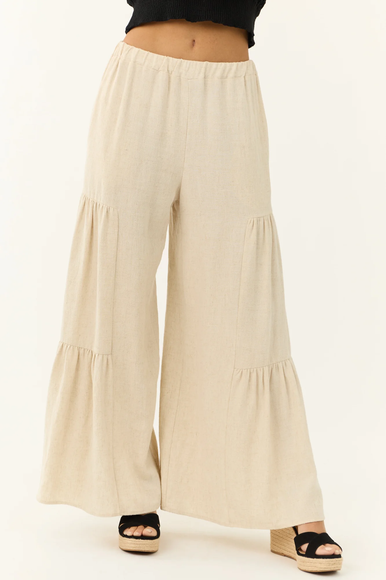 Achieve effortless style with our White Linen Tiered Ruffle Pants. Made in the USA, these non-stretchy linen woven pants feature a high waisted design with an elastic waistband for added comfort and flexibility. The tiered ruffle details and side pockets add a touch of flair to this versatile piece. Crafted from 75% Rayon and 25% Linen, these pants are perfect for casual, daytime wear. Care instructions: Machine wash cold, lay flat to dry, low heat iron if needed. Model is wearing a size Small. Available in sizes S, M, and L.