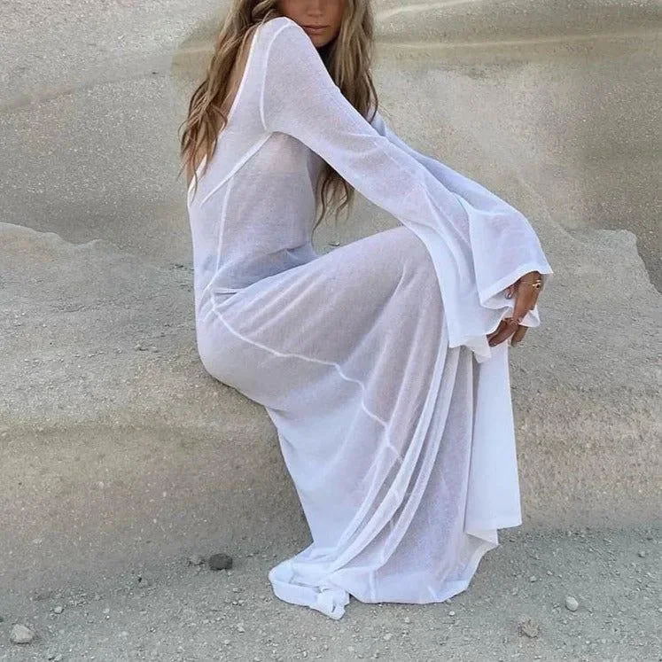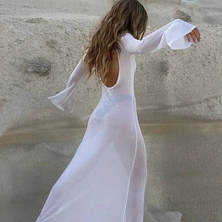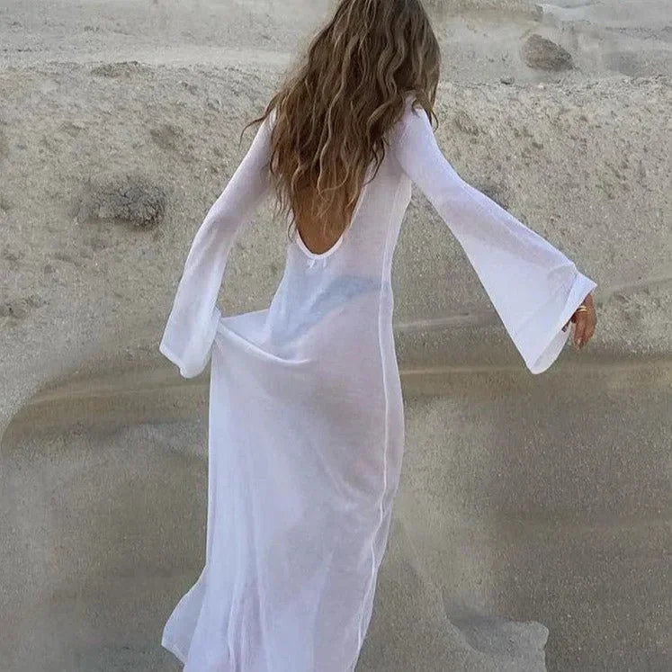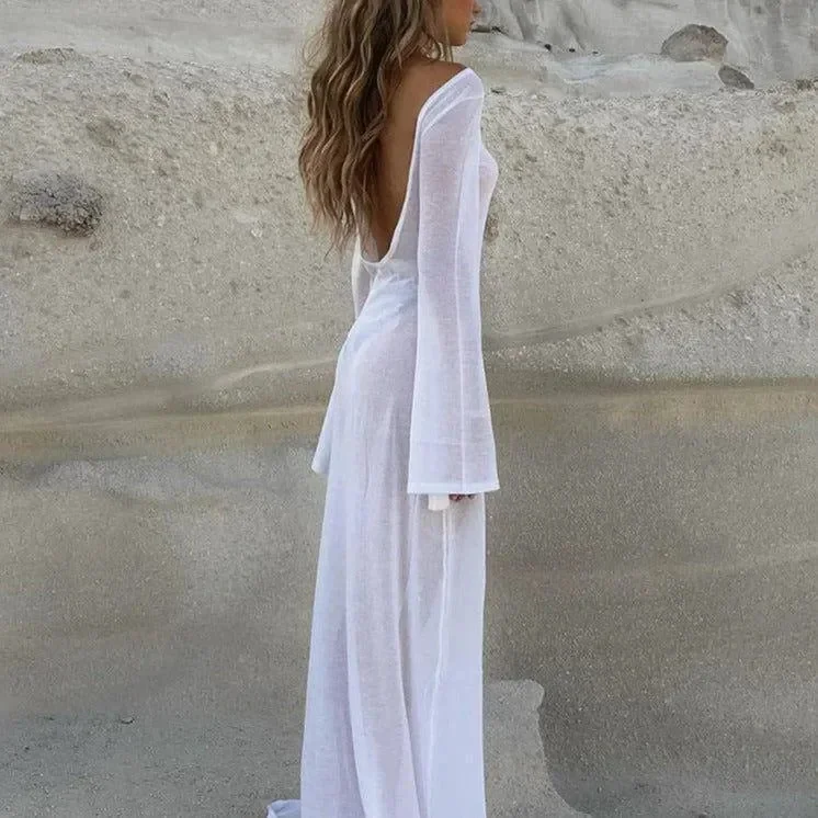 Elevate your beach style with our White Long Sleeve Beach Cover-Up Dress. This chic dress is crafted from a lightweight, breathable fabric, ideal for warm days by the shore. The long sleeves provide sun protection and add an elegant touch to your swimwear ensemble. With a relaxed fit, it ensures comfort and easy movement, perfect for lounging or strolling along the beach. Enjoy the perfect blend of chic design, comfort, and sun protection. Explore more style ideas on Instagram @mermaid_way. MATERIAL: Cotton, Polyester